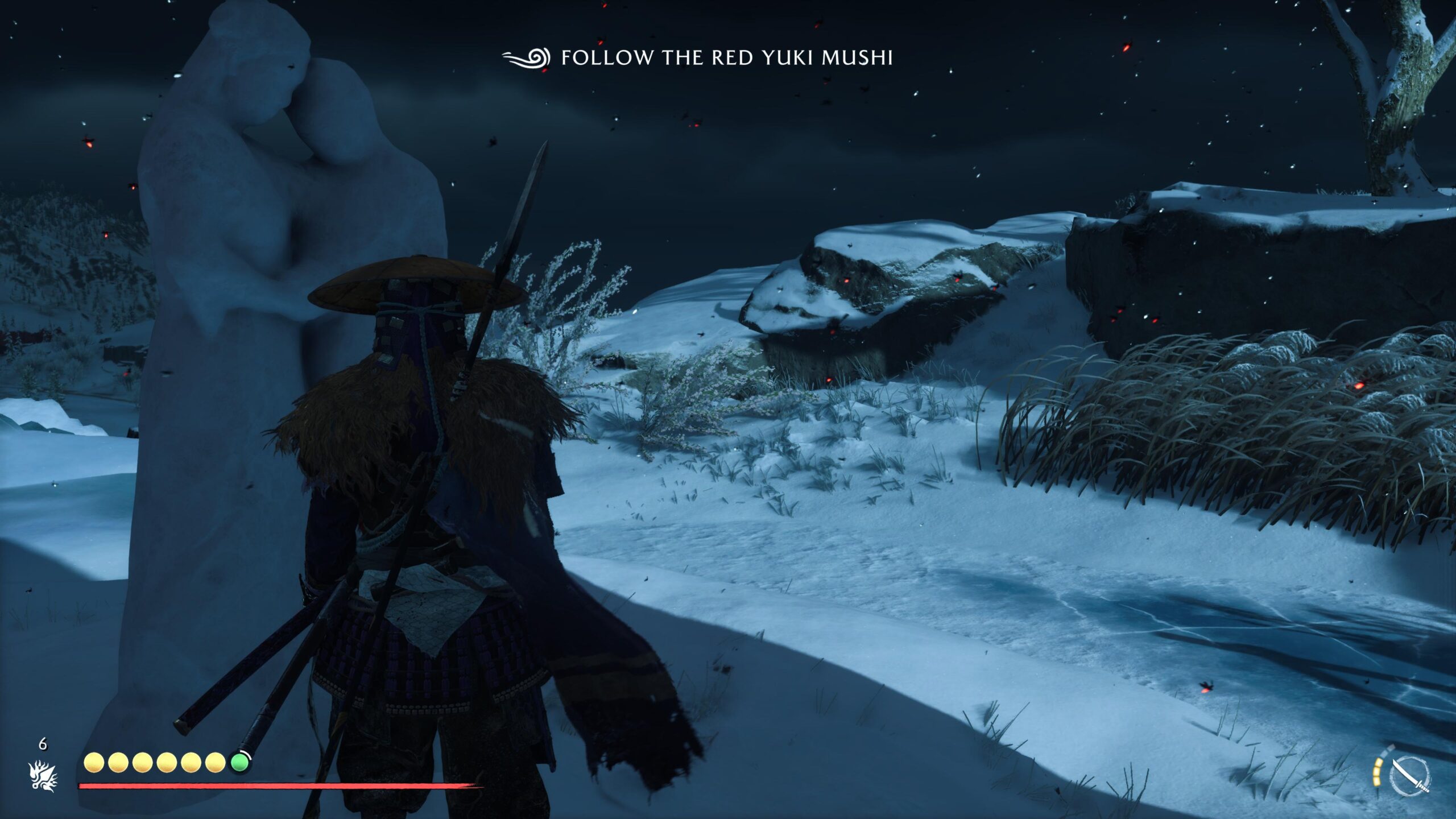 Head back outside and finish building the final snow sculpture outside. The red Yuki Mushi will appear for the last time and guide you to a burial site.