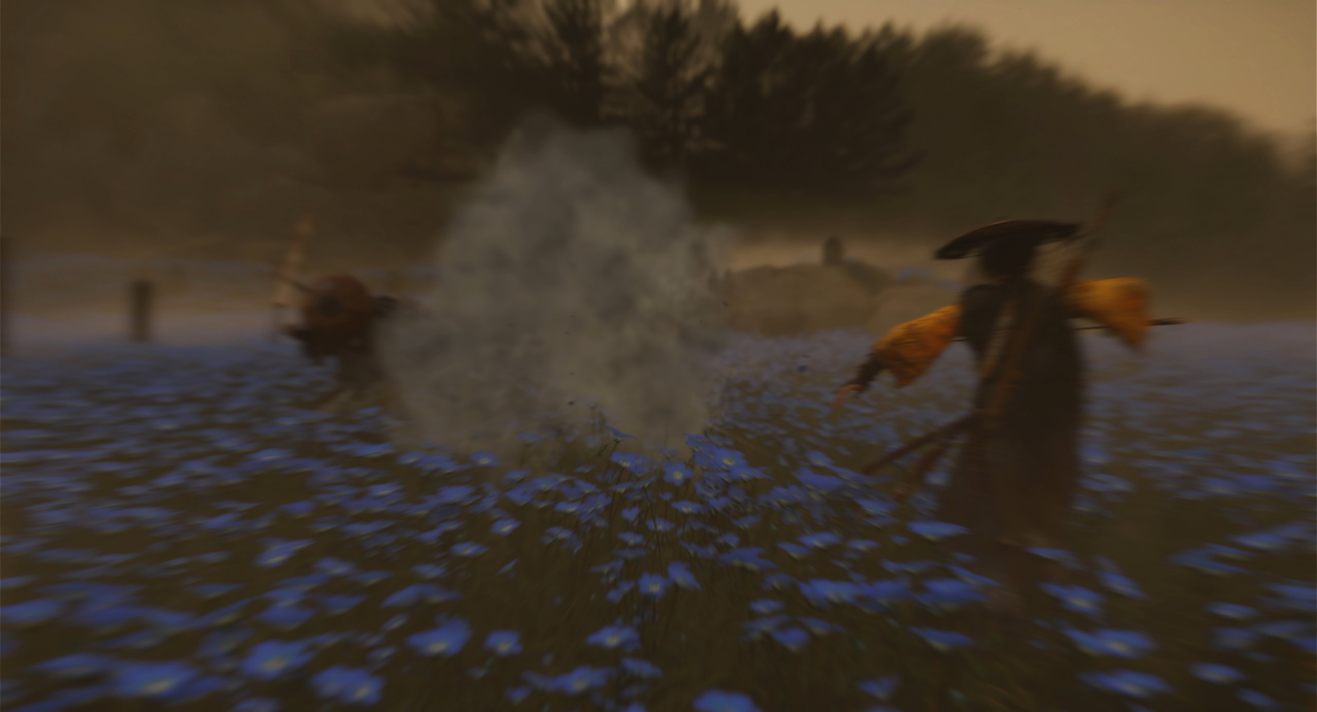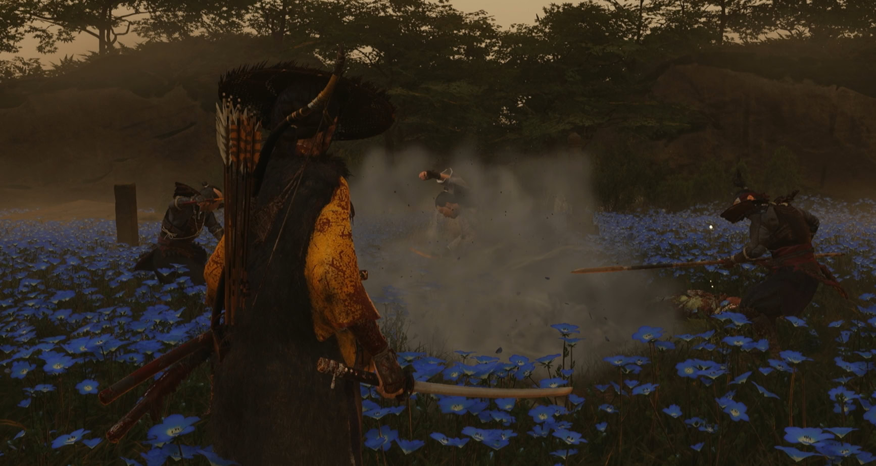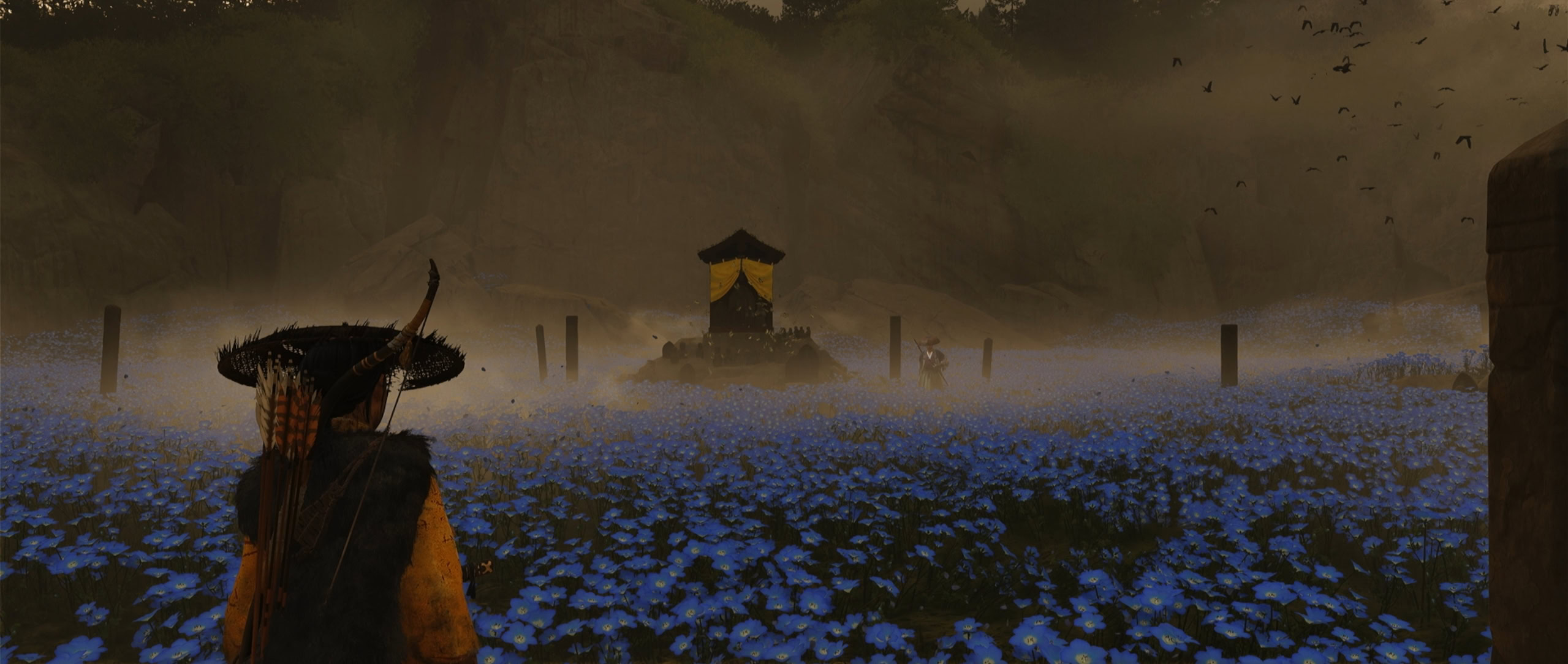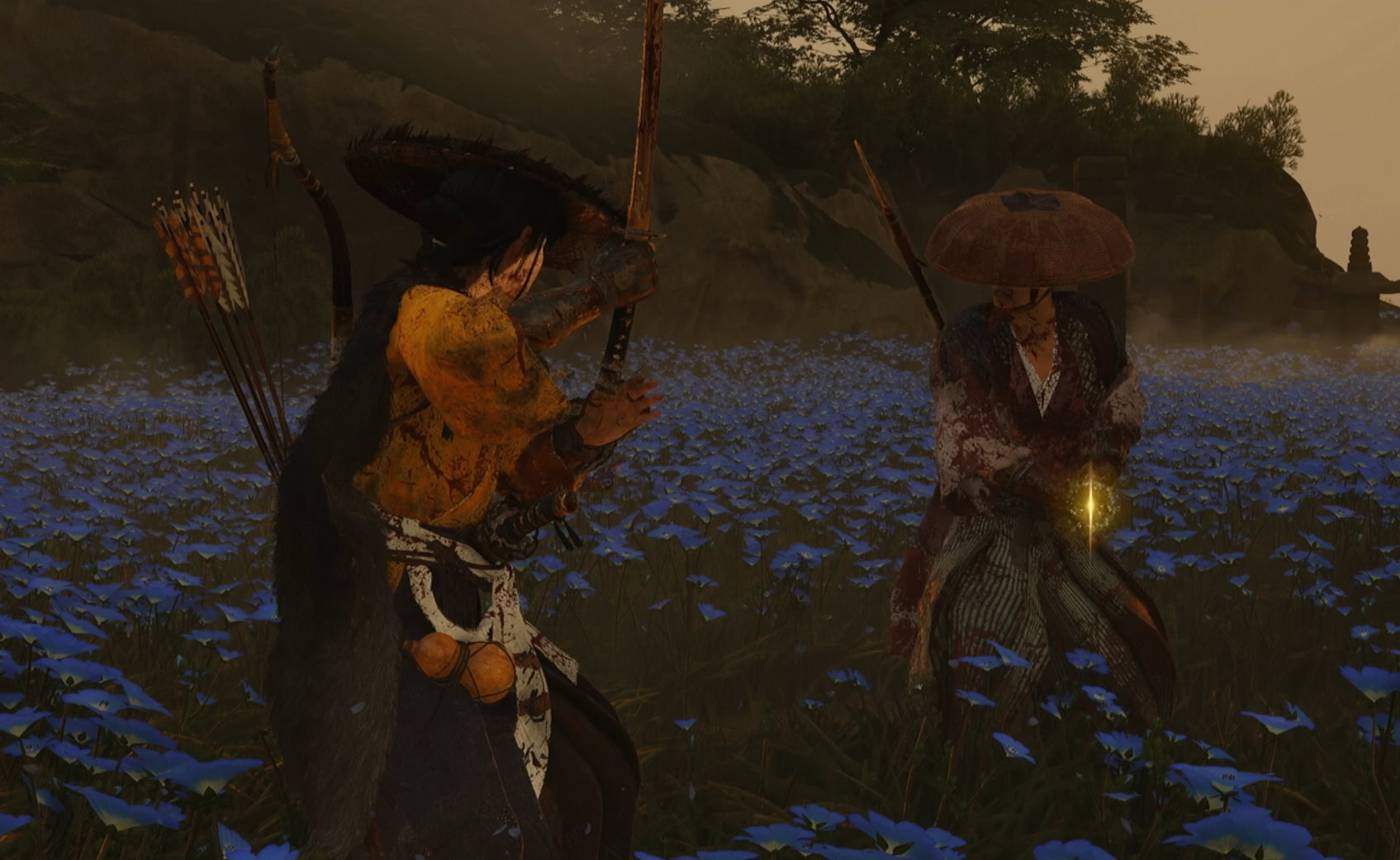 A ronin will appear as he’s also here for the bounty. Defeat him and go up the stairs to find a shrine surrounded by blue flowers. Here you’ll find Crow Genzo, and this either ends with his death or yours.