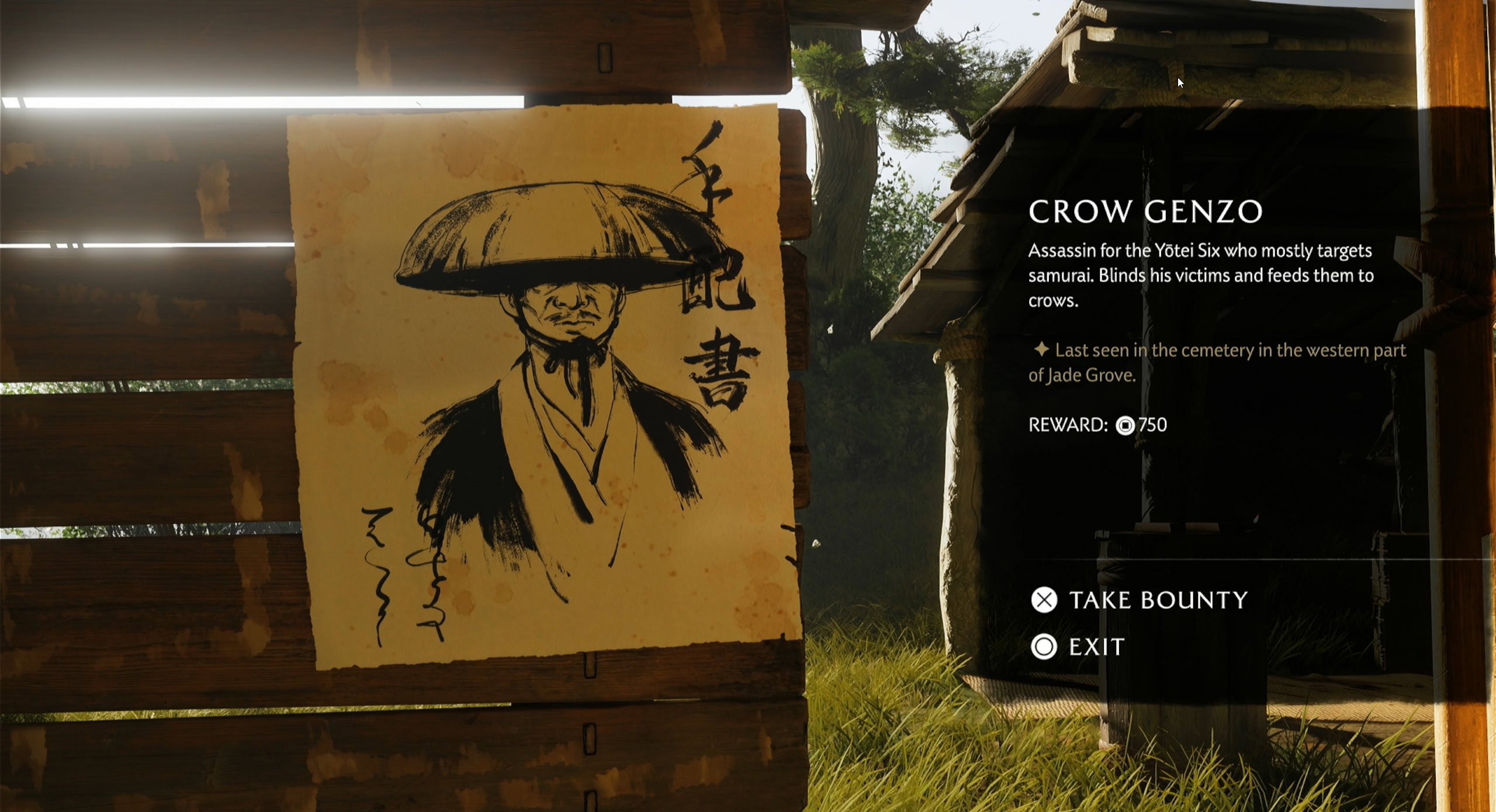 After clearing the Old Inn in the Yotei Grasslands, you’ll access various vendors and the bounty board. Look at the bounty board to find a poster of a man named Crow Genzo, and take the bounty.