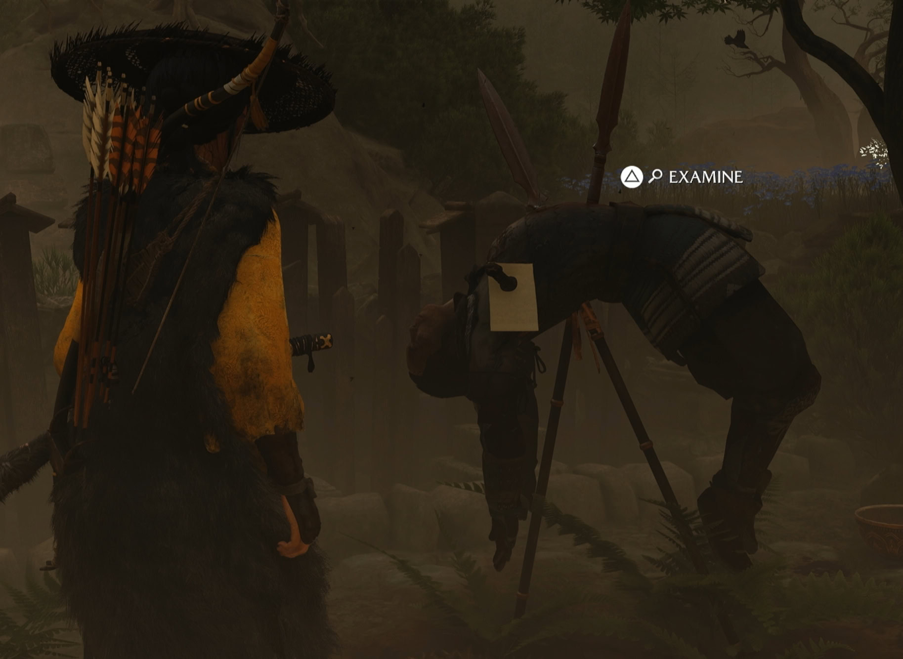 At the gate you’ll find a dead samurai, and you’ll find another impaled on two spears further ahead. Investigate the notes on the dead samurai.