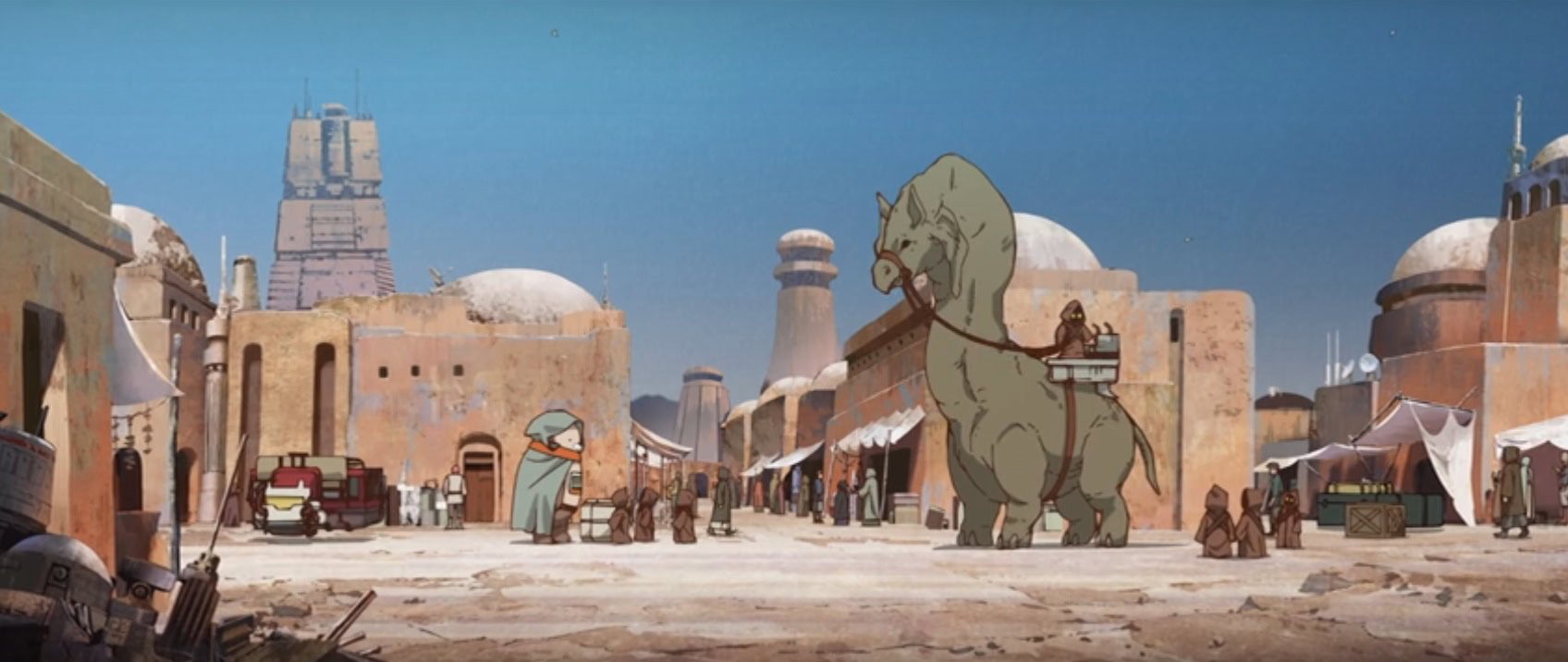 The Smuggler is almost the same plot as A New Hope. A smuggler in need of a good-paying job stumbles upon an actual member of royalty who needs safe passage. With the exception that here, it’s the Jedi who is in charge of protecting the prince. The story is a bit generic, but thankfully, it’s the animation style that stands out for me.