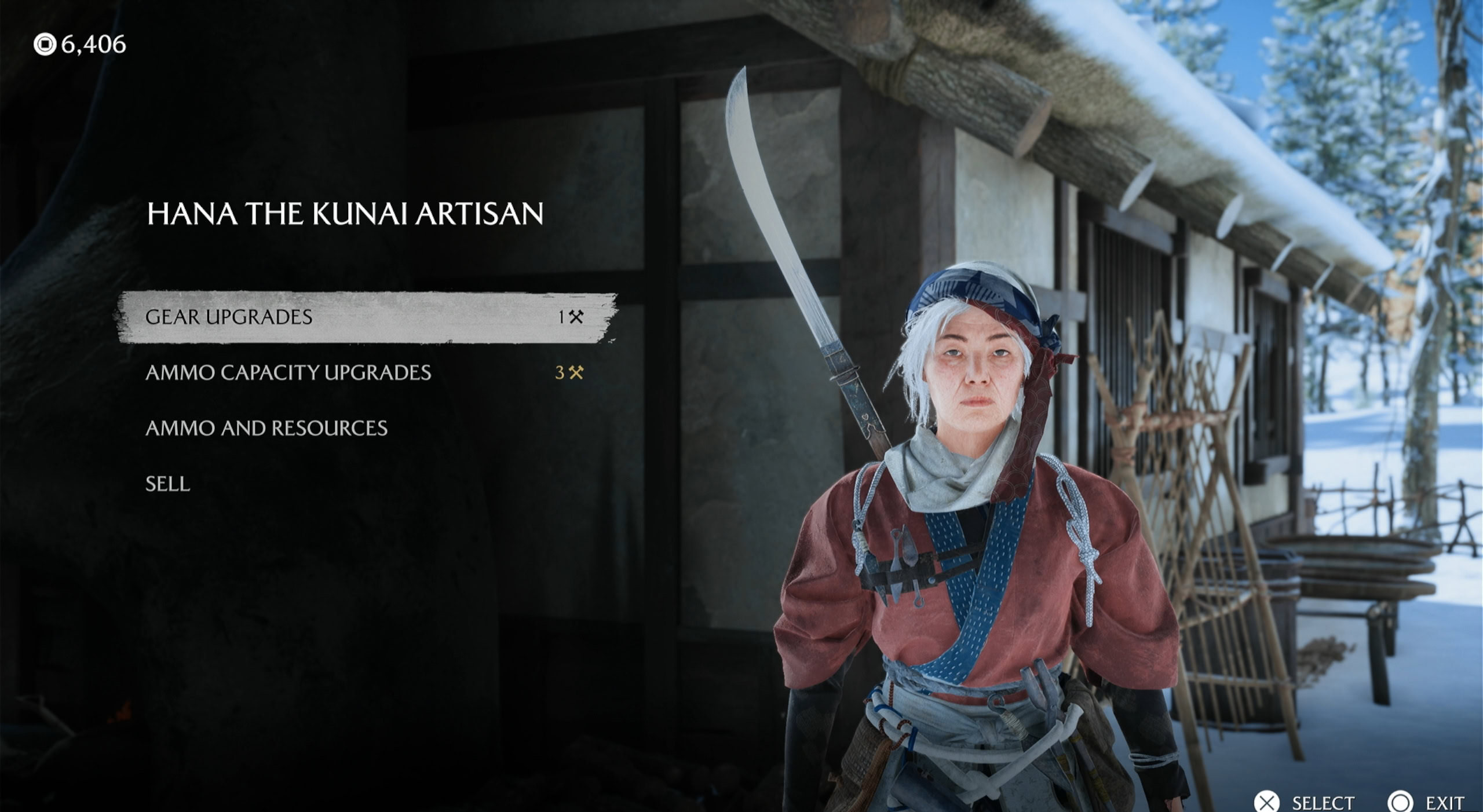 After the cutscene, Hana will act as a vendor that can upgrade your kunai and ammo capacities for kunai, smoke bombs, and metsubushi.