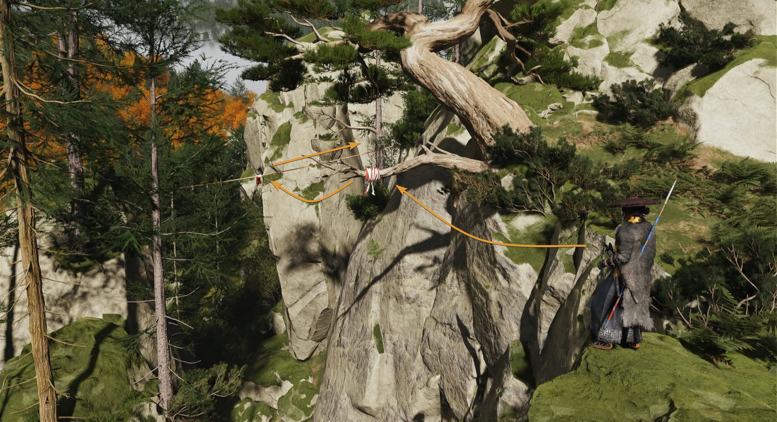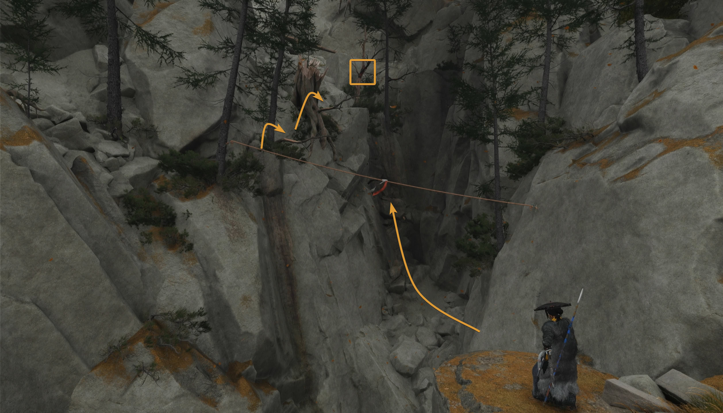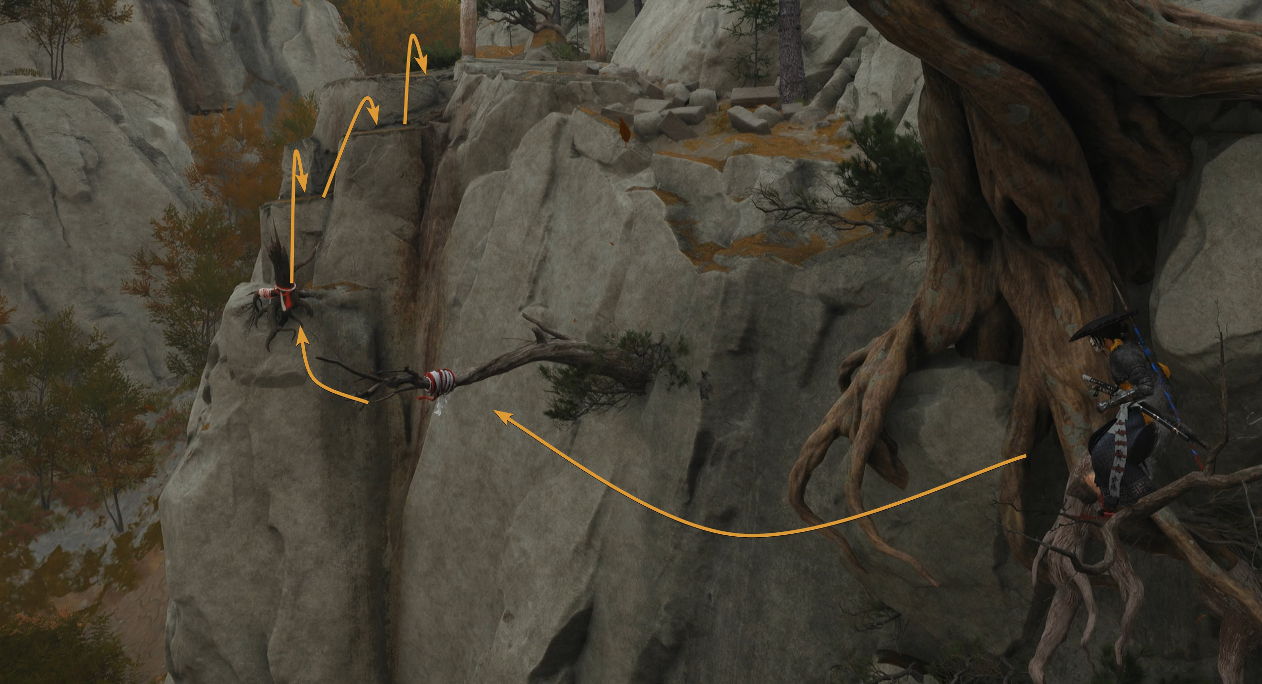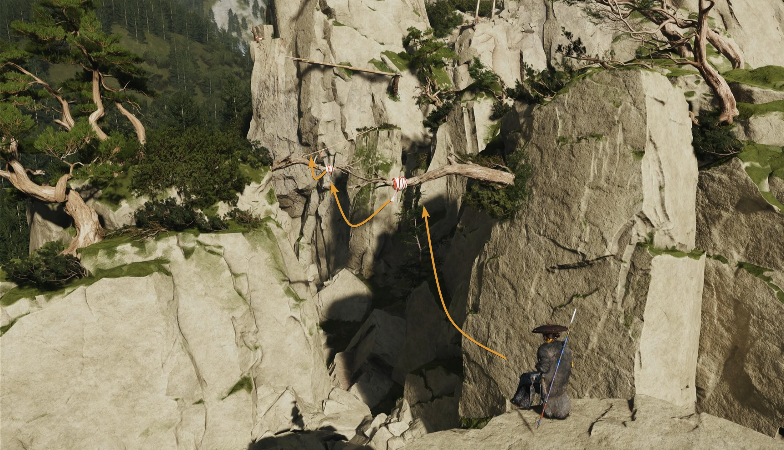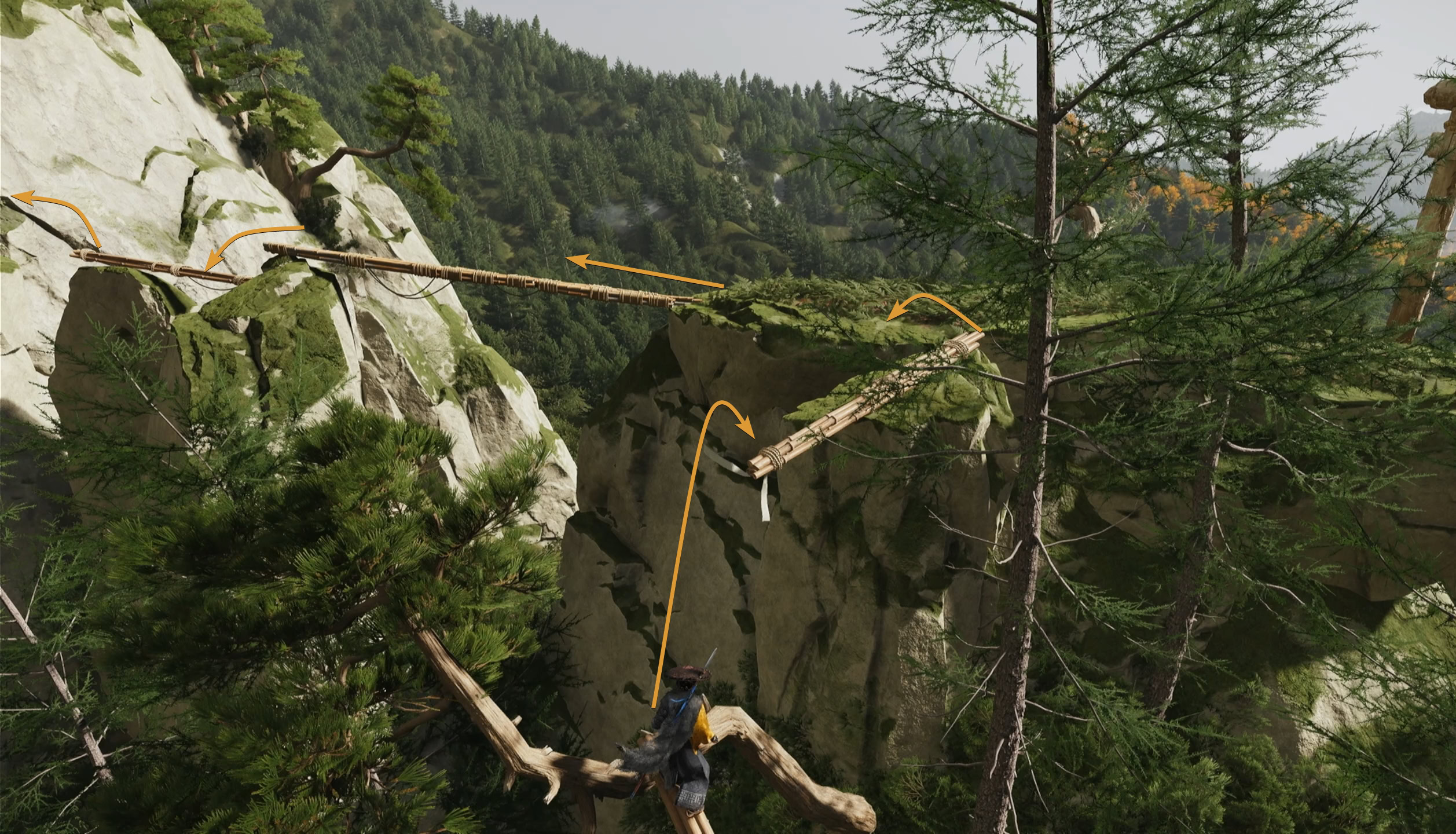 Jump to the bamboo bridge to the right of the waterfall scenery, and follow the path ahead to find three grapple points. Swing across the two branches then climb up the third point onto the tightrope.
