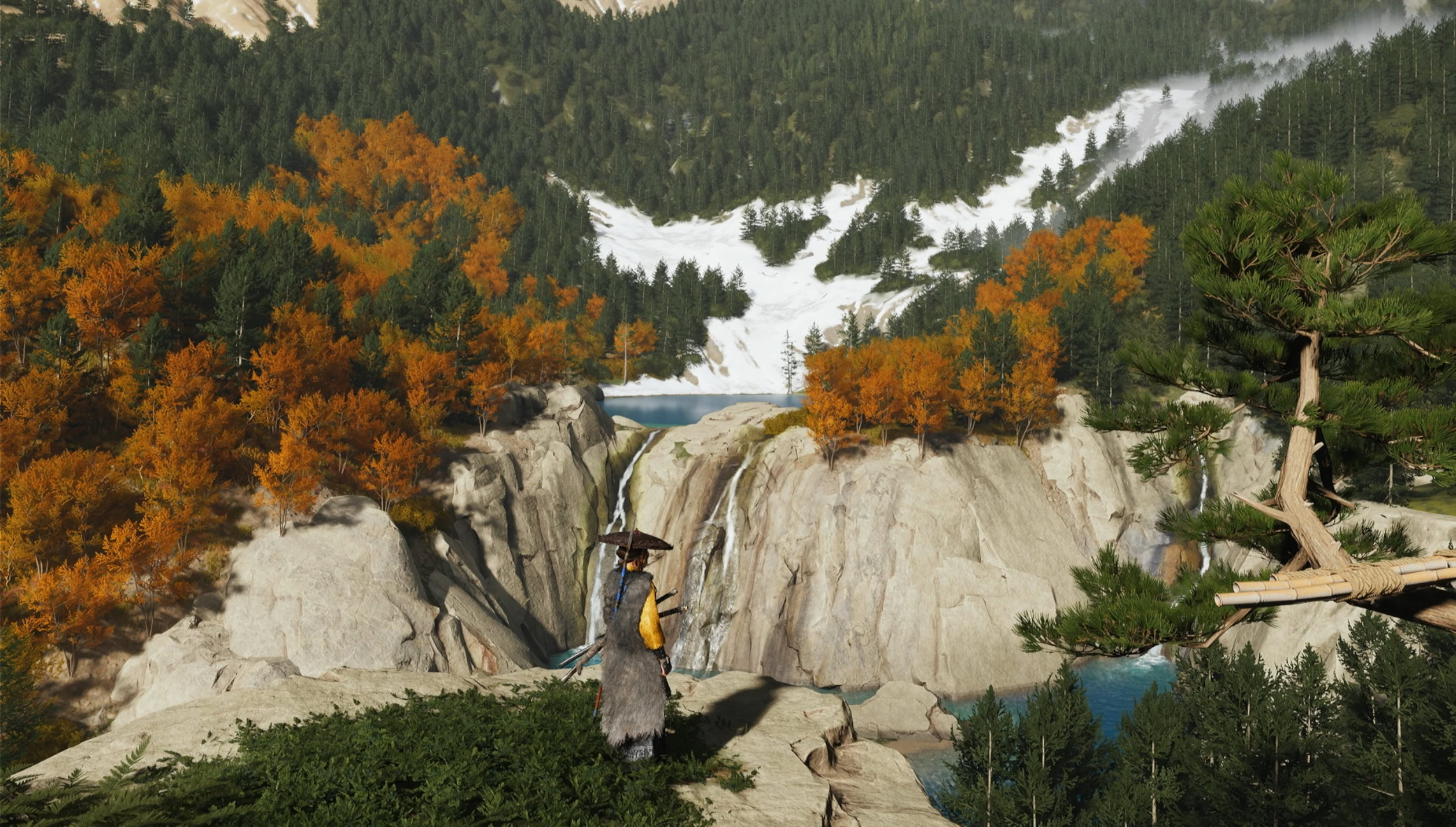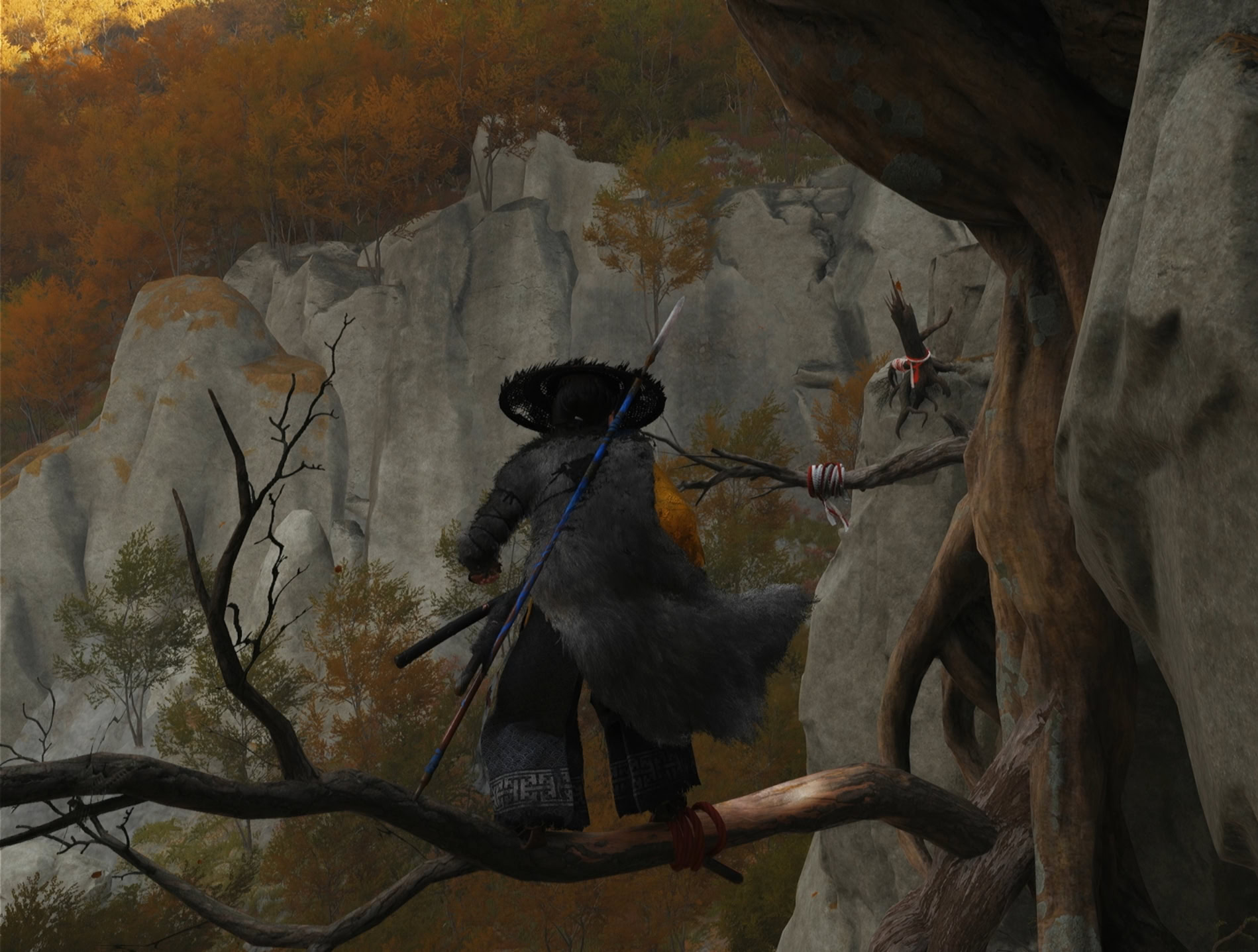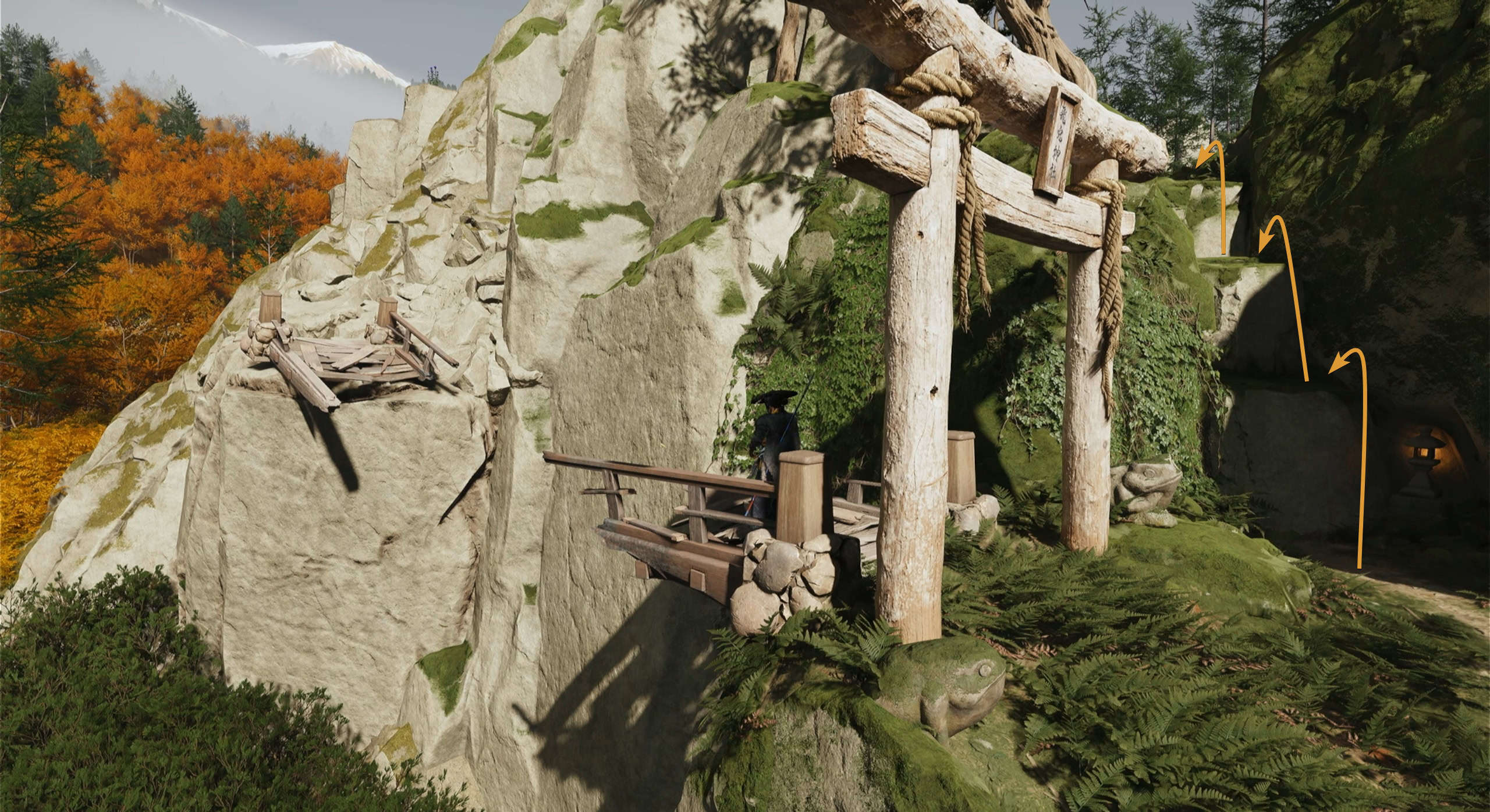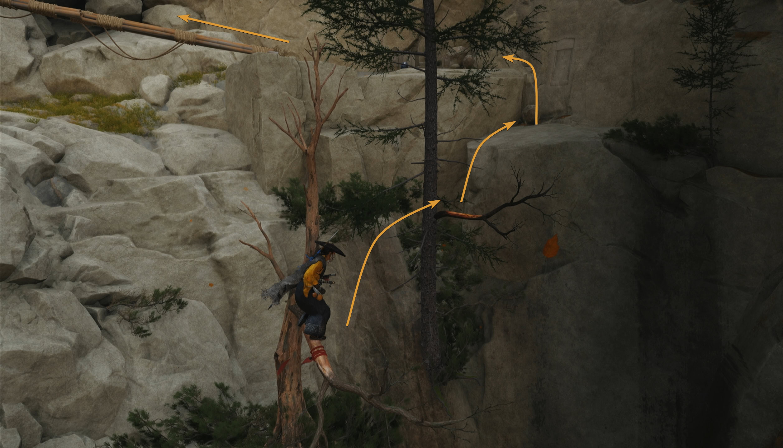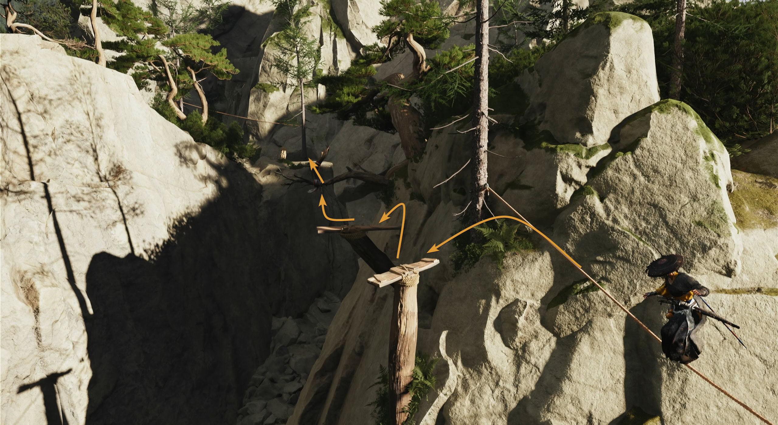 Jump to the bamboo bridge to the right of the waterfall scenery, and follow the path ahead to find three grapple points. Swing across the two branches then climb up the third point onto the tightrope.