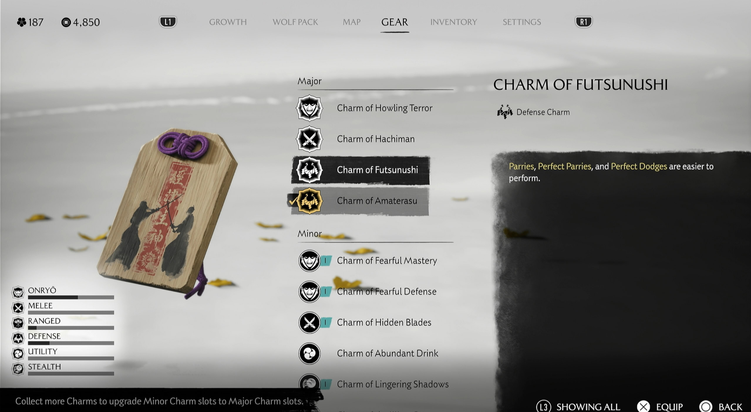 The Charm of Futsunushi is a Major Defense Charm that increases the windows for Parries, Perfect Parries, and Perfect dodges, making them easier to perform. This compliments the Armor of the Undying and the Bounty Master Armor.