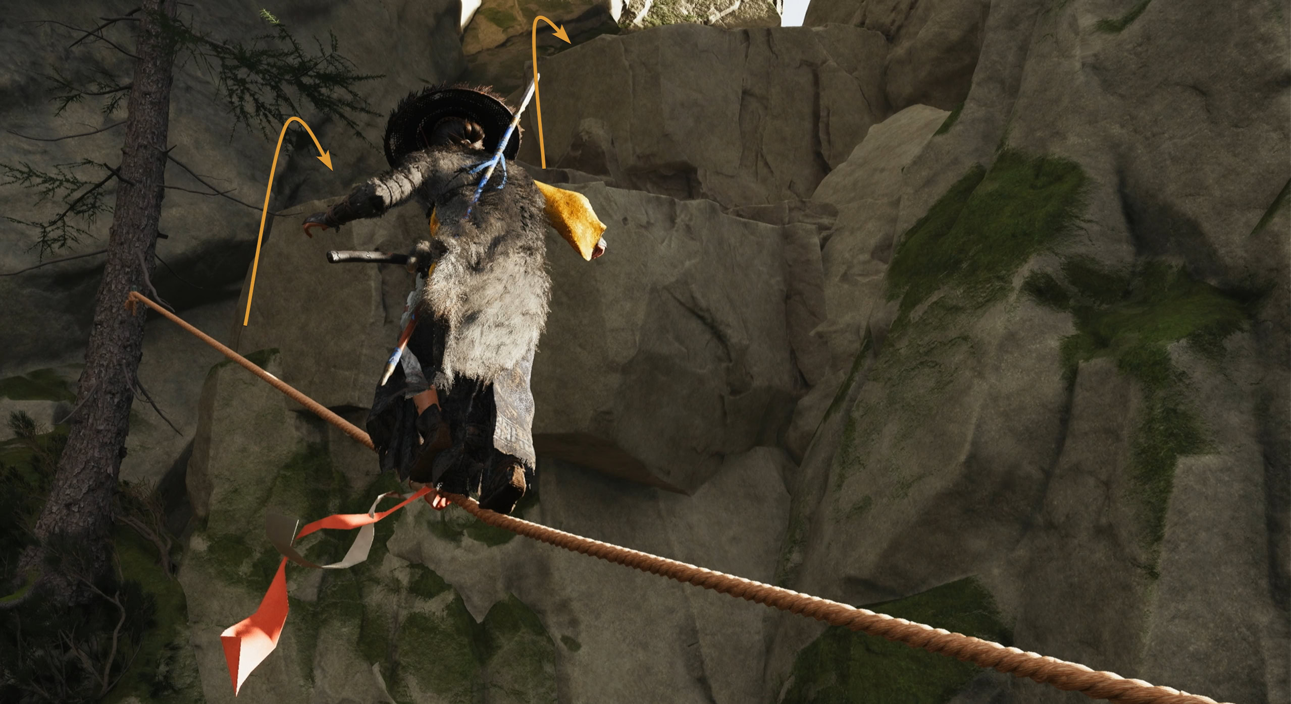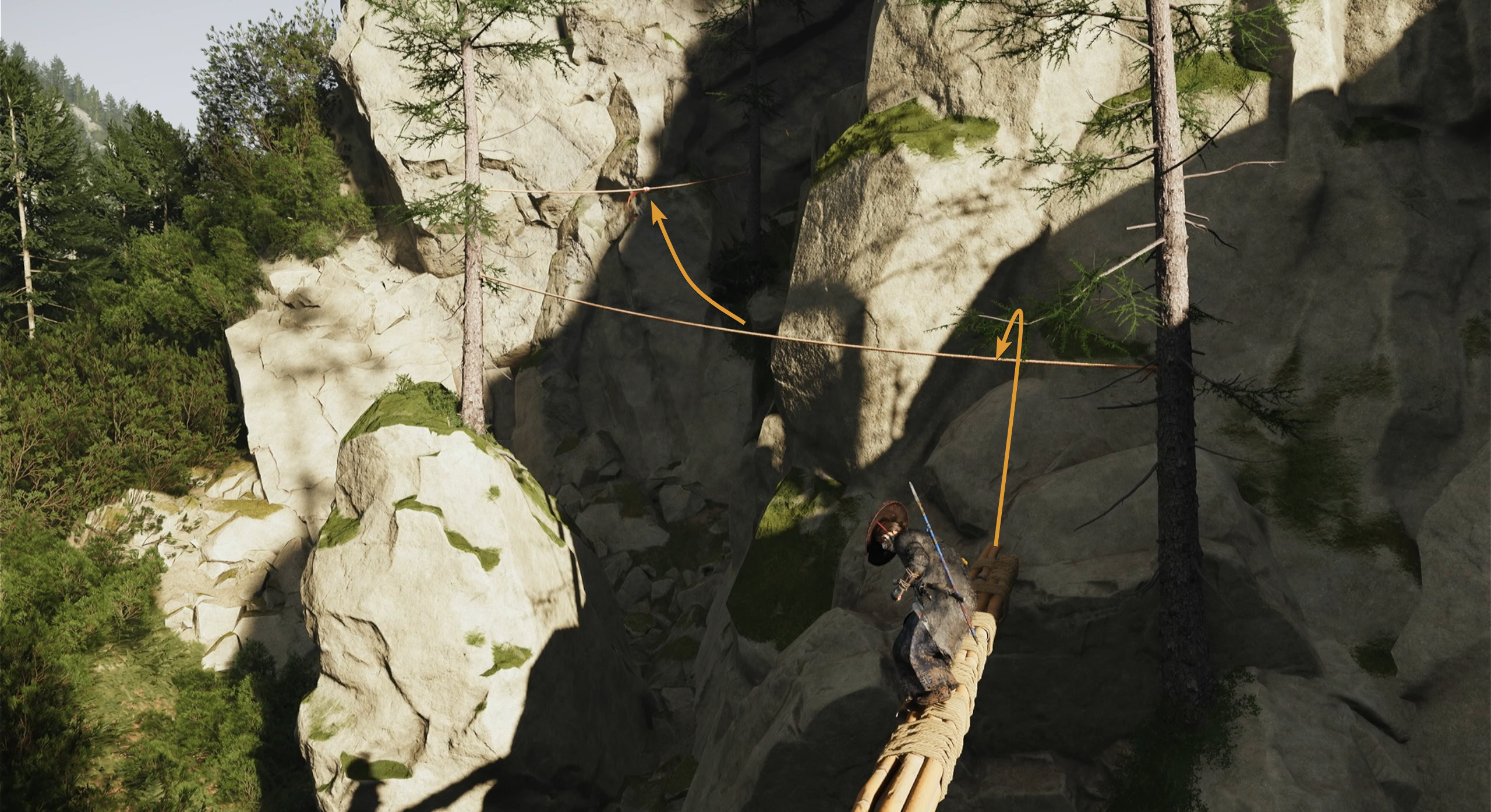 After climbing up the ledges, you’ll see a tightrope with a red and white flag. Jump and grapple onto it, climb on top of the rope, then jump across the branches and onto a rocky platform. On the platform, pull down the red flag branch.