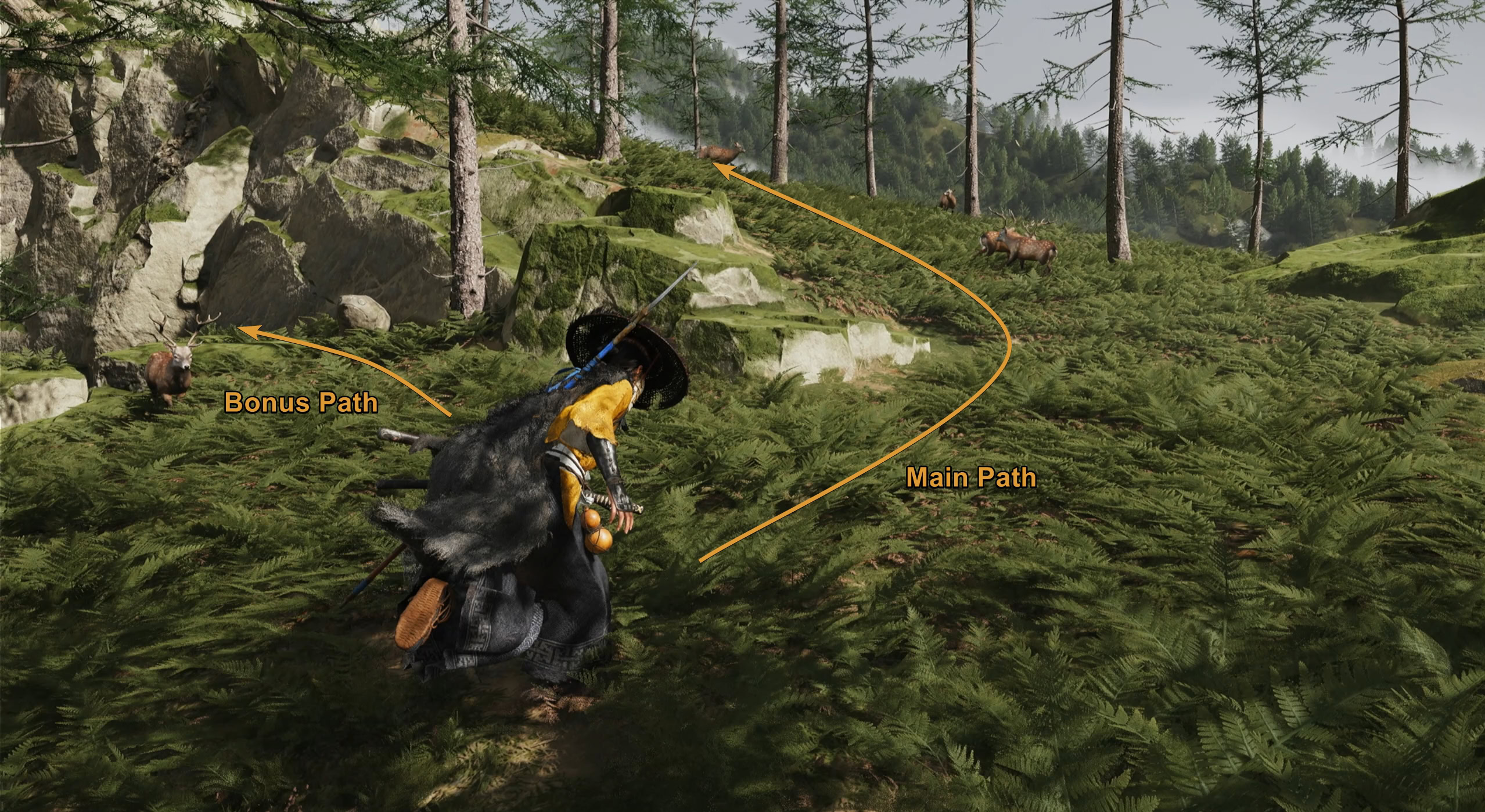 Going uphill where the deer are will lead you to a branch you’ll need to swing on, then to a tight rope you climb up. Go to the right and jump onto the tree branch, to the ledges, climb up, and go across the bamboo bridge.