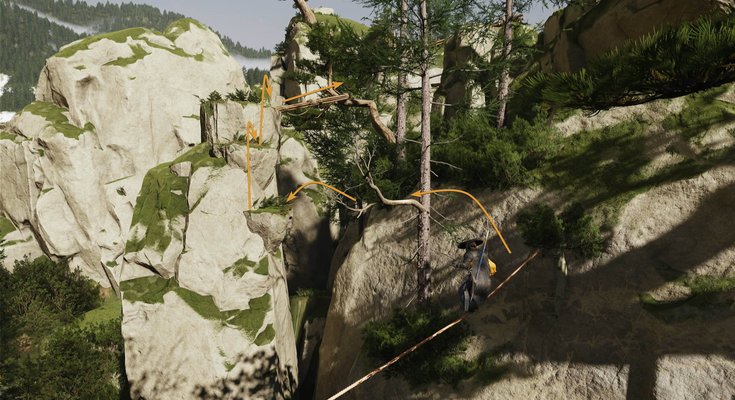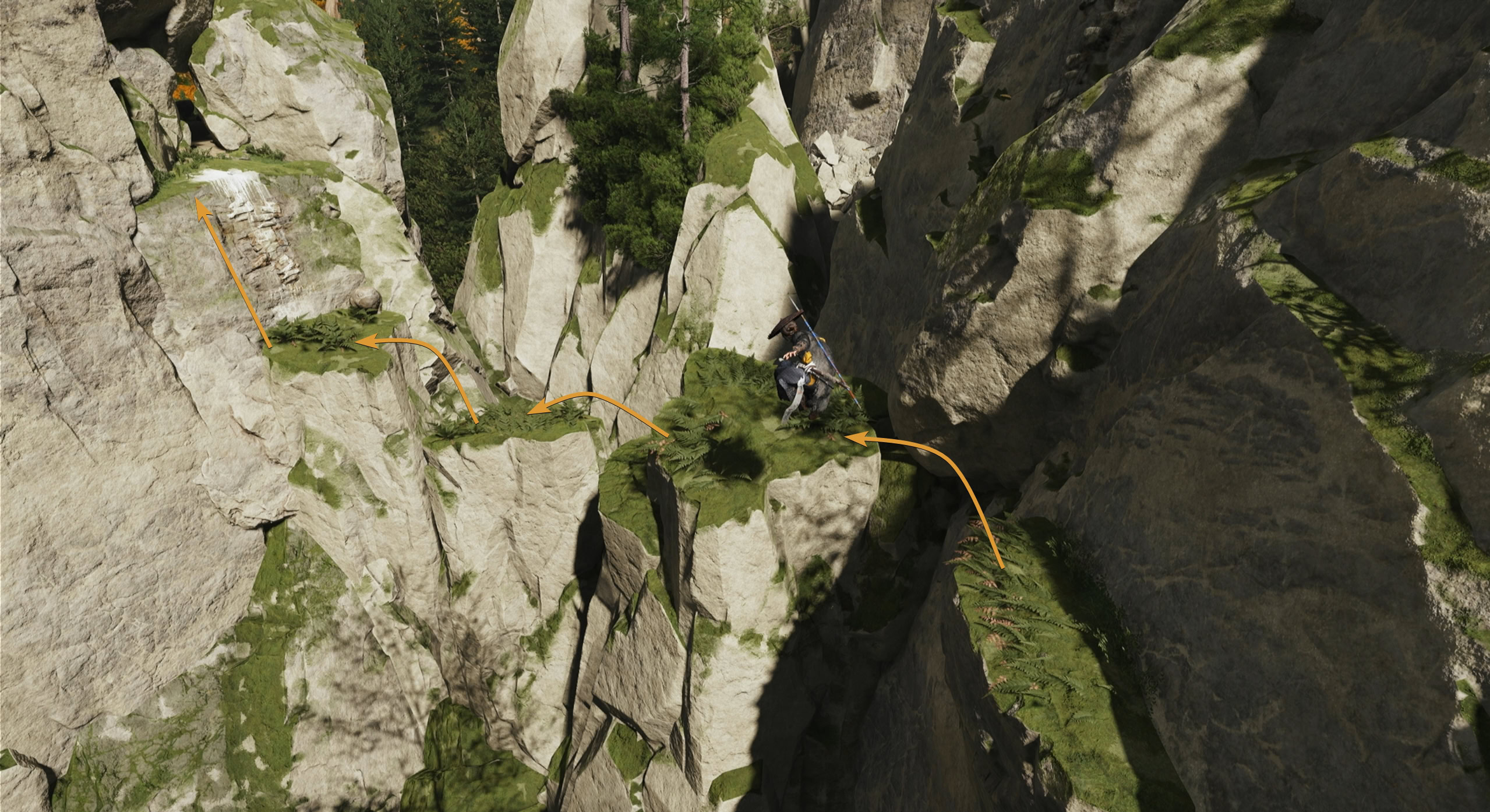 These red flag branches will appear throughout this trial, so don’t immediately jump at every flagged branch you see. From here, you can swing onto the branches ahead then climb up the ledges.