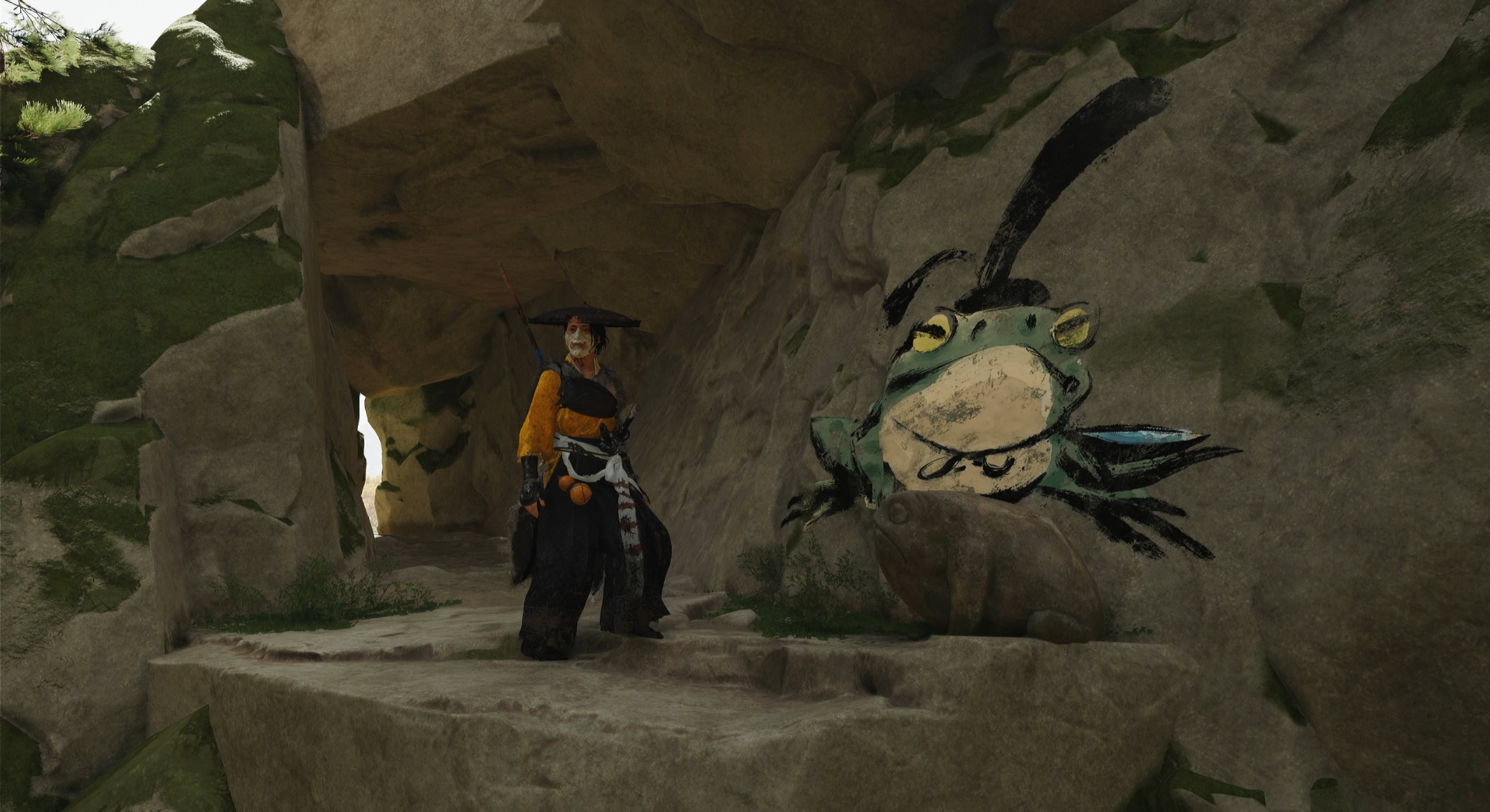 Go to the left and you’ll find some small platforms you’ll need to jump across. Climb up the white rocks and squeeze through the opening to find a few supplies and the frog painting. Return to the fork in the road and continue going uphill.