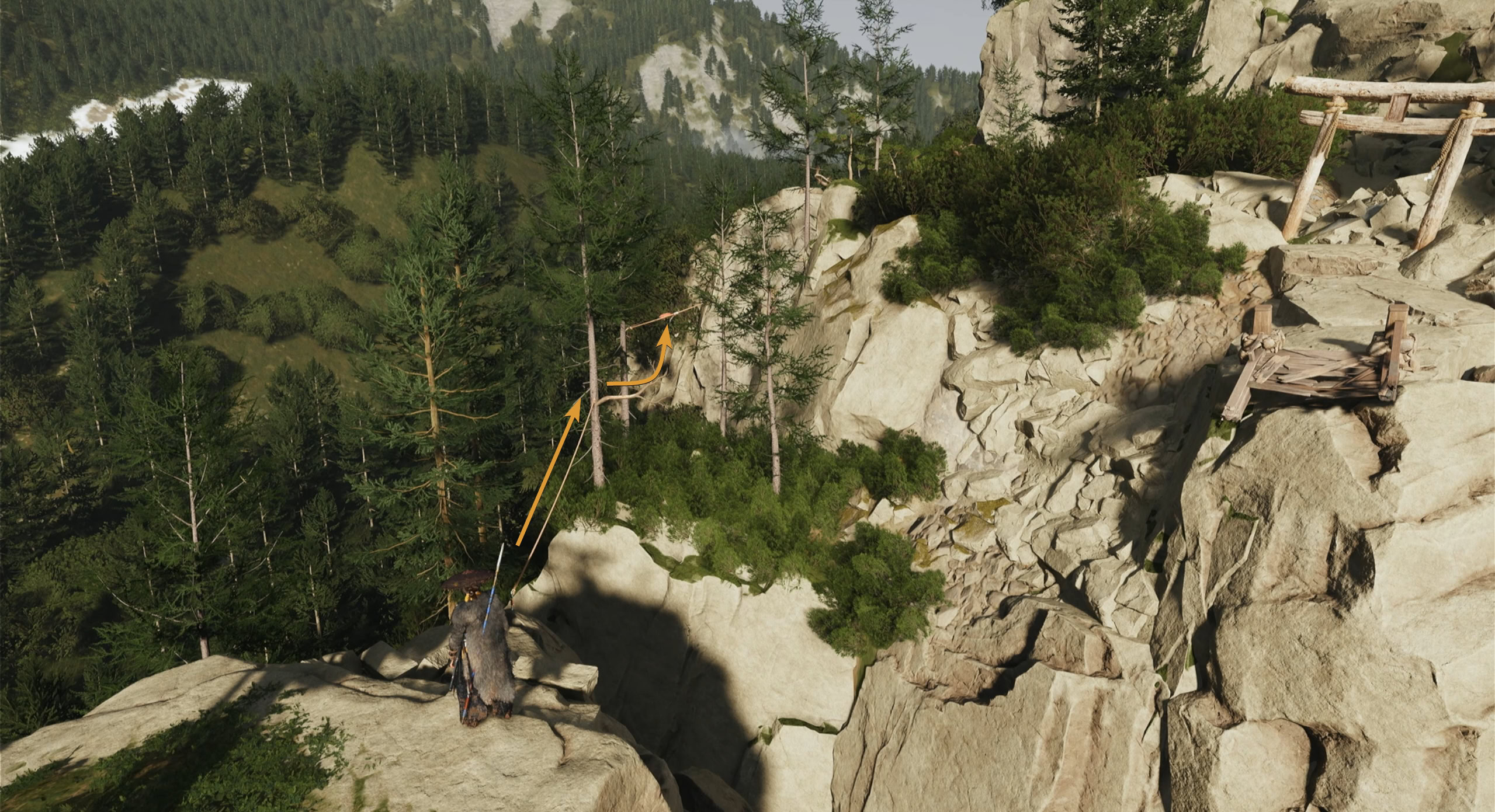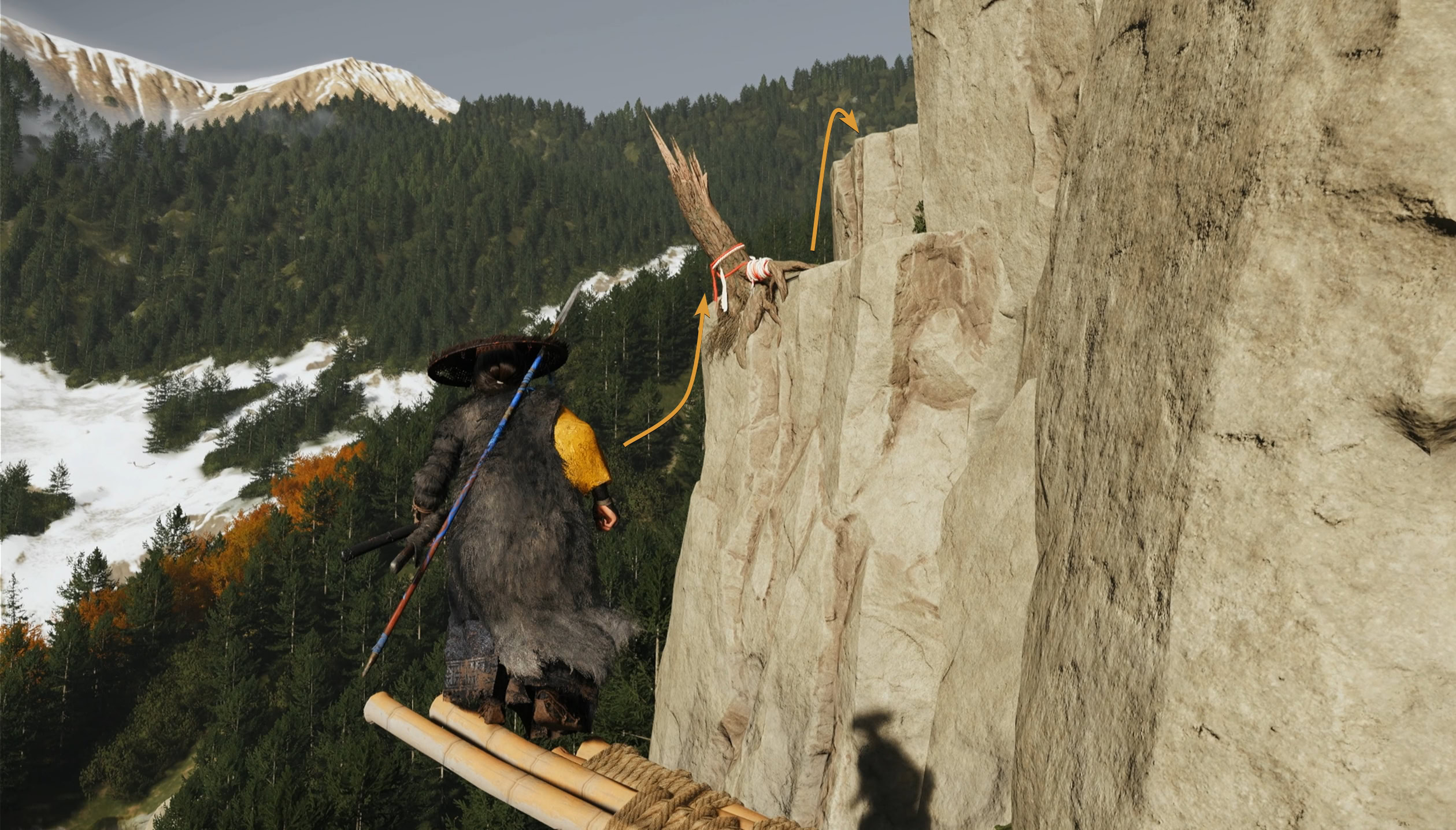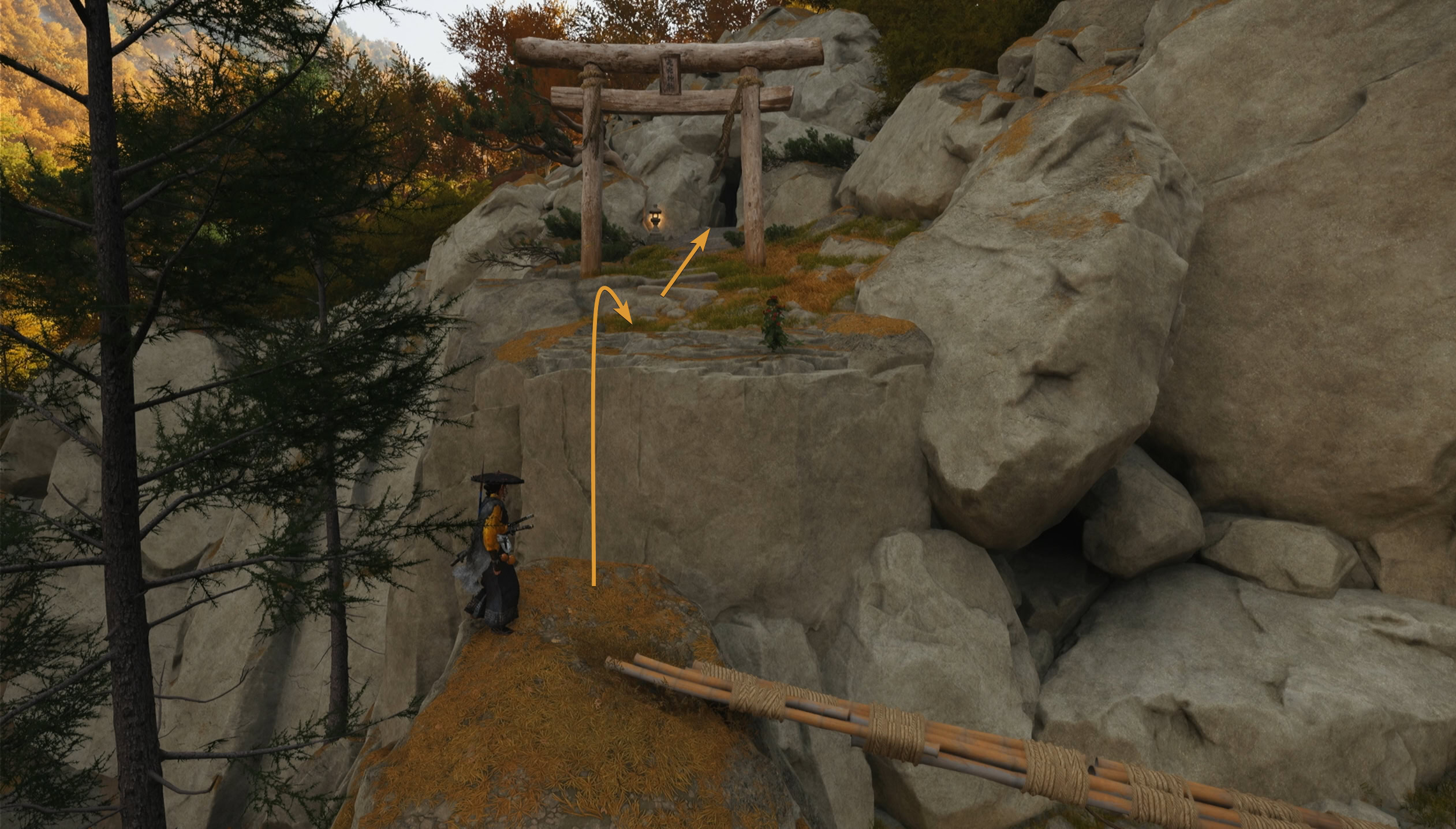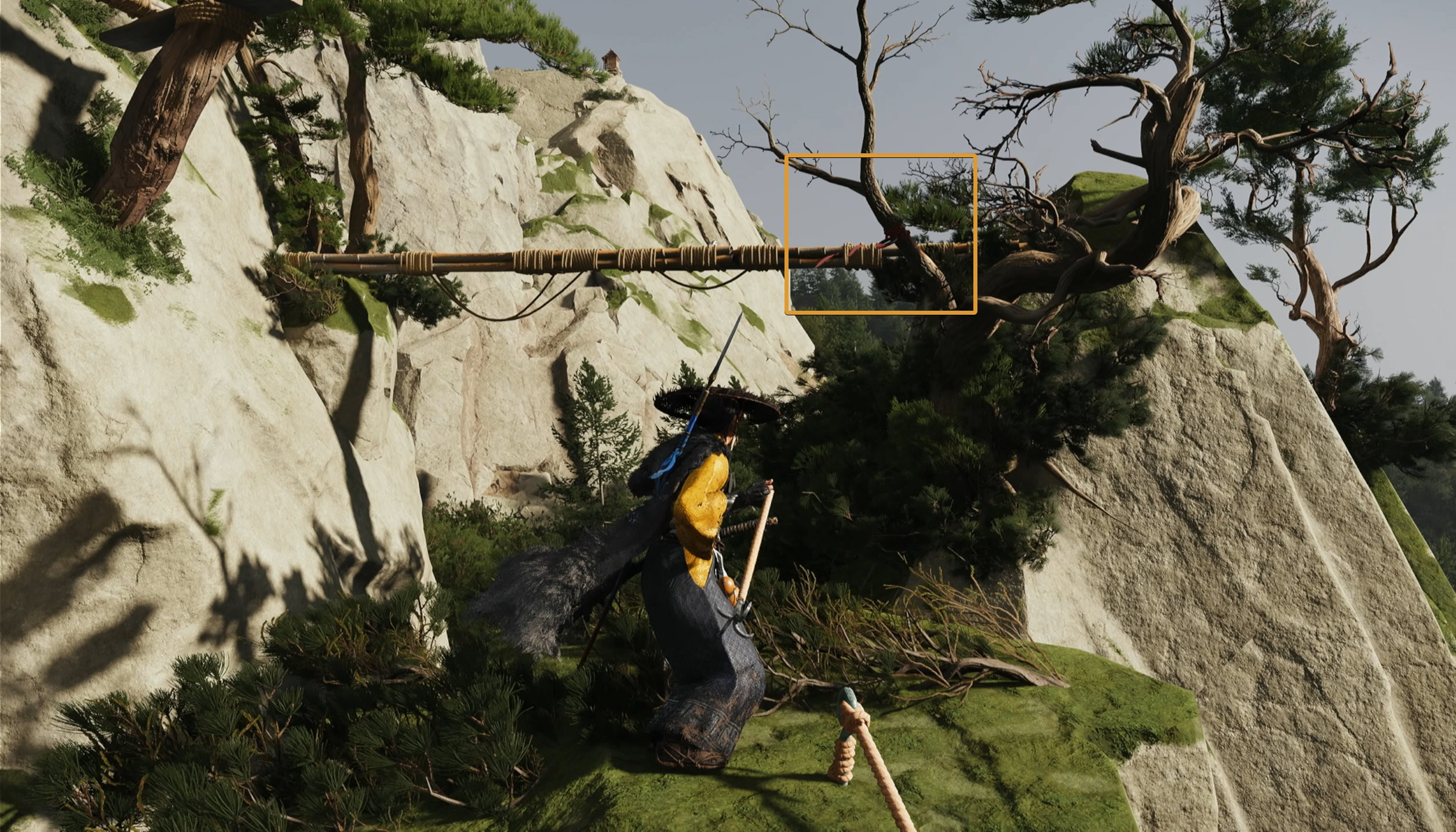 Walk to the ledge to the right and look for the branch with the red flag. Pull it down, jump onto it, then jump to the bamboo bridge. Go across the bamboo bridges, then grapple onto the broken tree stump and climb up.