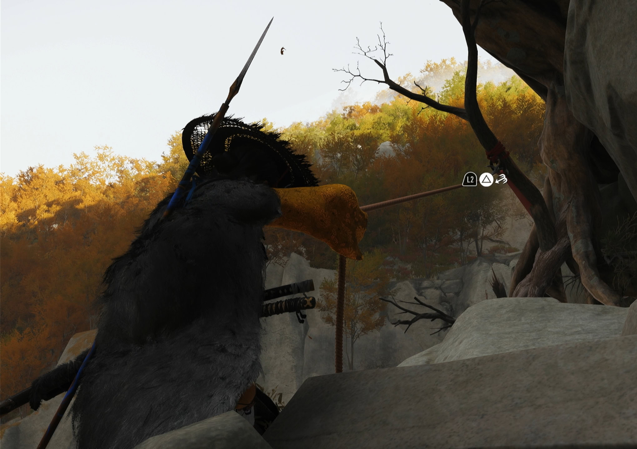In the case of pure red flags in this shrine, these are points you want to press and hold △ and pull the branch down while holding L2. This creates a platform for you to jump on rather than swing on.