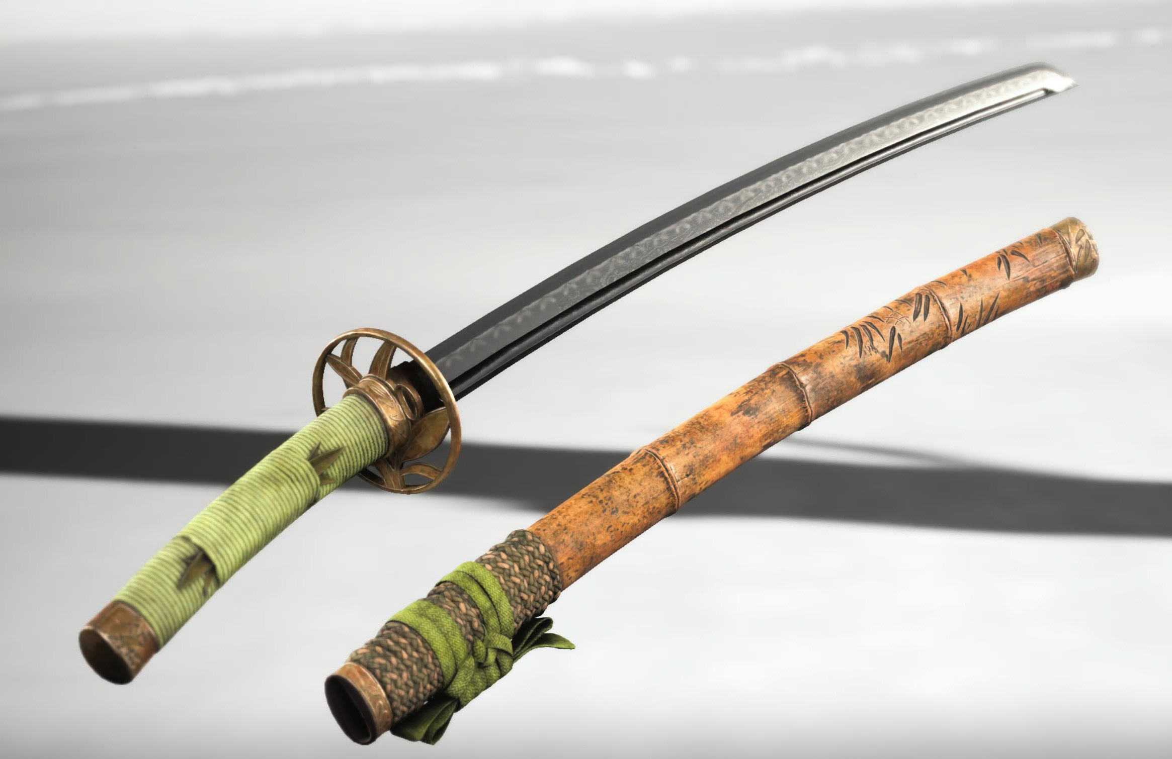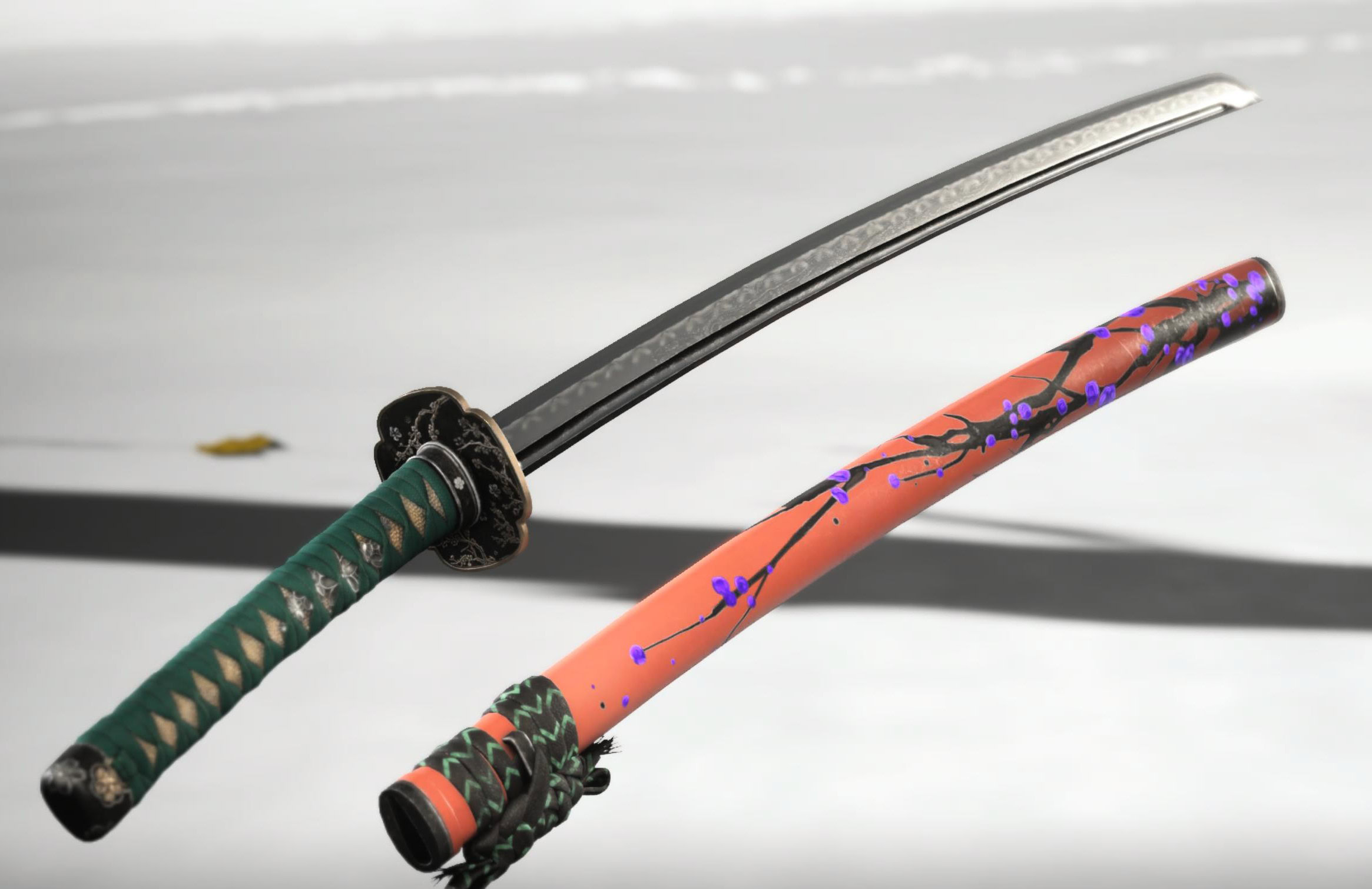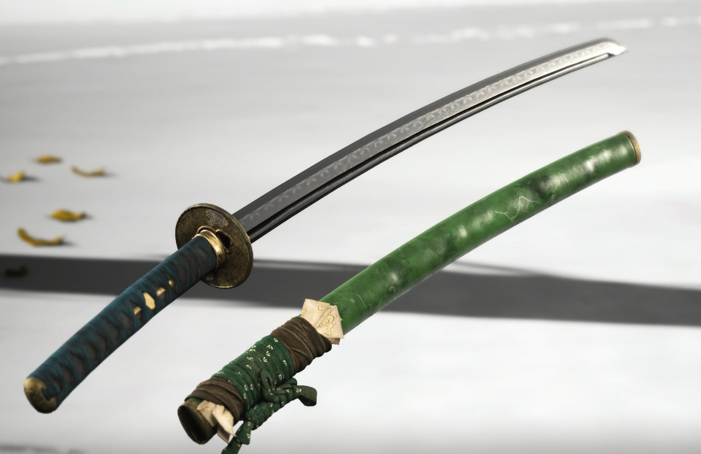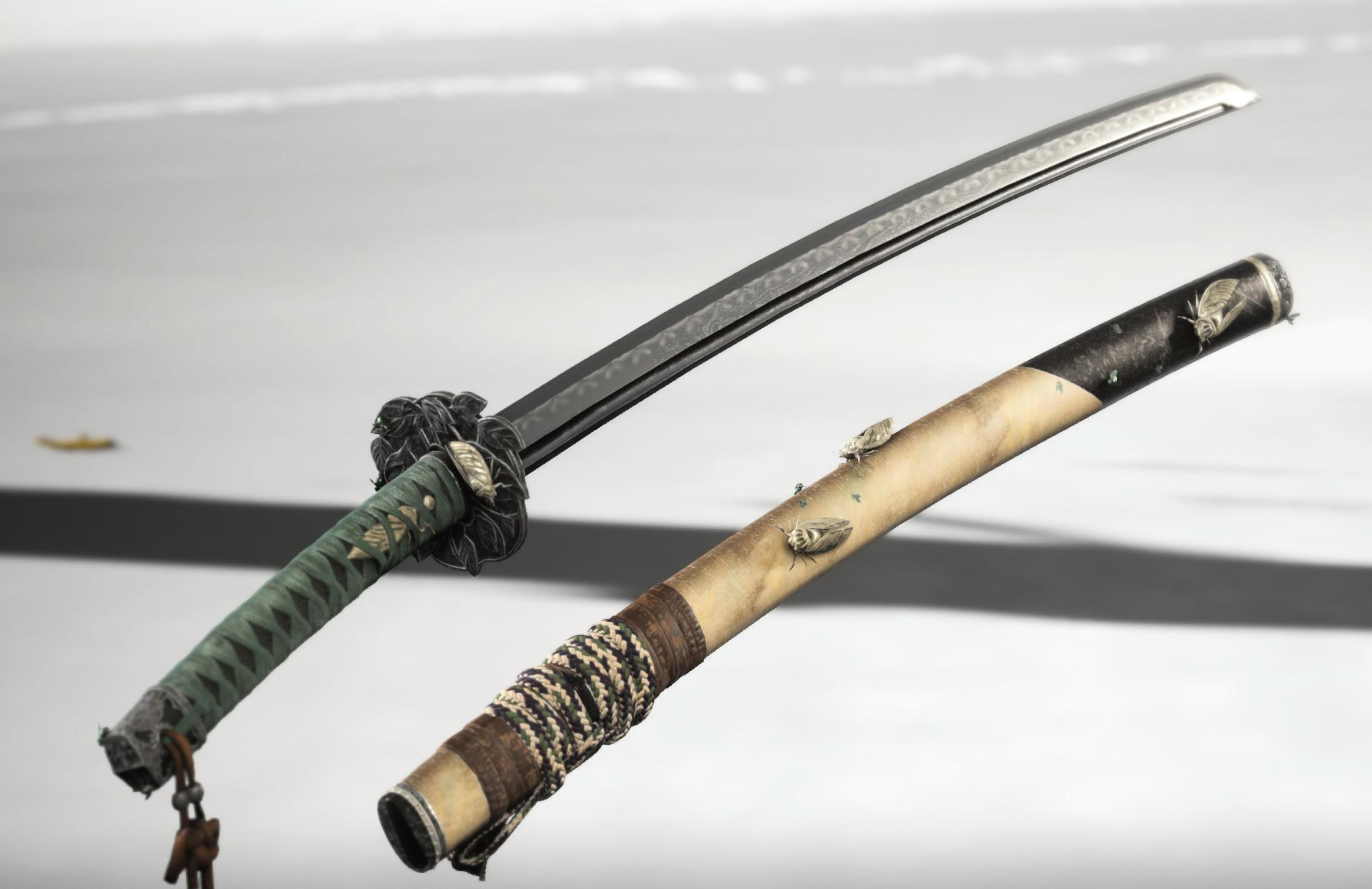 Yae’s Cruel Brew features a worn bamboo scabbard with bright, leafy green hanging cord and grip. This kit looks more rustic than most.
