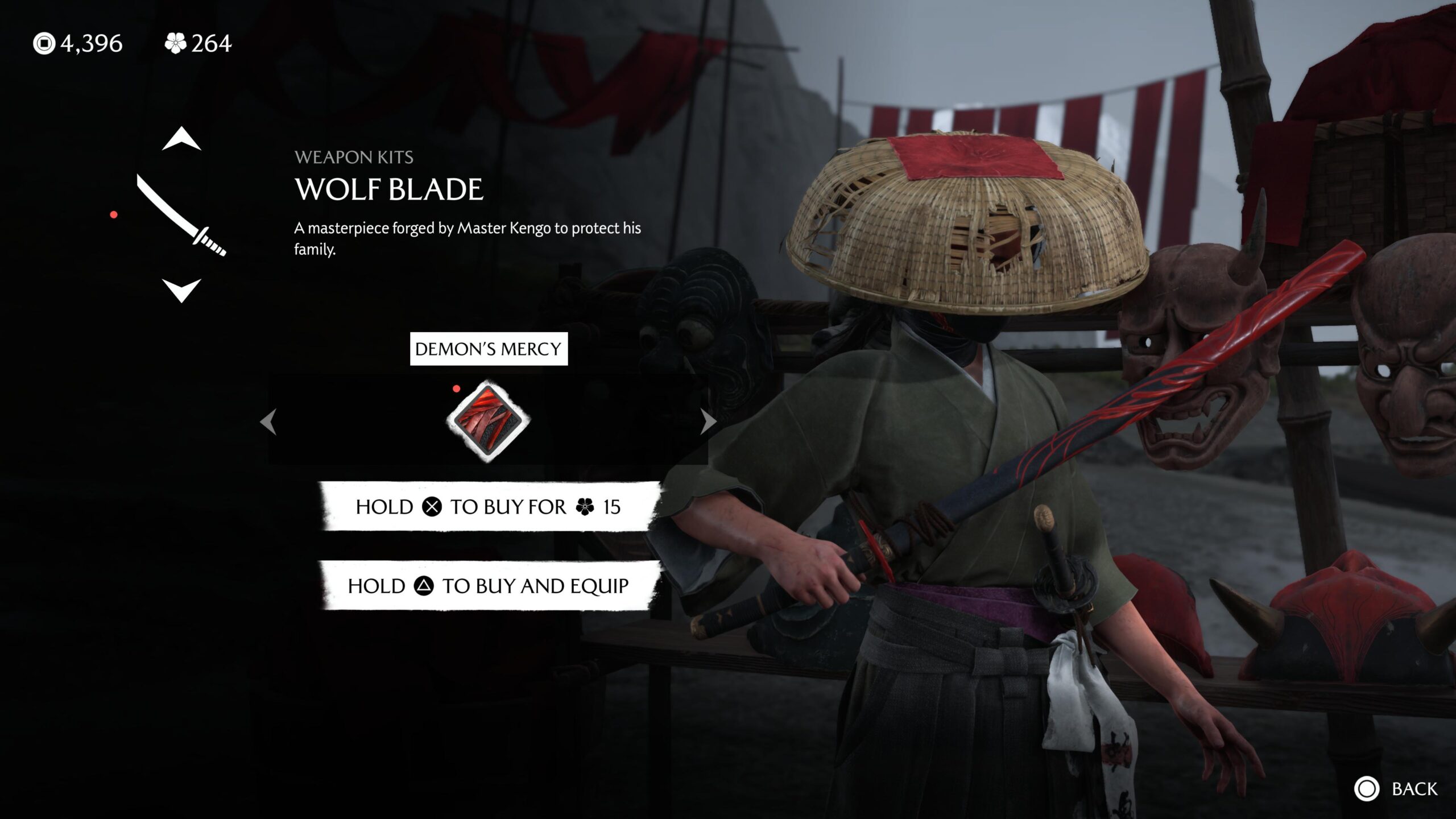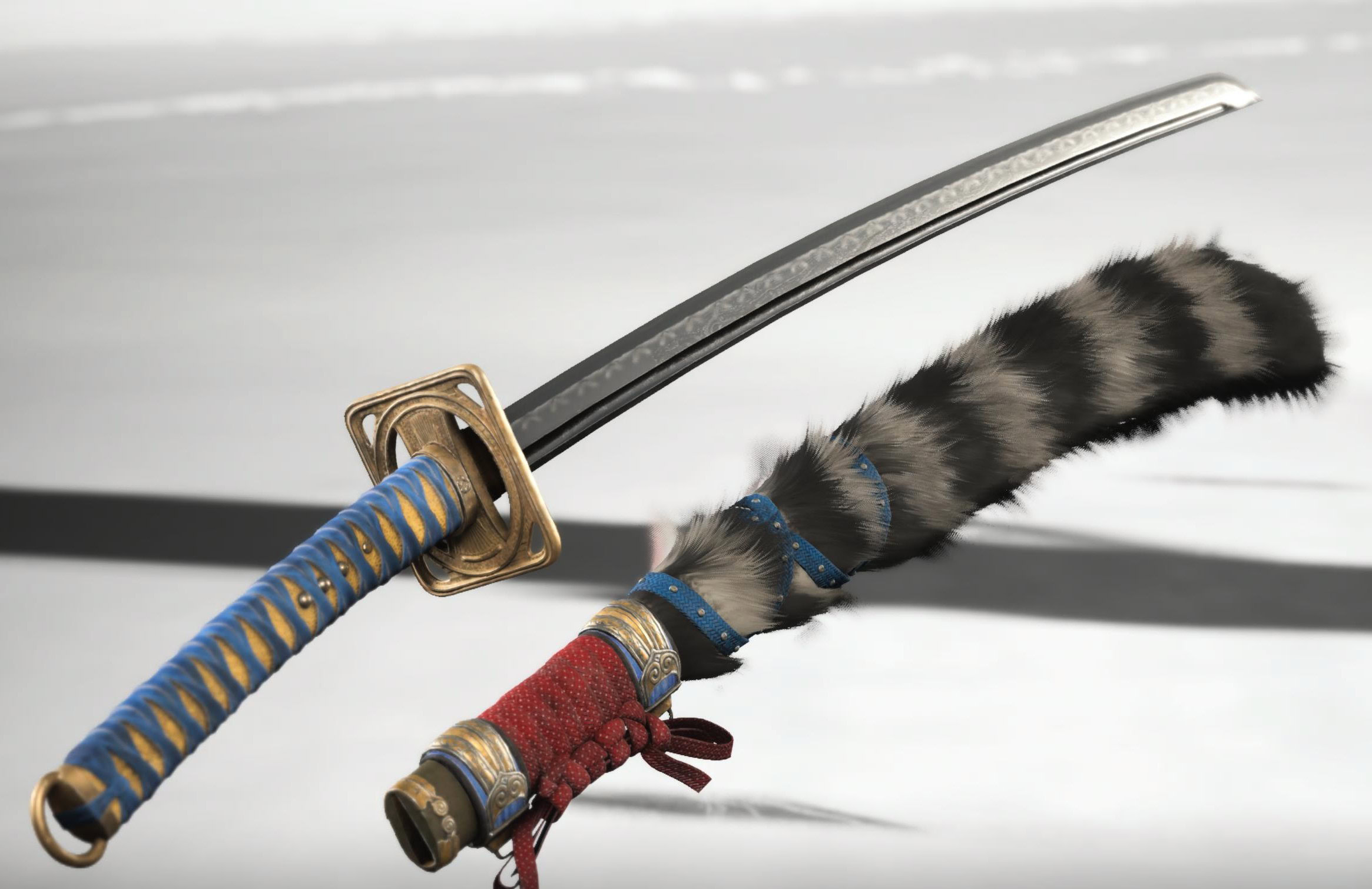 Tanuki’s Mischief employs yellow and blue on the grip with a red hanging cord and a raccoon pelt sheath to evoke Sly Cooper, one of Sucker Punch’s earlier franchises. Pair it with the Sly Bandit dye on the Mercenary Attire and Sly Thief Mask if you want to go all in on this easter egg.
