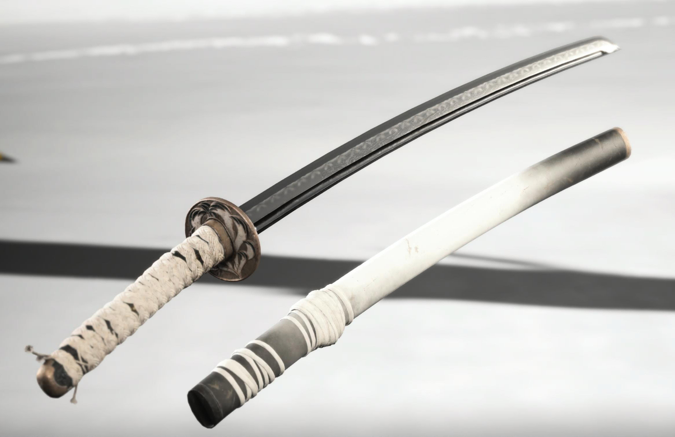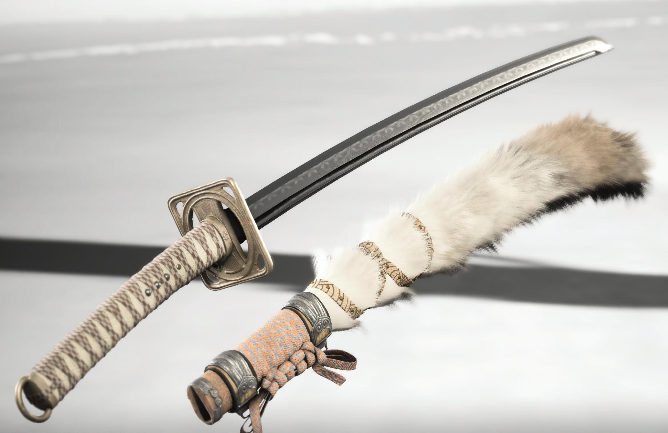 The Kitsune’s Shadow features a white scabbard that fades to silver on both ends and a simple white grip.