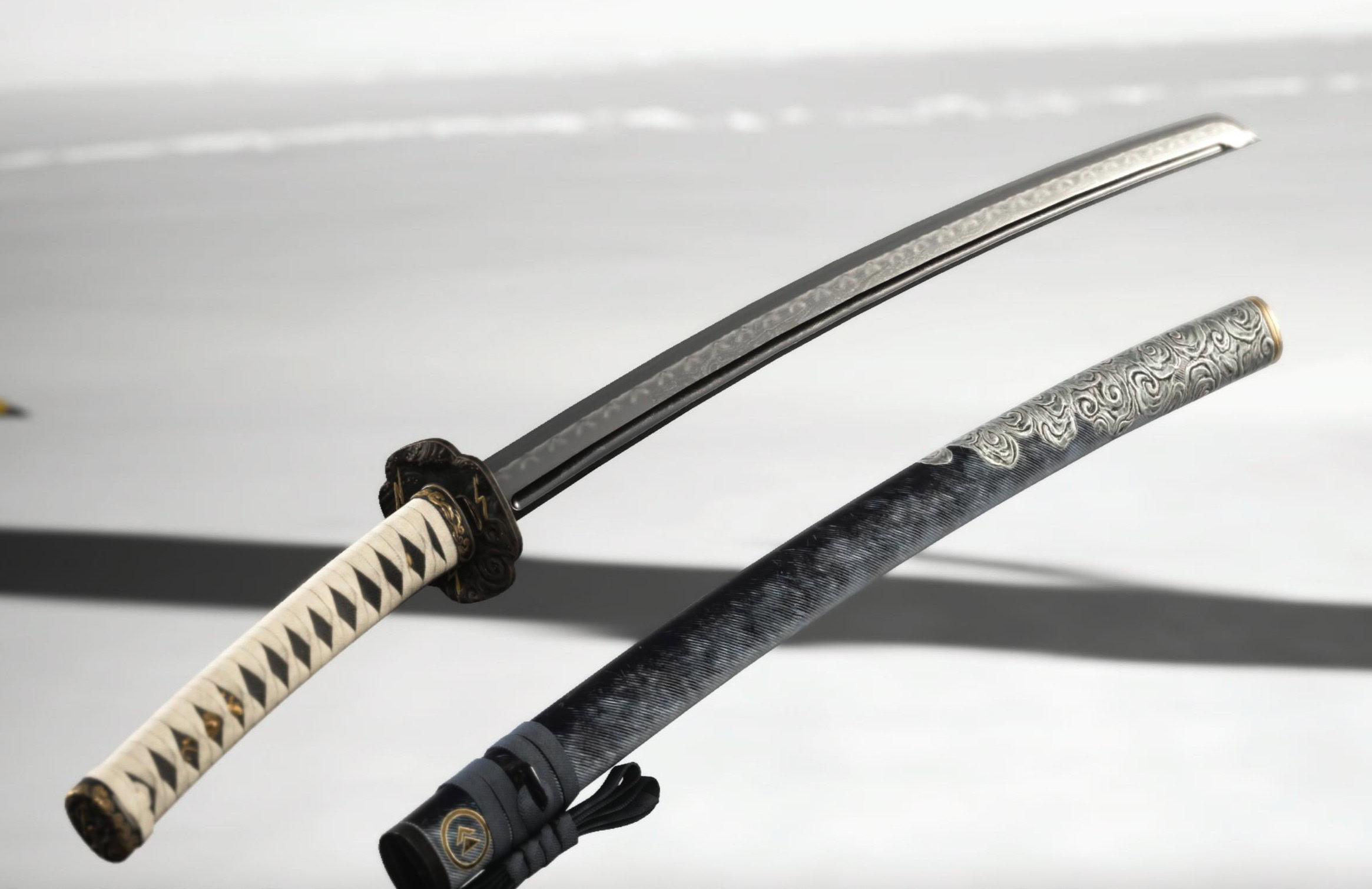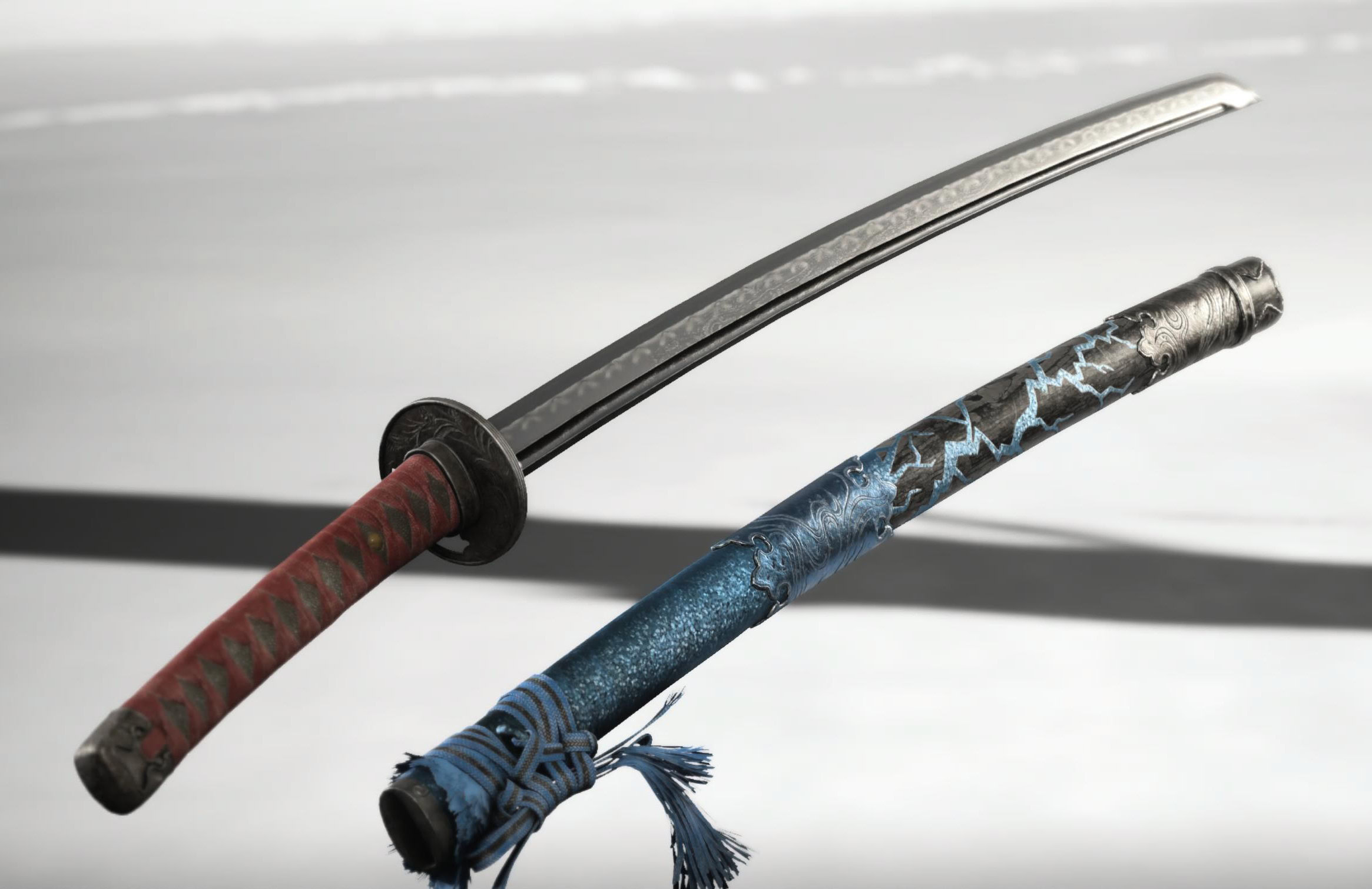 The Storm Blade features a scabbard with swirling silver etchings at the tip, meant to evoke clouds, over fine brushed navy black, meant to evoke the rain. At the top of the scabbard, we can see the Ghost of Tsushima’s emblem. The grip is white with gold accents underneath and on the guard.