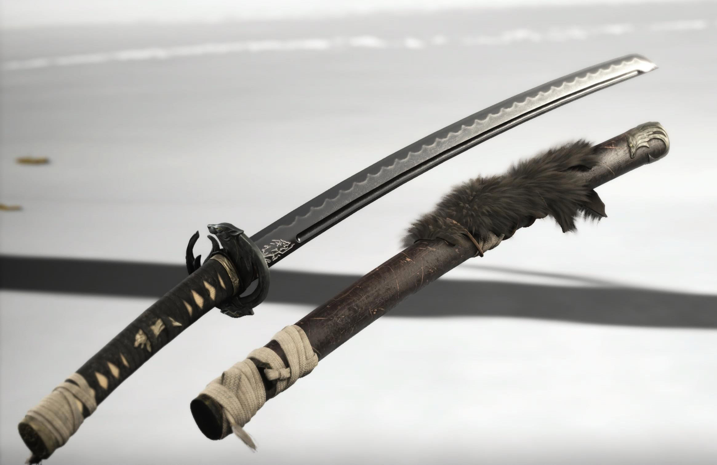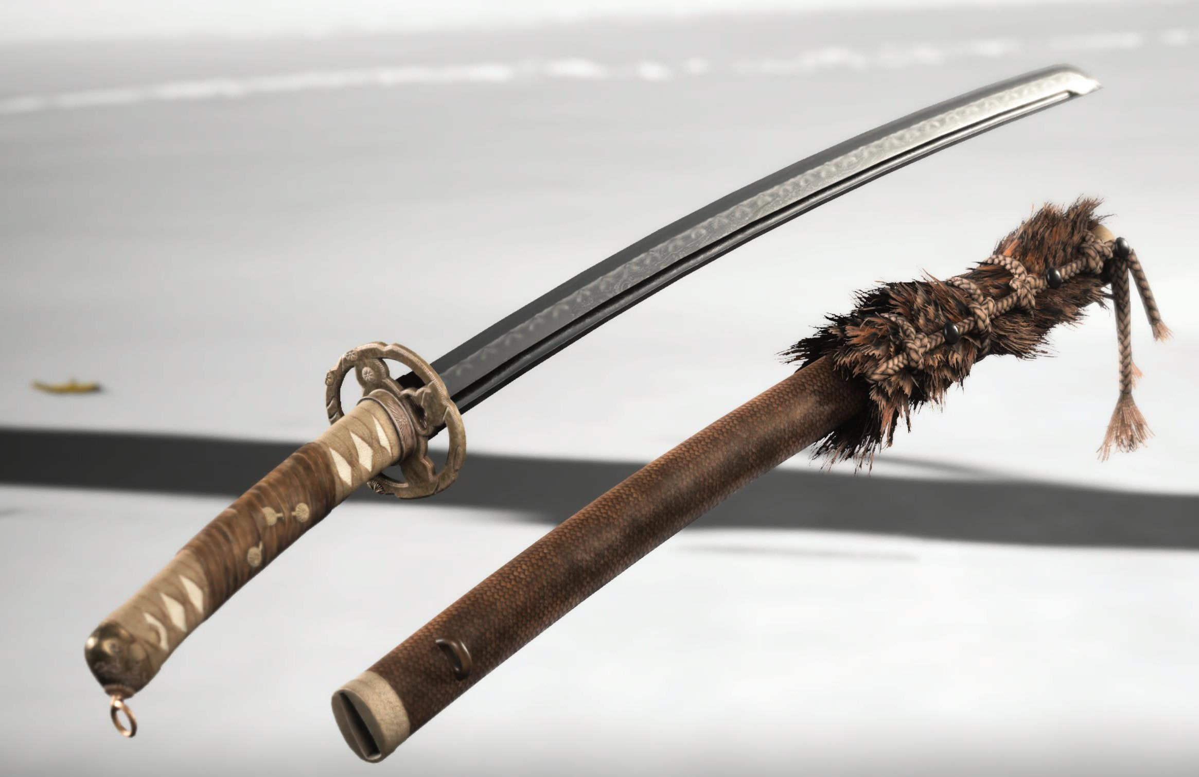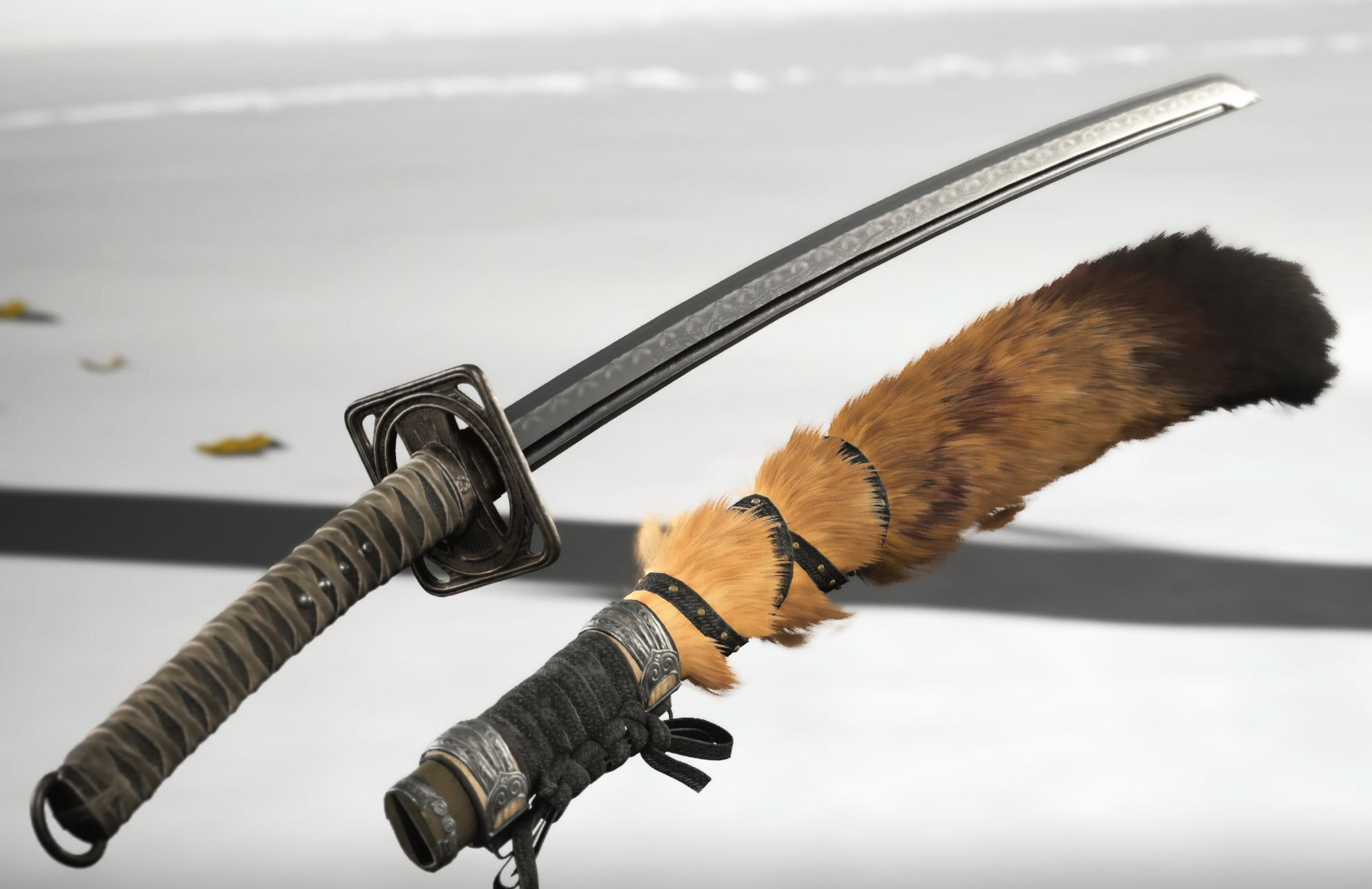 Scavenged Victory features a uniform brown scabbard with a small brown pelt tied to the end. The grip is a lighter three-tone brown to tan. It matches the Lone Wolf kit, allowing you to go for the same theme on both katanas.