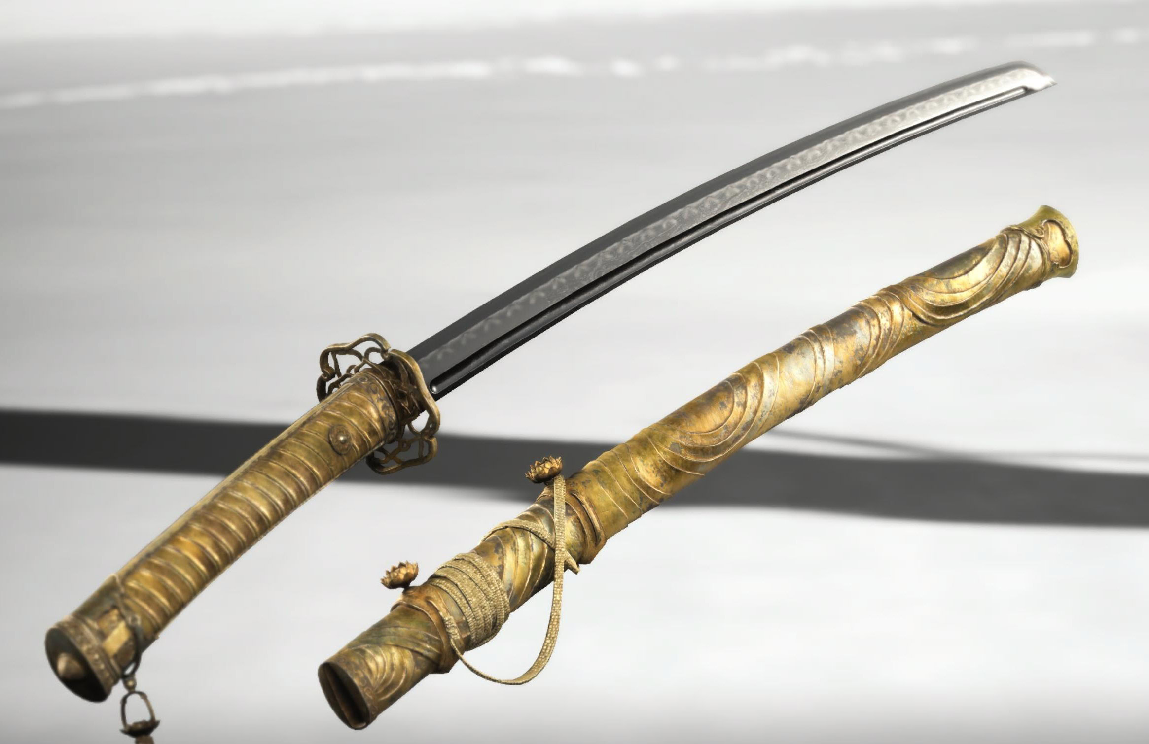 Yoshitada’s Fourth Pearl features an iridescent aogai pattern reminiscent of fish scales capped by a simpler fine textured bronze at both ends. The grip has copper studs and a pearl embedded in a black textured hilt.