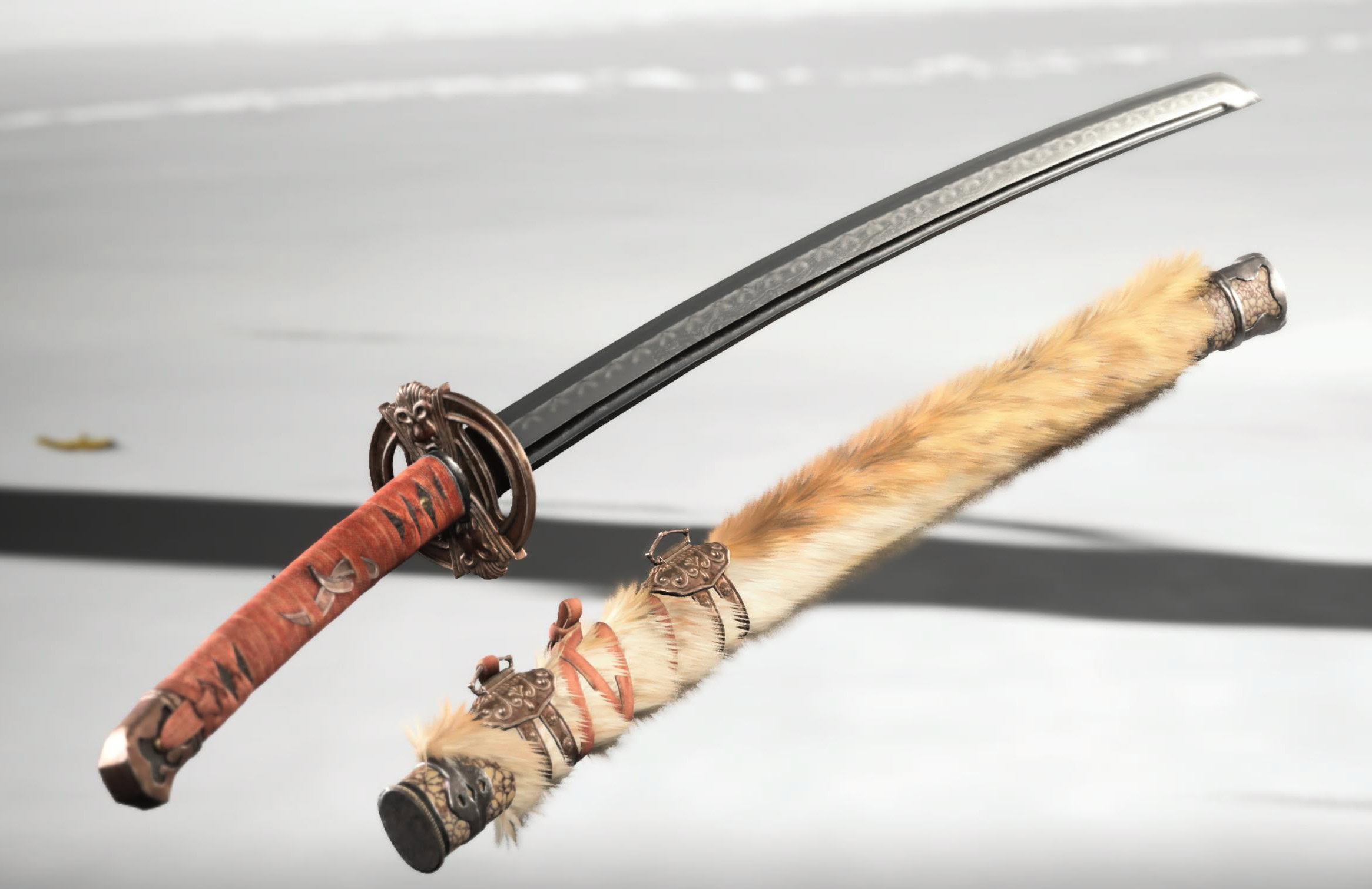 Masaru’s Claw features a large golden brown fur wrapped around a bronze and silver scabbard complemented by a solid salmon orange-grip. Unlike the other fur sheaths that will make it look like Atsu has a fox tail, this one is less bushy, meant to evoke a monkey tail.