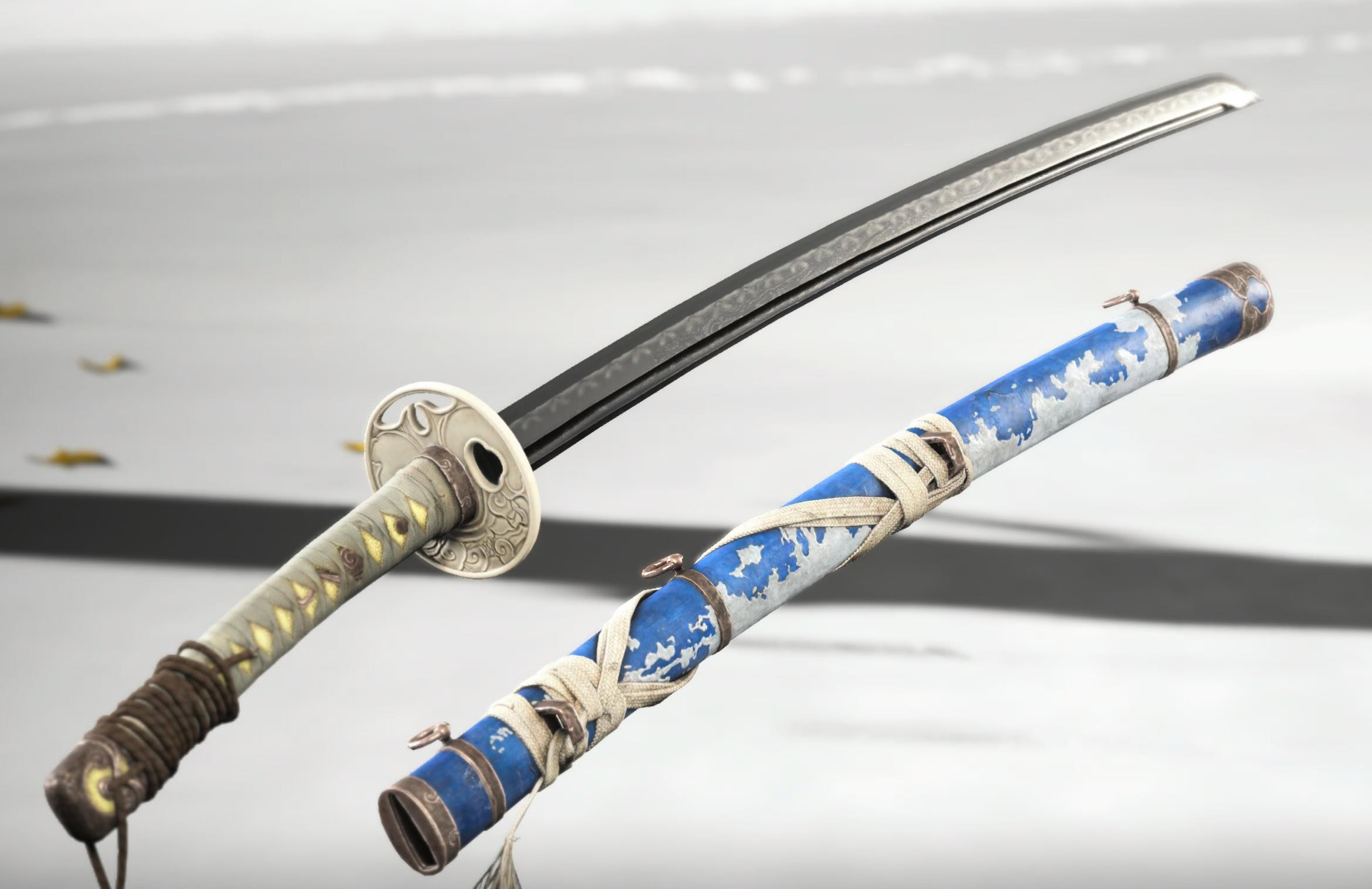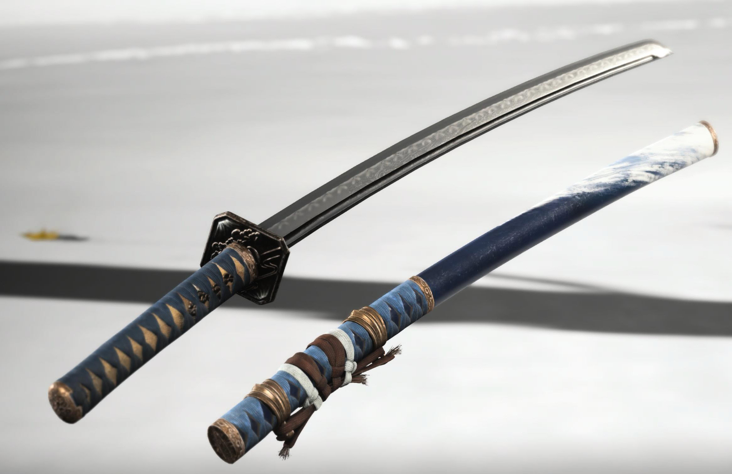 Yotei’s Charge features a simple navy blue sabbard with a brush of white at the tip. The grip and hanging cord combine other shades of navy blue with brass and white.