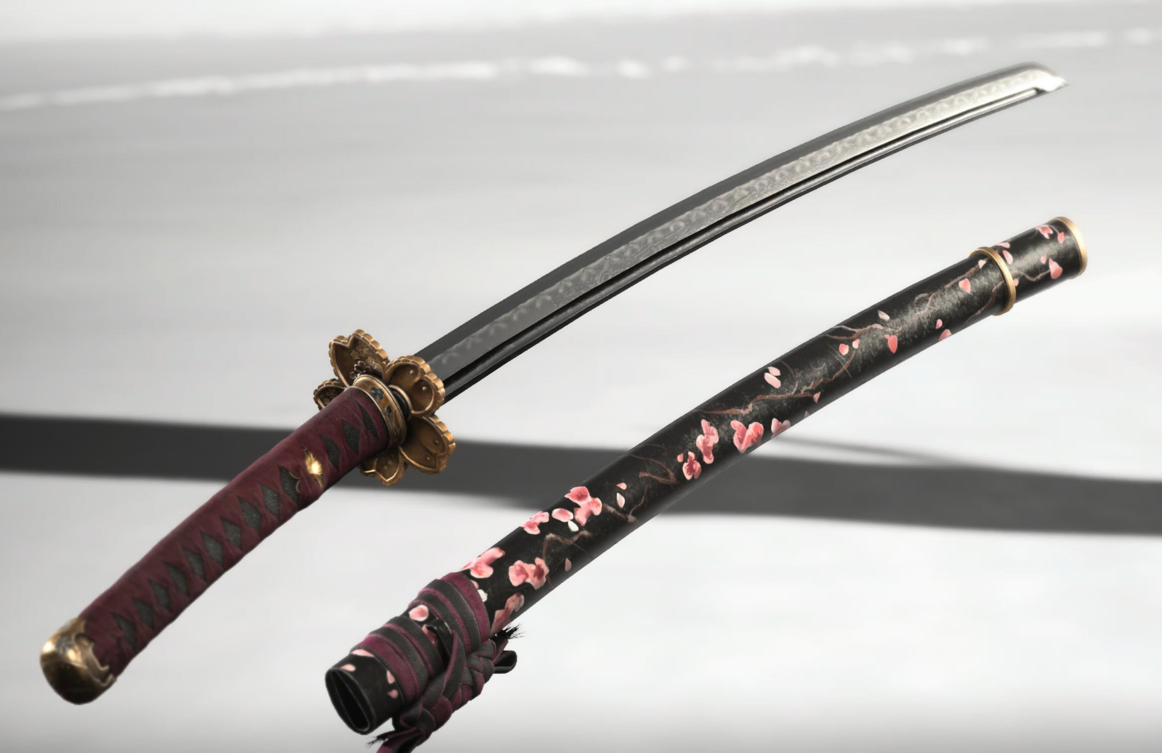 Sakura in Moonlight features painted sakura branches on a black background. The grip and hanging cord use a deeper maroon red with black underneath. The guard and caps are brass.