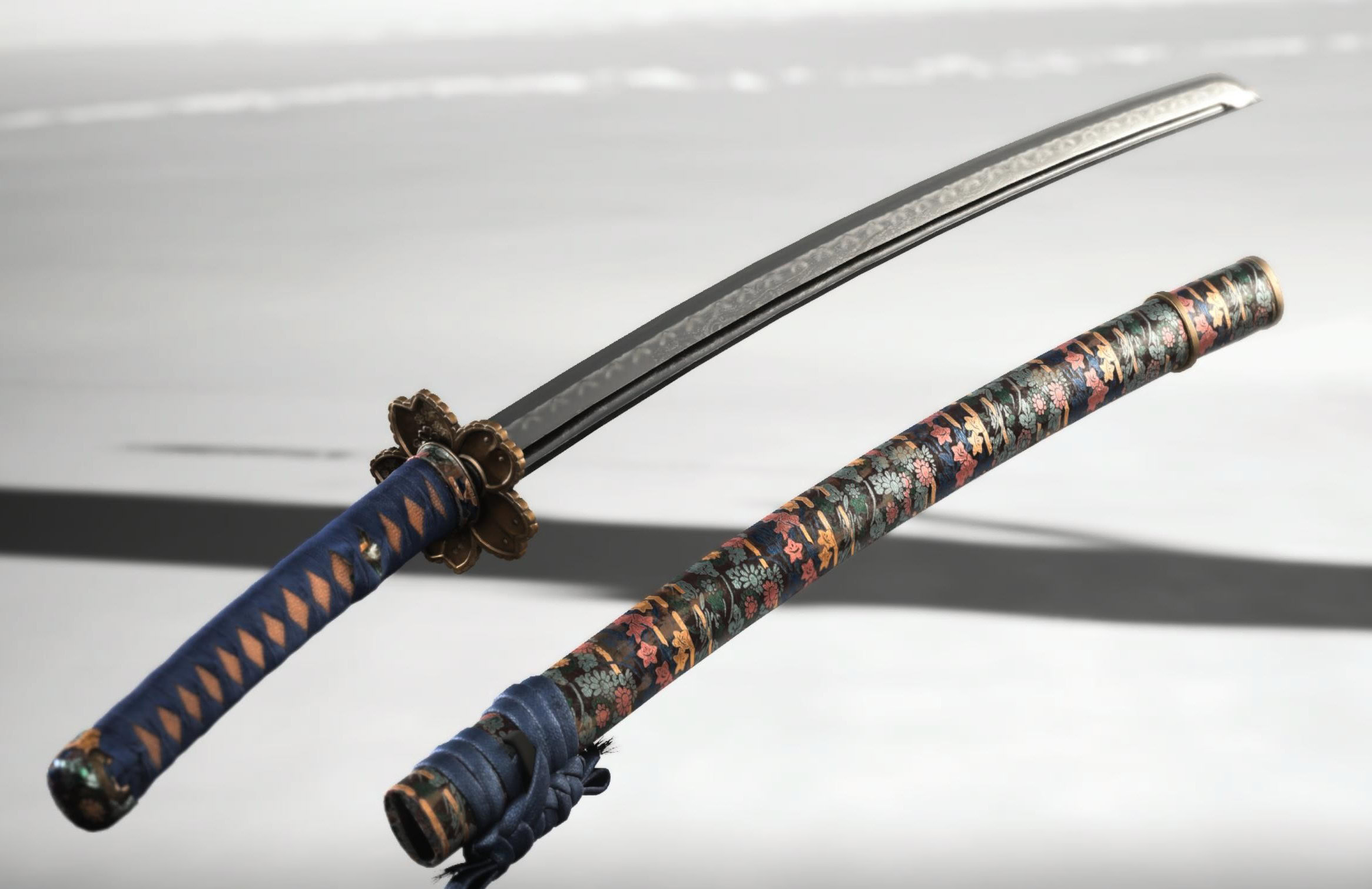 Silken Bloom features a repeating pastel floral pattern on the scabbard with brass accents and a navy blue grip and hanging cord.