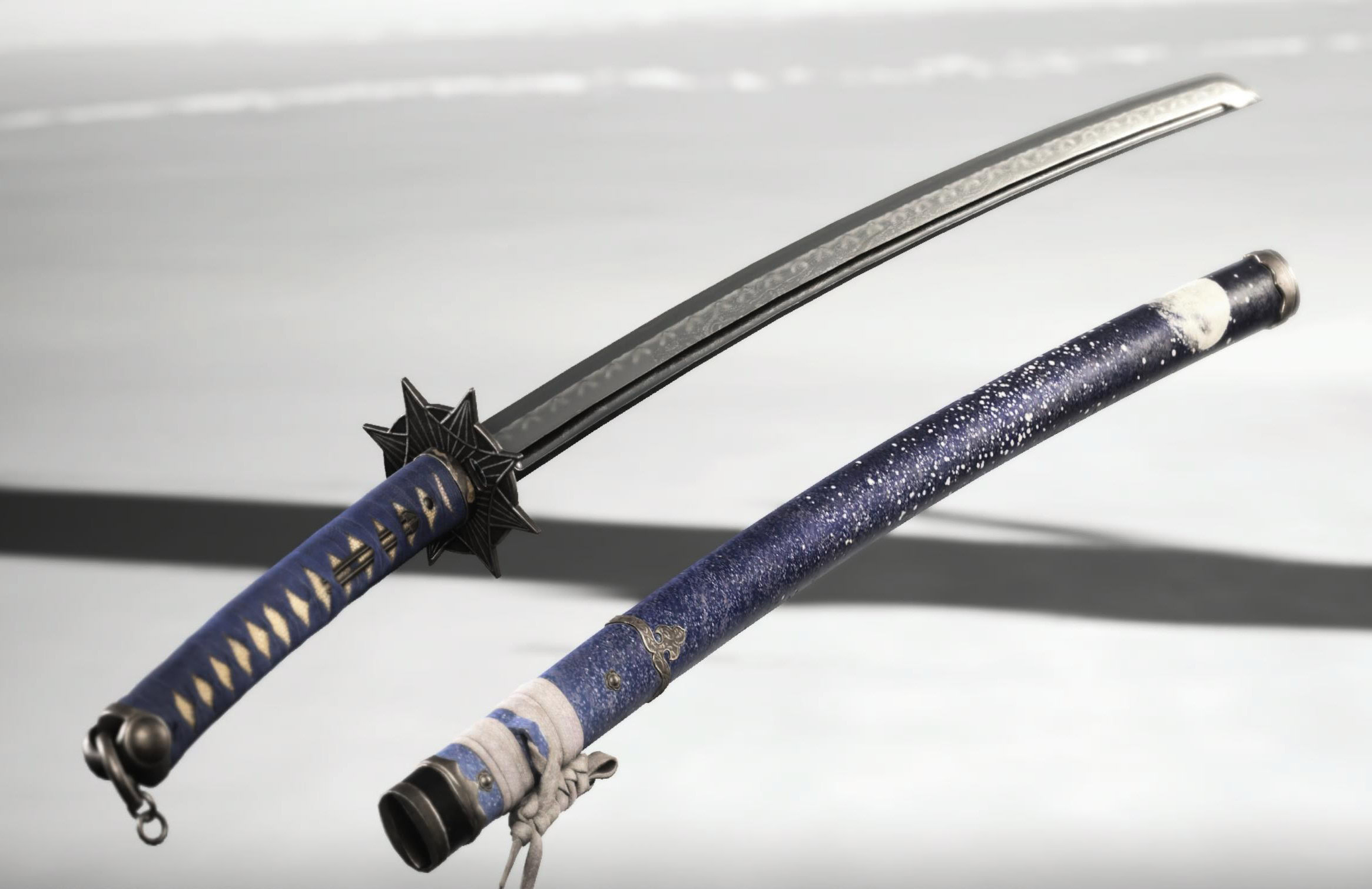 Starlight Abyss features a scabbard that looks like the night sky, using an indigo base and white paint dots for the stars and moon. Indigo continues onto the grip. The guard also looks like an 8-point star.