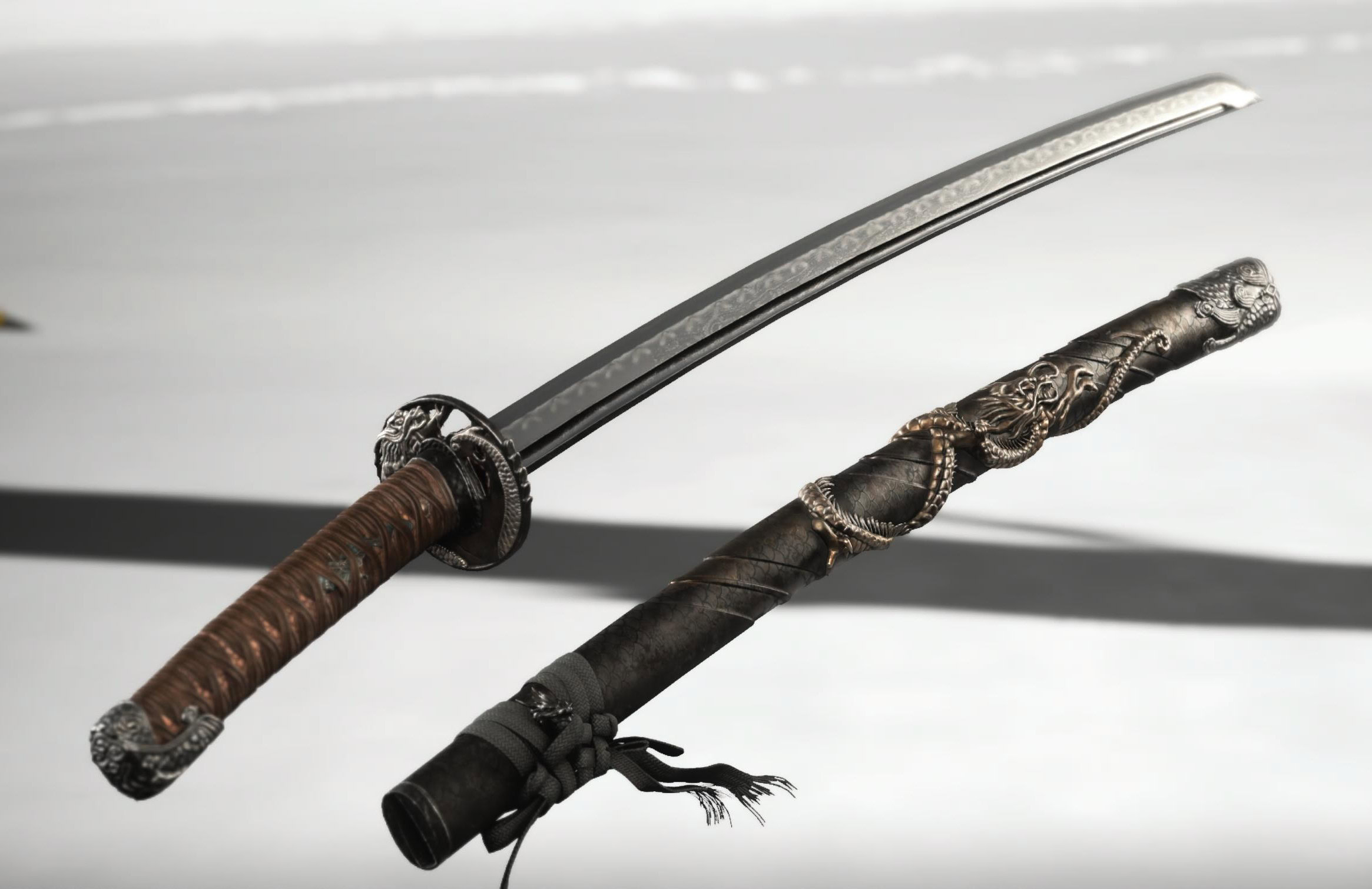 The Dragon’s Empire features an ornate gunmetal dragon embellishment coiled around a relatively simple black scabbard. The grip is brown leather and the hanging cord is a slightly paler black.