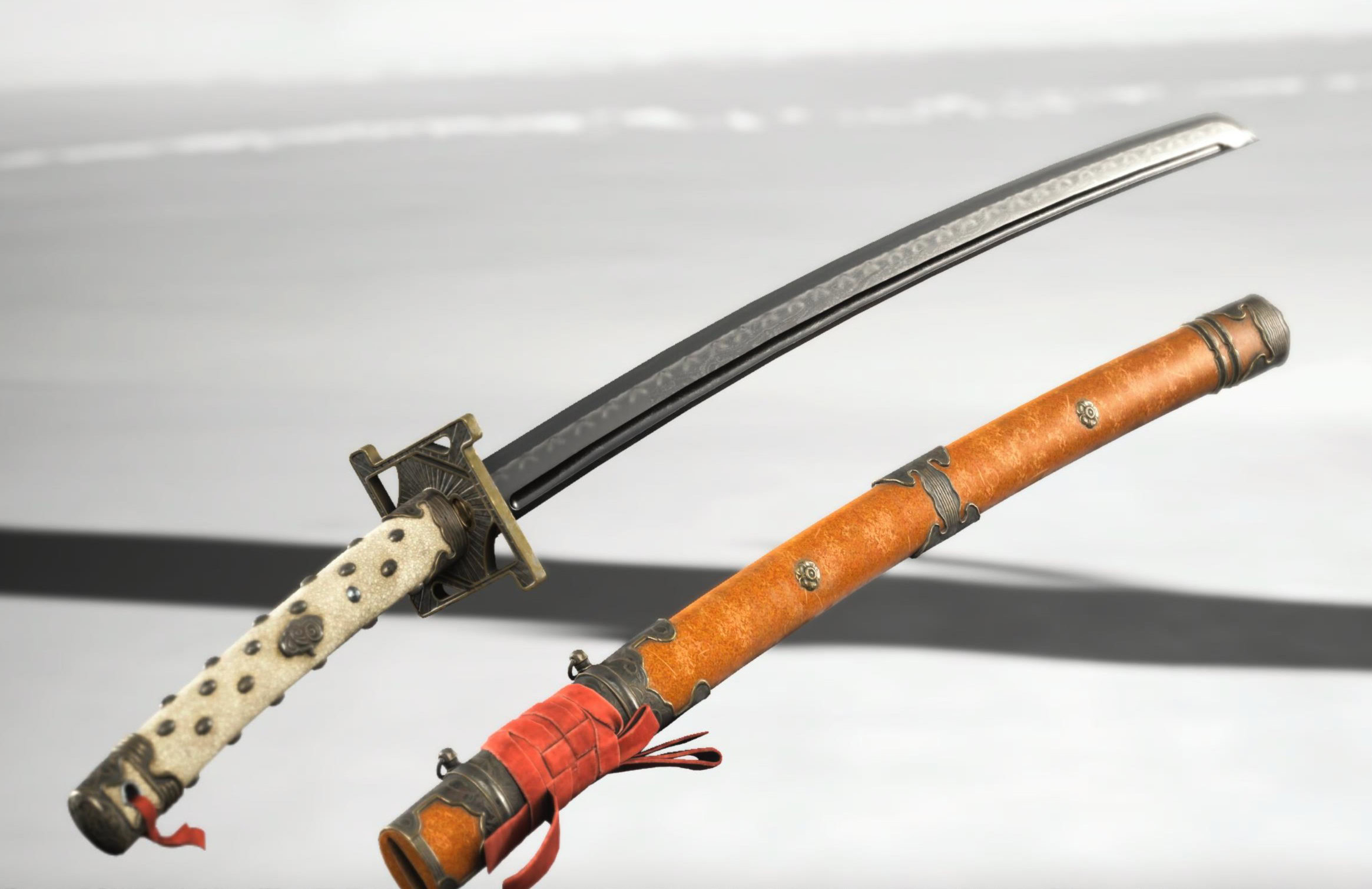 Tiger’s Fang is Lord Saito’s kit. It combines a faded orange scabbard with metal reinforcements, crimson peach hanging cord, and a white studded hilt.