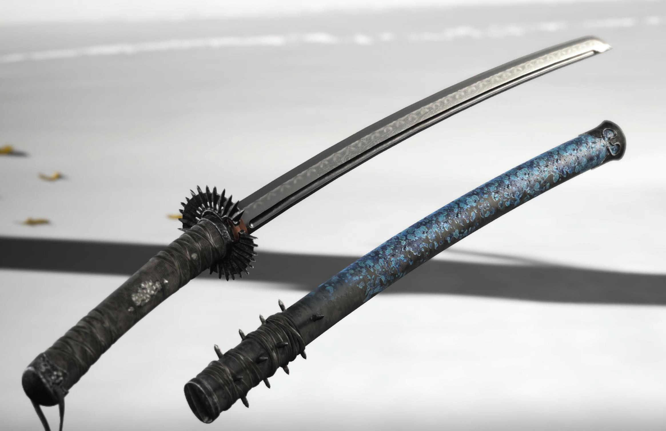 Toyotaro’s Fang features a black scabbard mostly corroded away to reveal blue underneath and spikes in place of a hanging cord. The grip is wrapped tightly in the same black color.