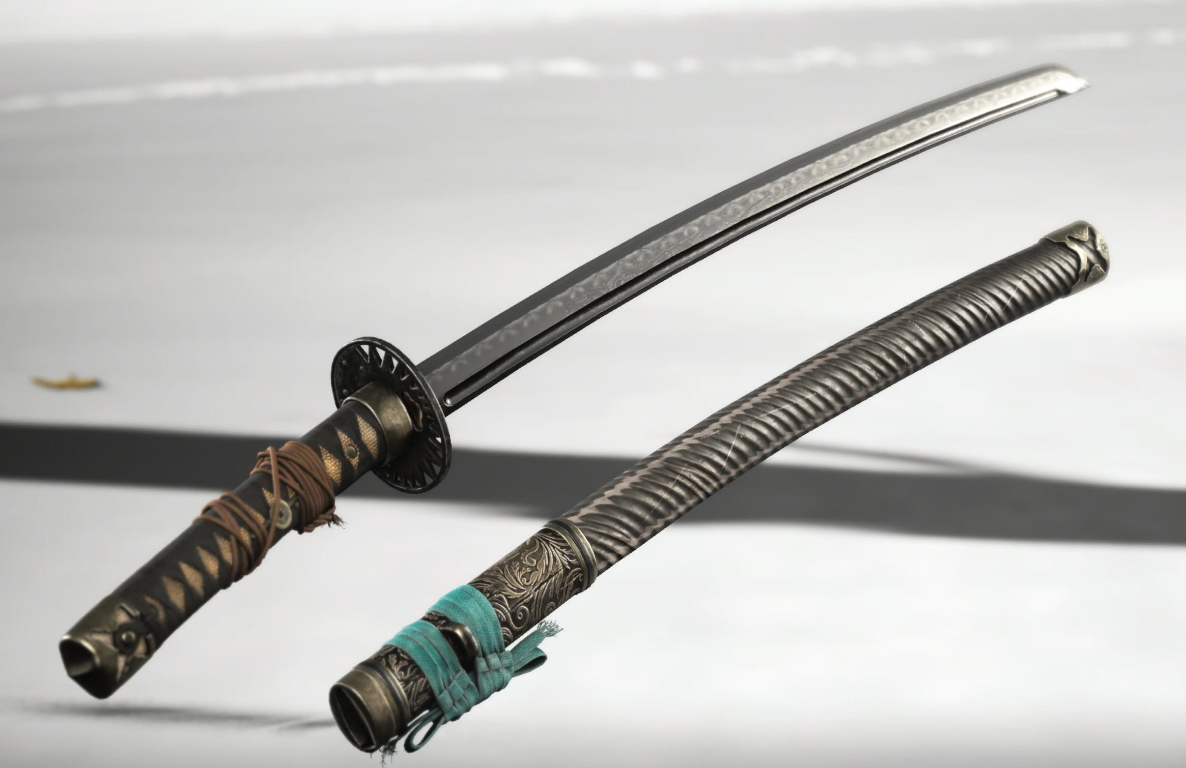 Yatagarasu’s Judgment features a screw-grooved metal scabbard with ornate etching covered by a teal hanging cord. The grip less eye-catching; it’s just black with some brown string wrapped around the center region.