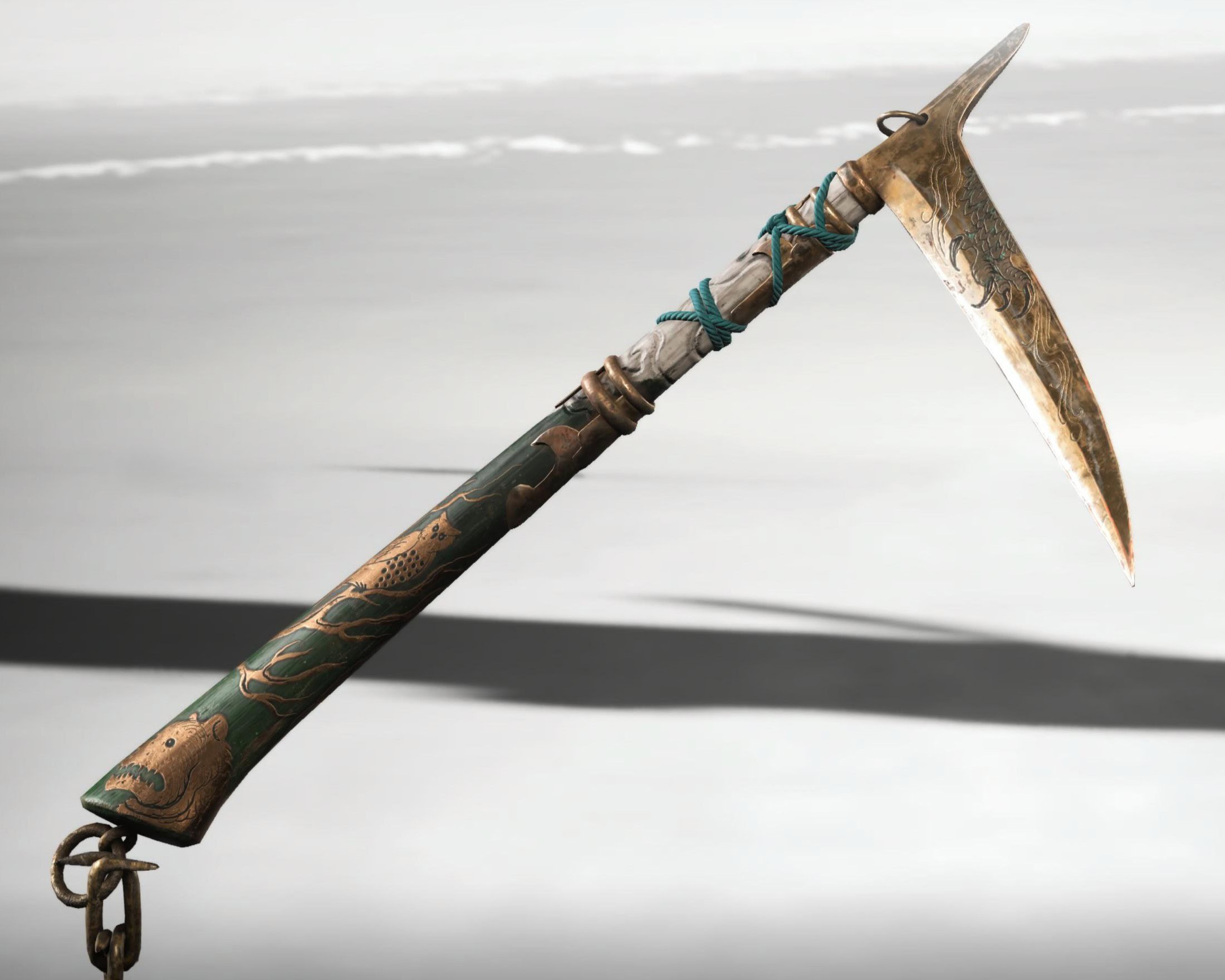 The Kusarigama of Master Enomoto features a golden etched sickle, teal handle, with decorative copper embellishments depicting different animals. The kit matches the color scheme of the Blades on a Stream dye on the Onryo Armor the best.