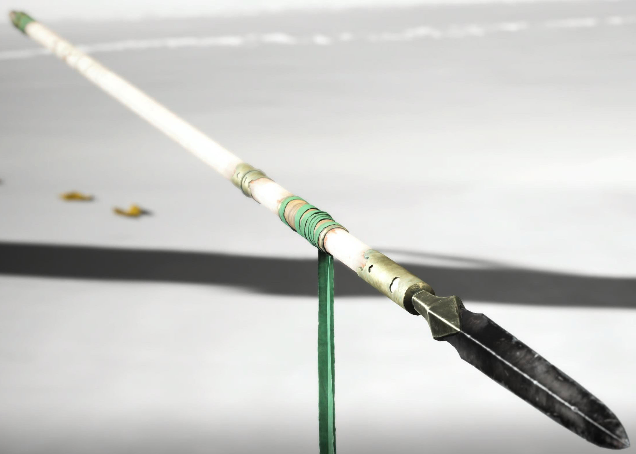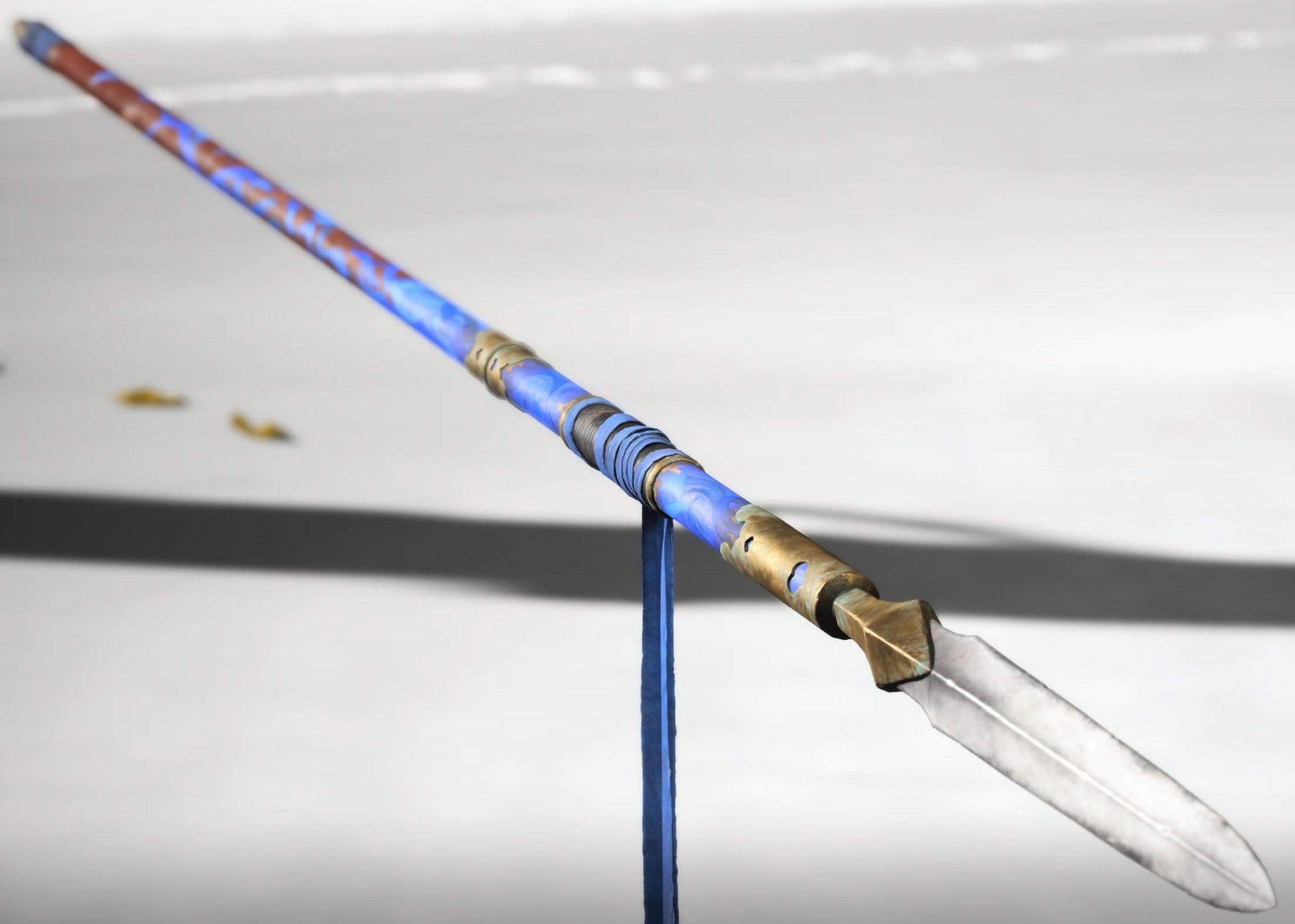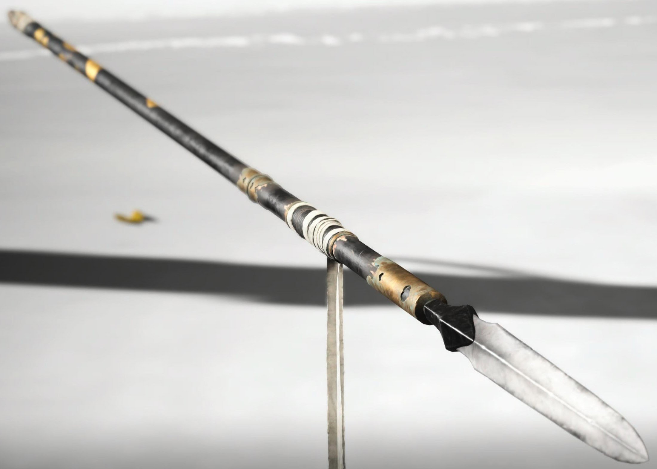 The Gambler’s Spear is black with gold accents and a bit of white fabric to complement the silver spearhead.