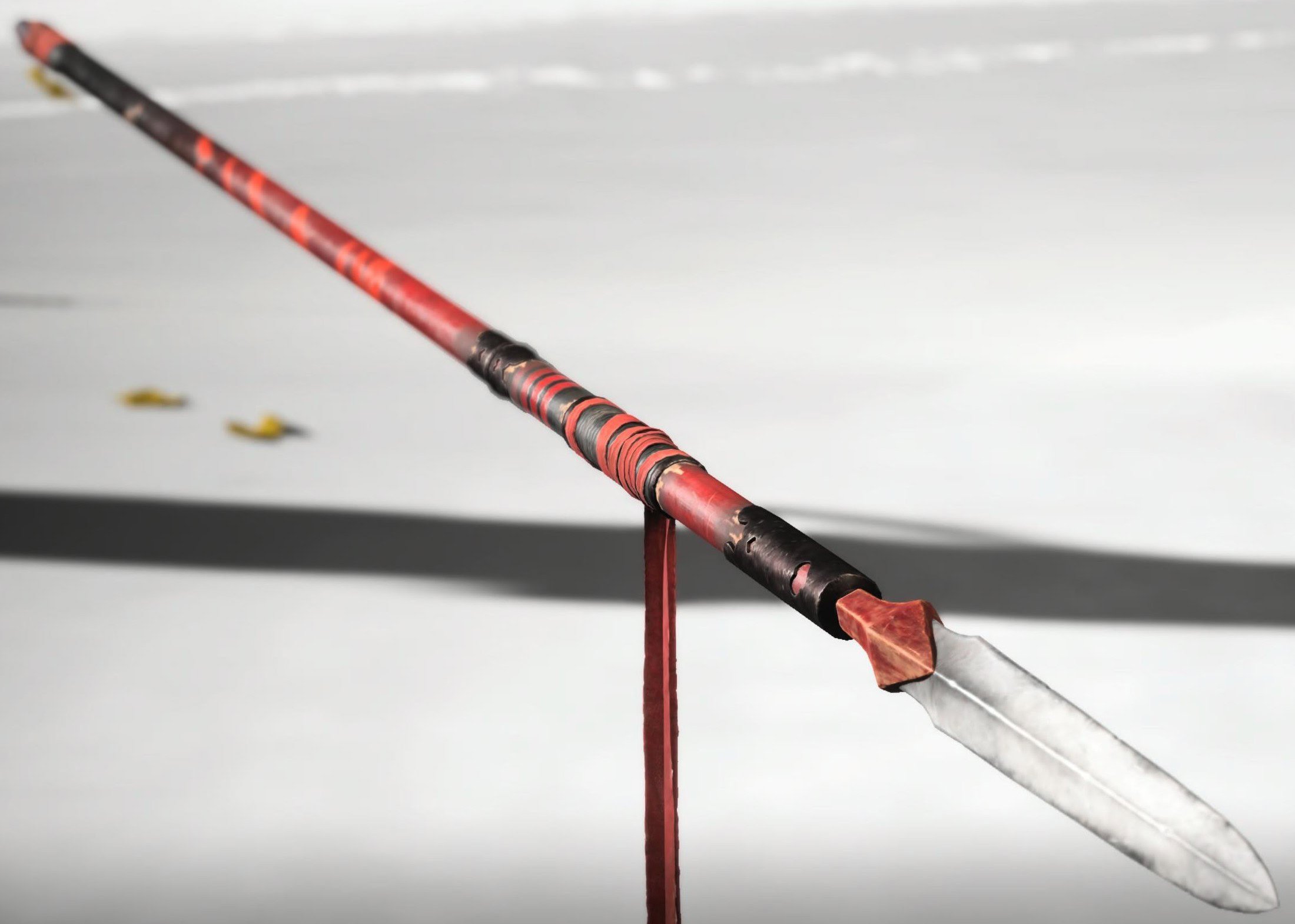 Scalding Spear is entirely red and black, save for the spearhead. The colors are pretty striking compared to most other weapon kits.