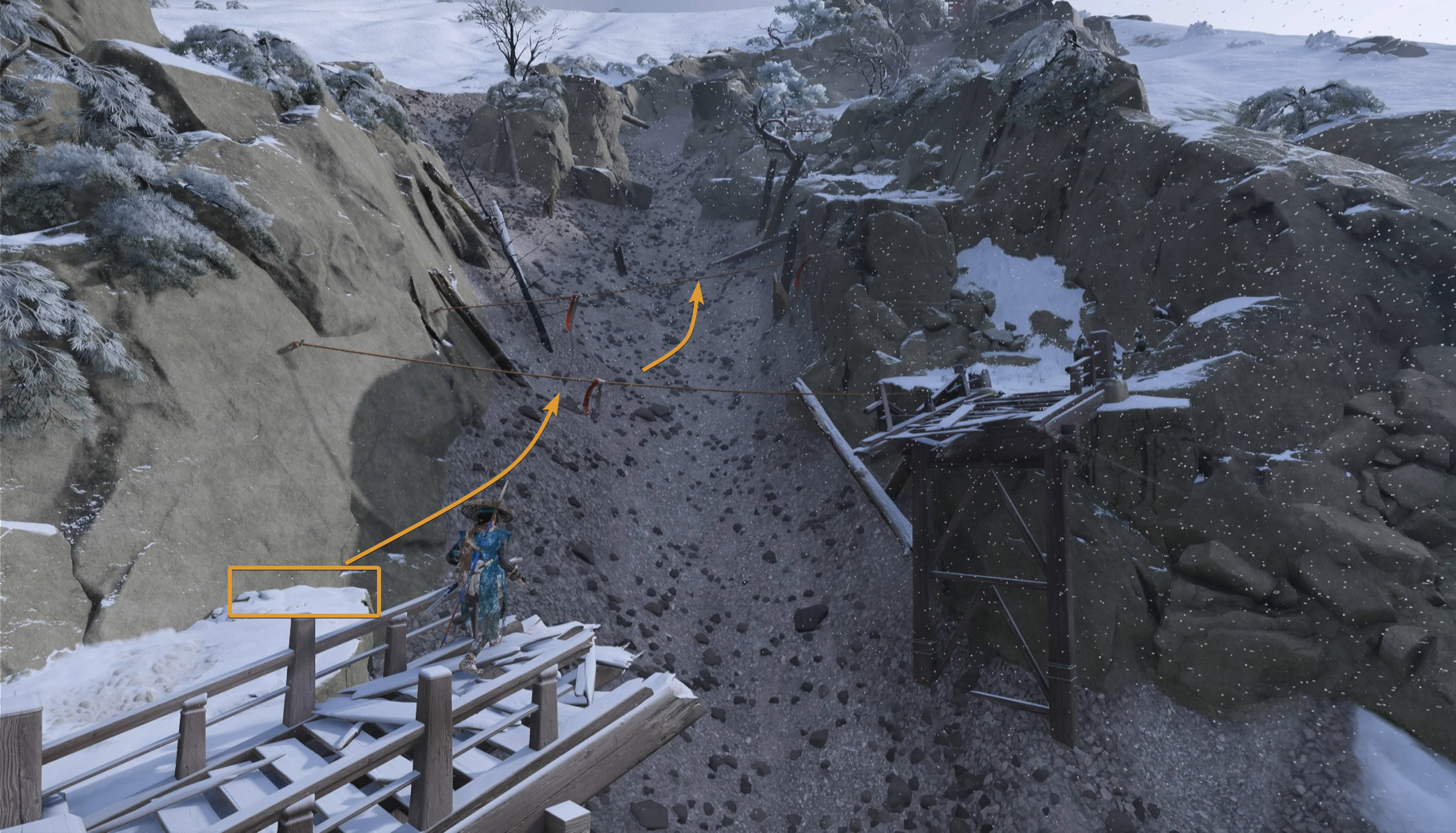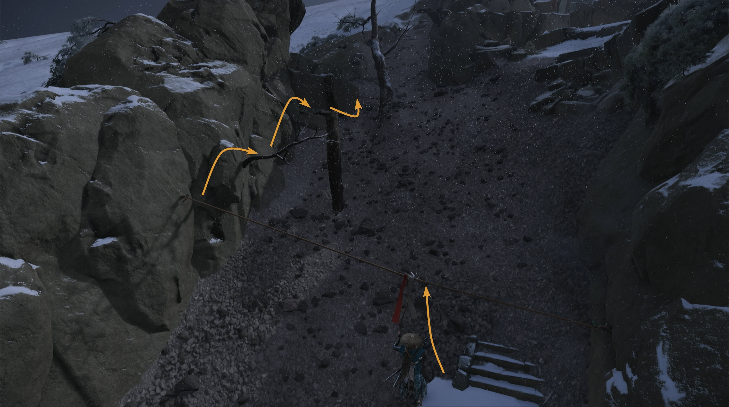 Once you reach the second rope, climb up the rocky ledge, jump across the gap, climb the white rocks on the wall, and grapple onto the support beam with the white flag.