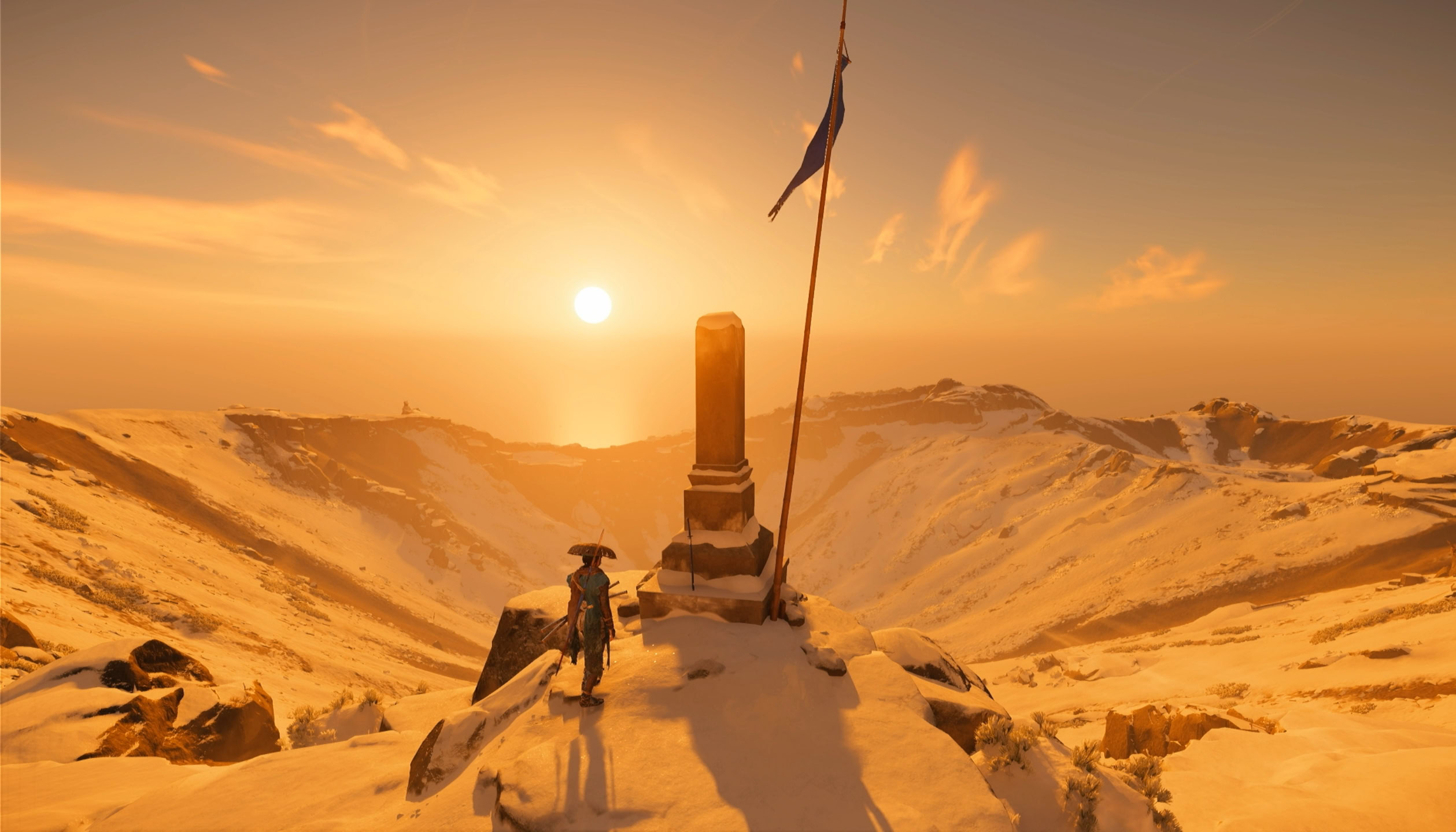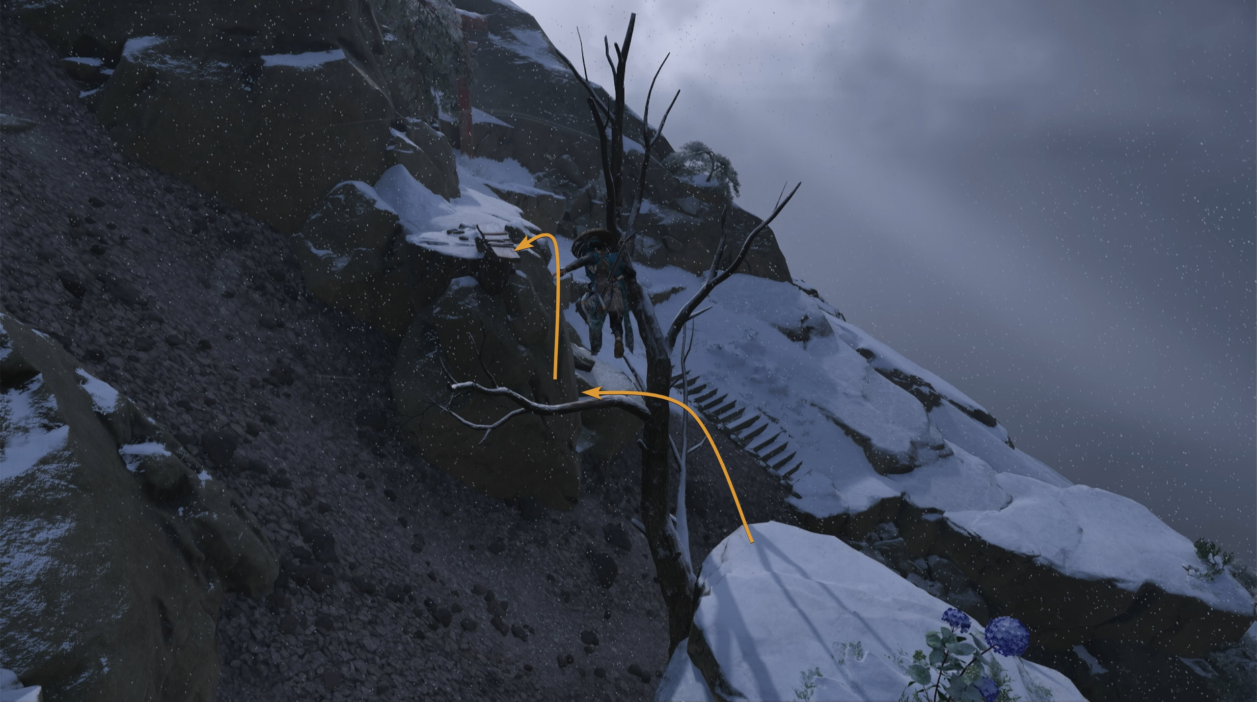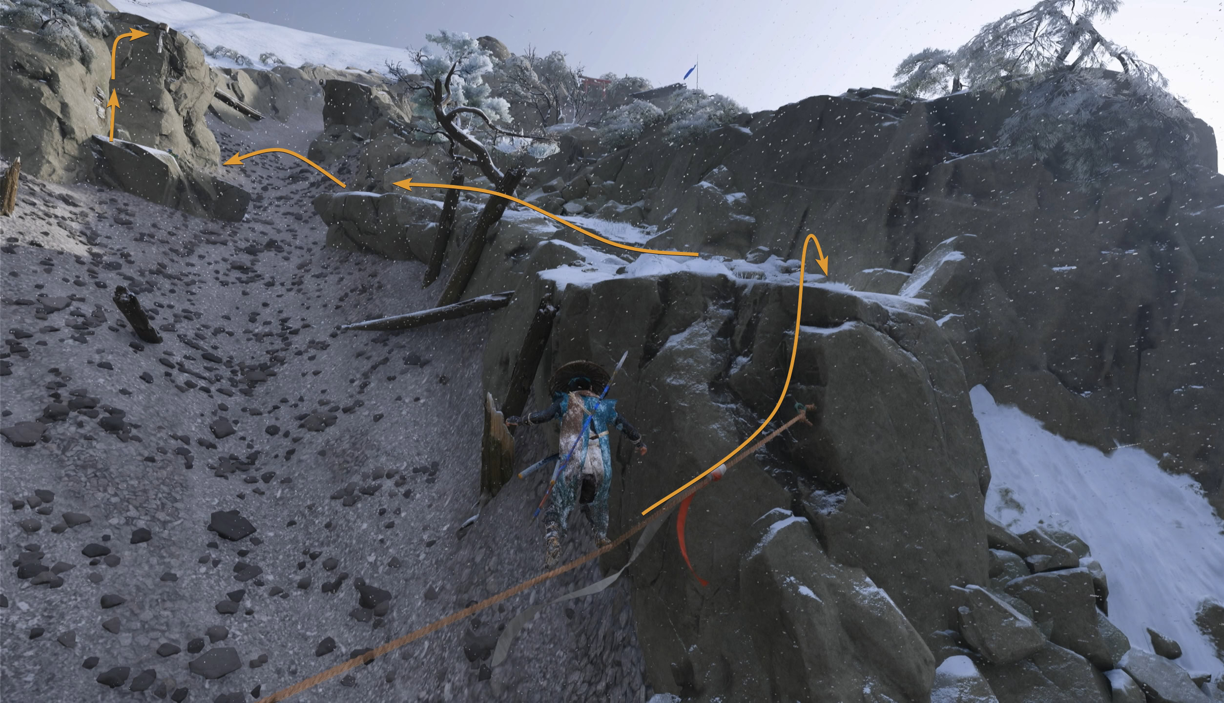 Keep following the path ahead until you reach a large slope near a blue flag. Slide down and grapple onto the rope and keep climbing to reach the top of Mount Yotei.