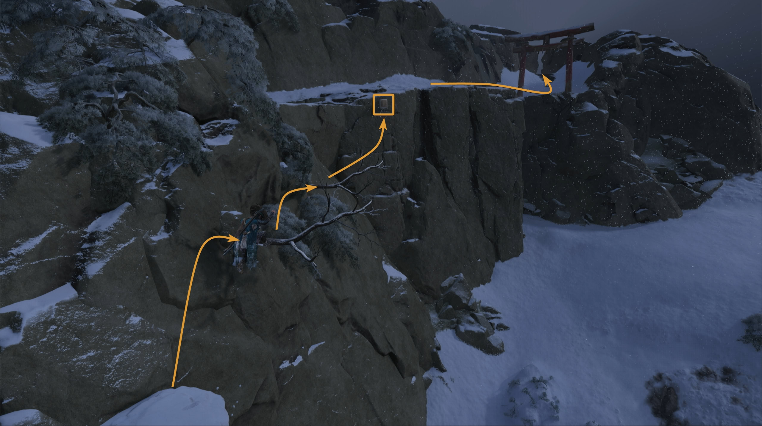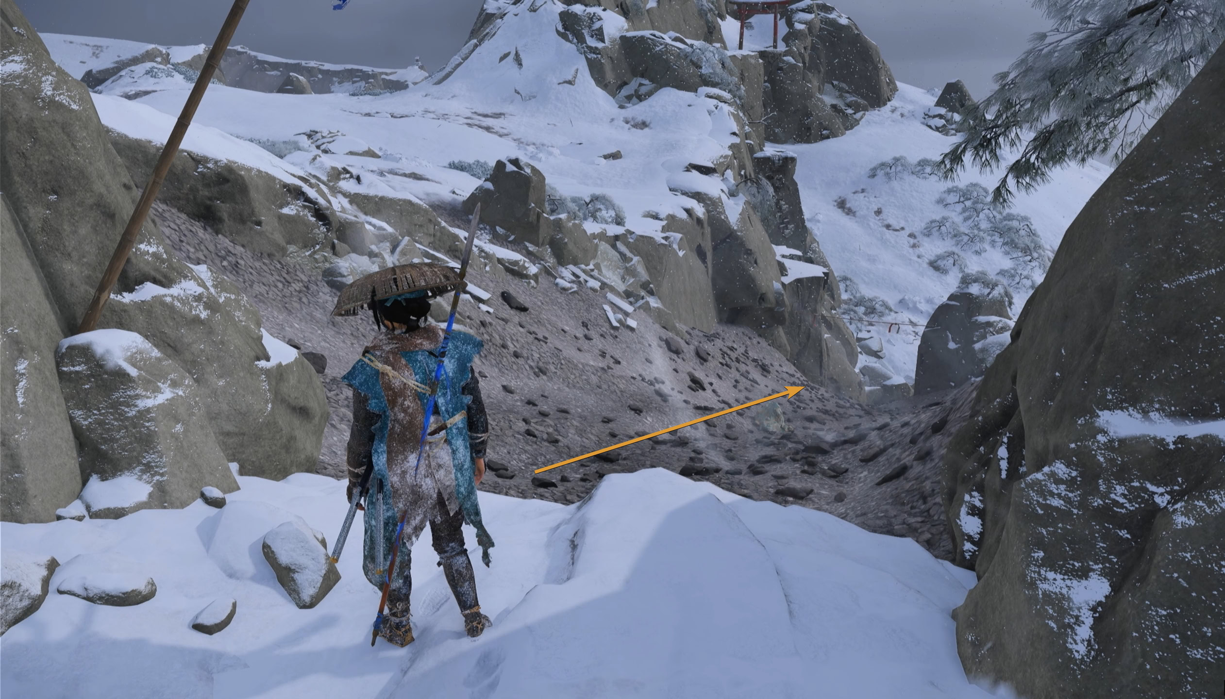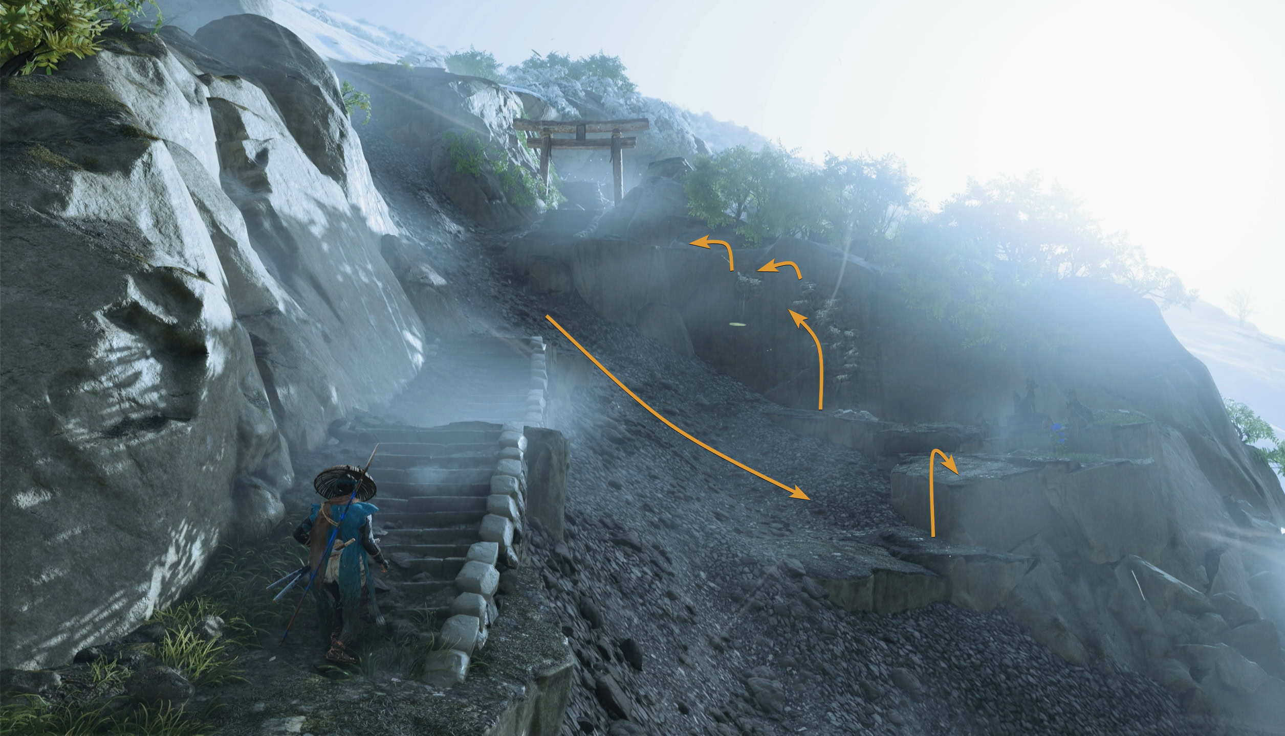 Go up the stairs, slide down the slope, go up the ledges and climb the rocks to reach the torii gate ahead.