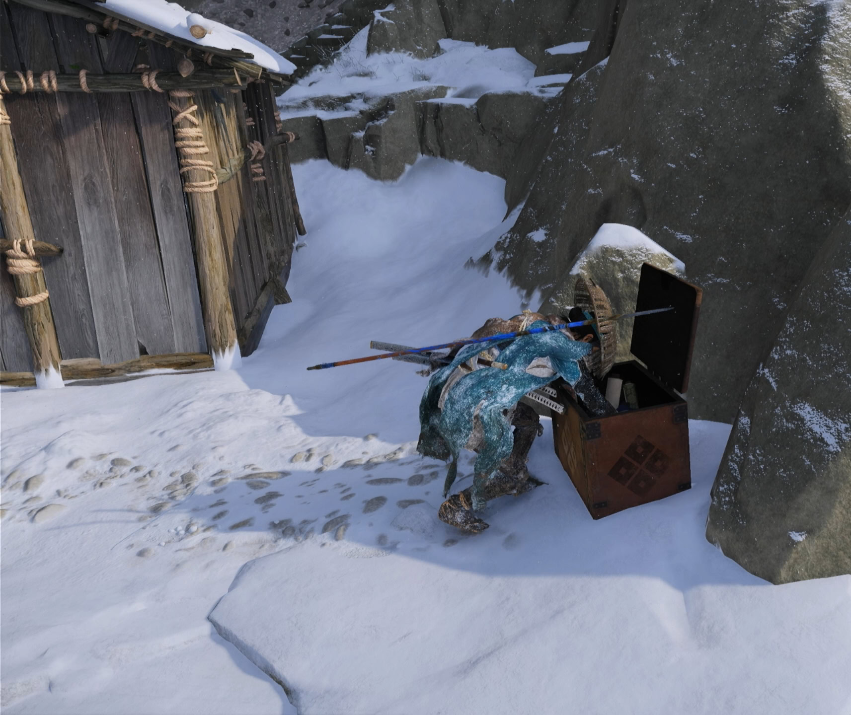 Grapple onto another support beam up ahead and you’ll run into an abandoned rest house. Behind it is a small chest with some basic supplies.