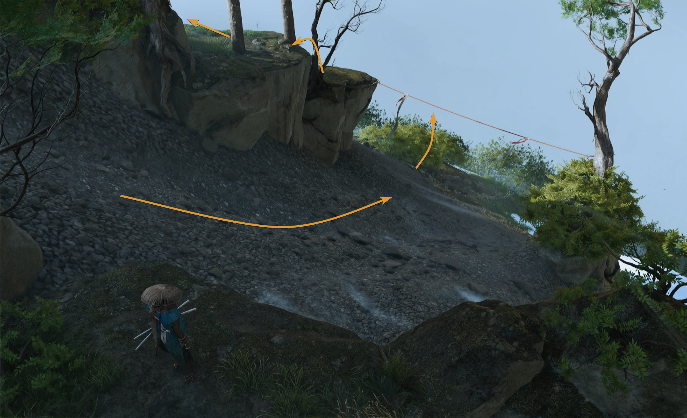 Follow the path as it’s straightforward until you reach another large slope. Jump off the rocky ledge and grapple onto the first rope. Climb up and jump to the second rope.