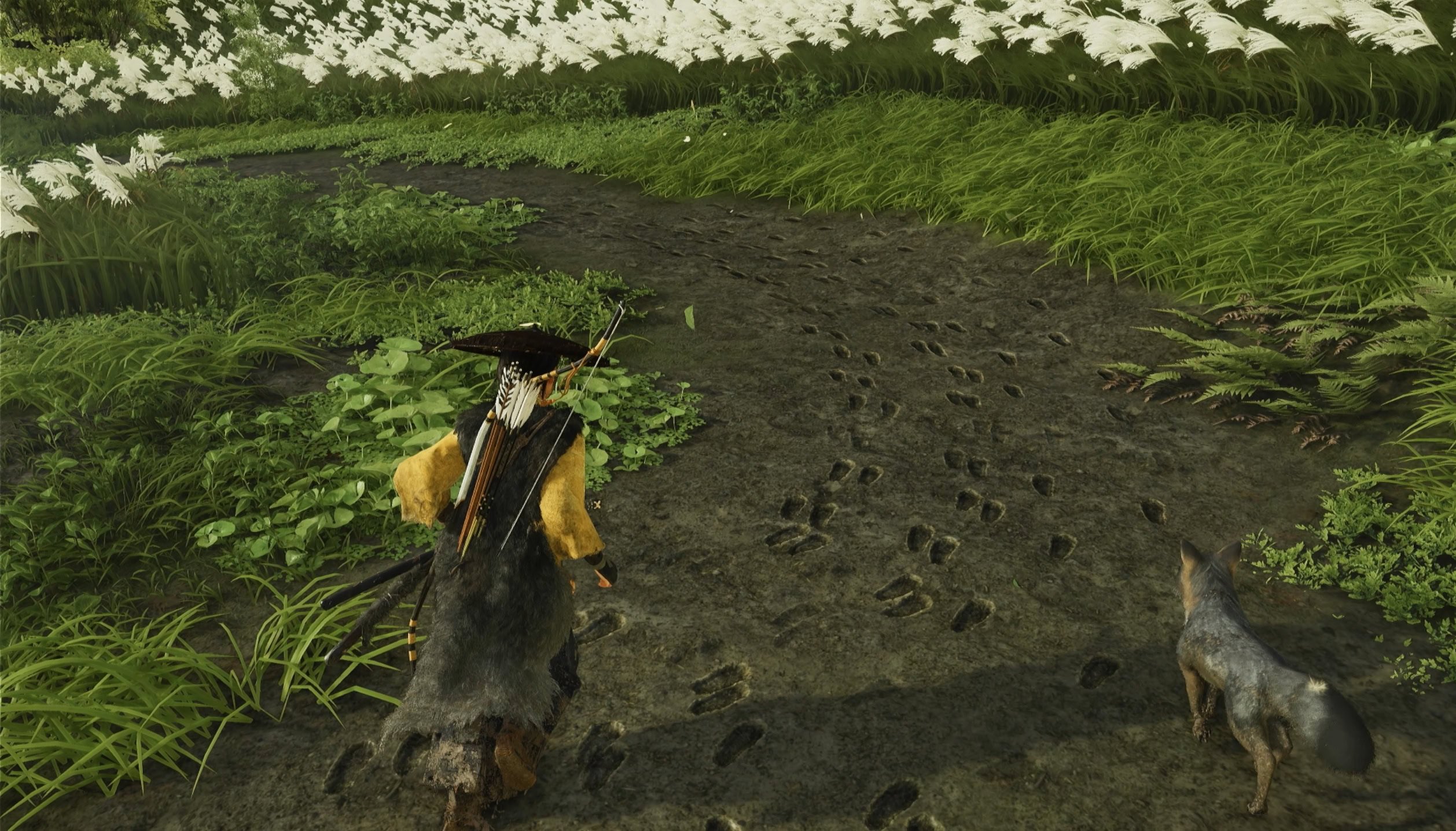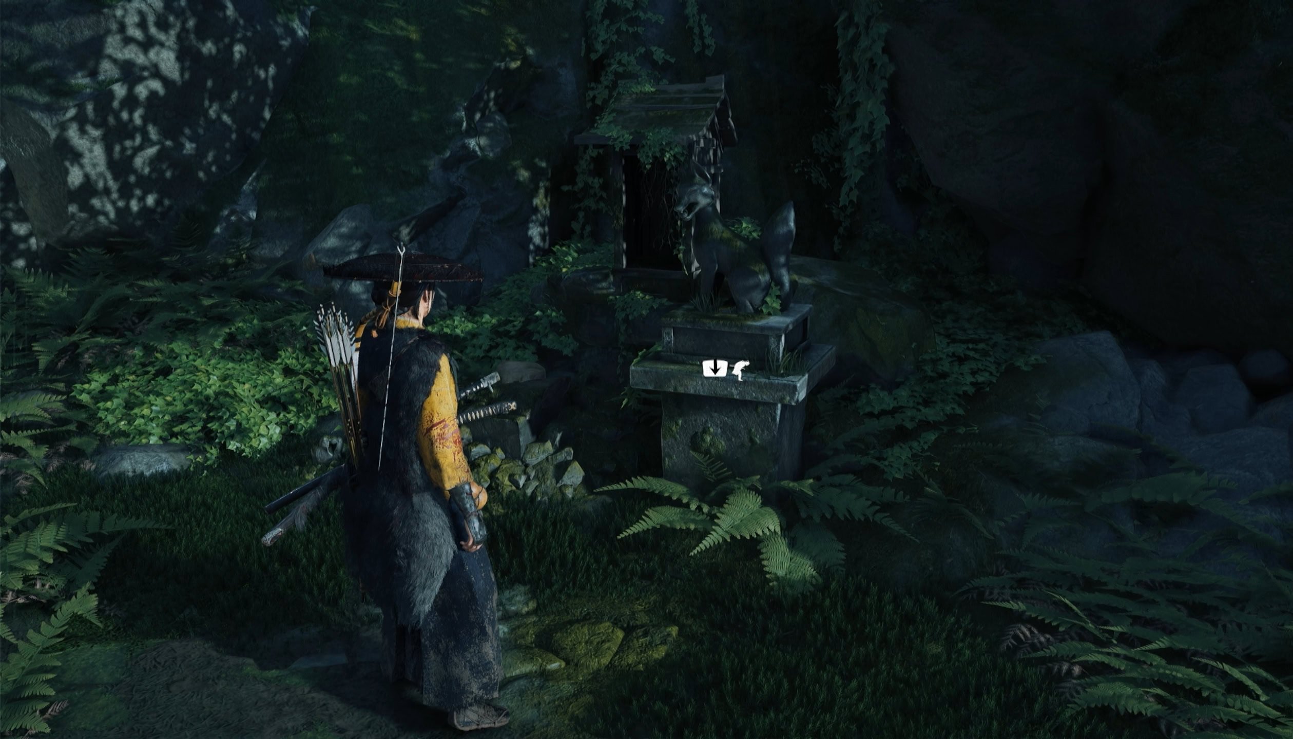 Go upstairs to the Forgotten Shrine, cut through the thing bamboo to the right, and bow at the Fox Altar. This will summon a gray fox that will help guide you forward.