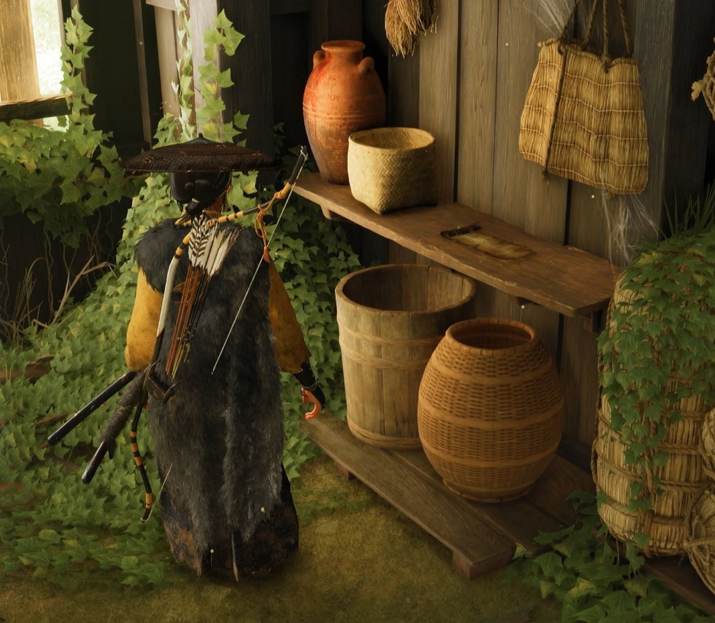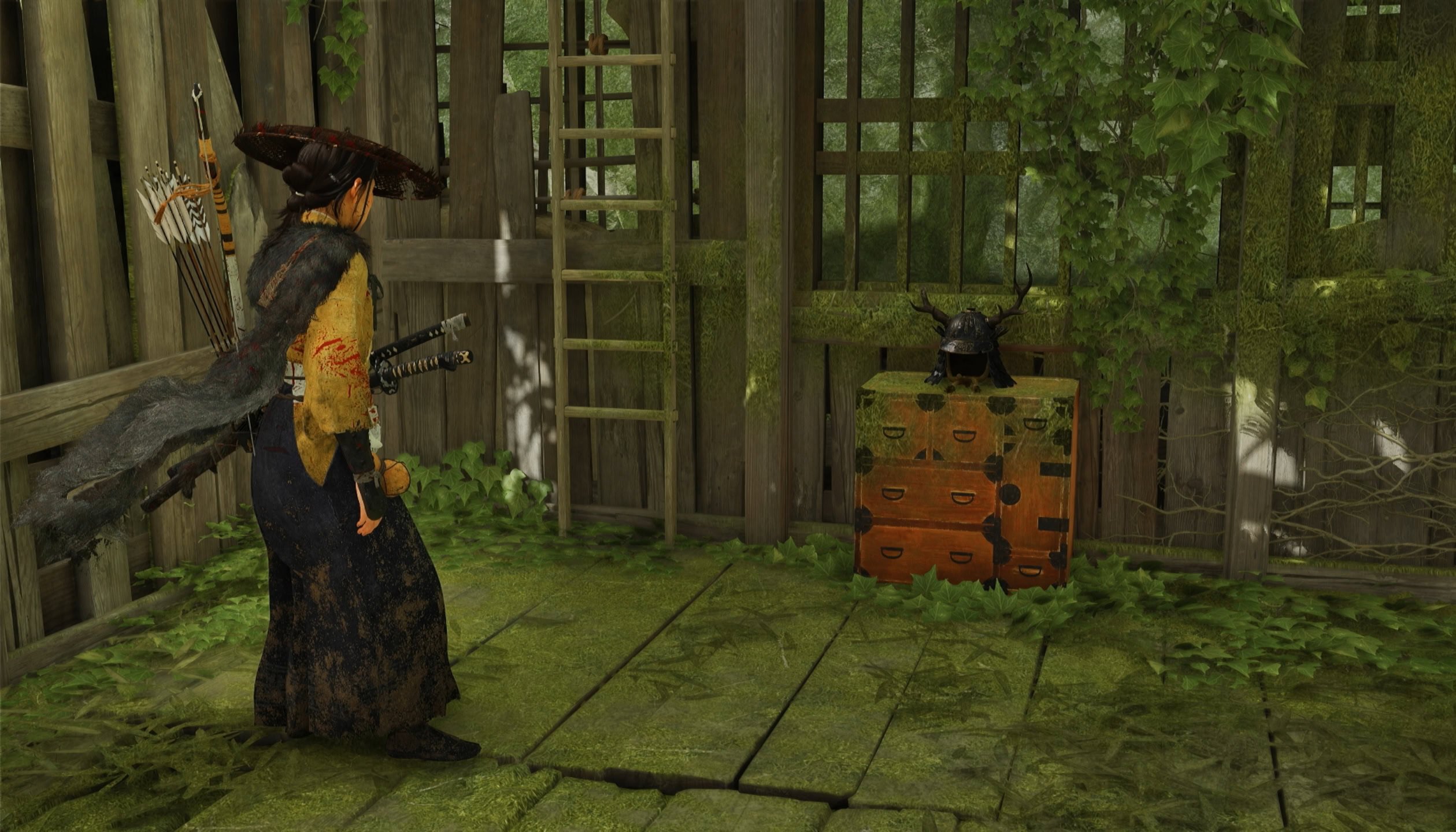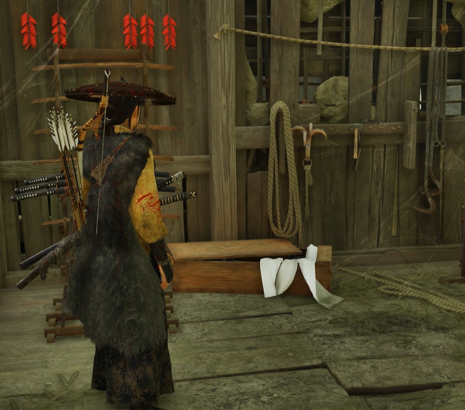 On the wall next to the crates of armor, you’ll find Jin’s grappling hook, the same one that the blacksmith Taka from Ghost of Tsushima made.
