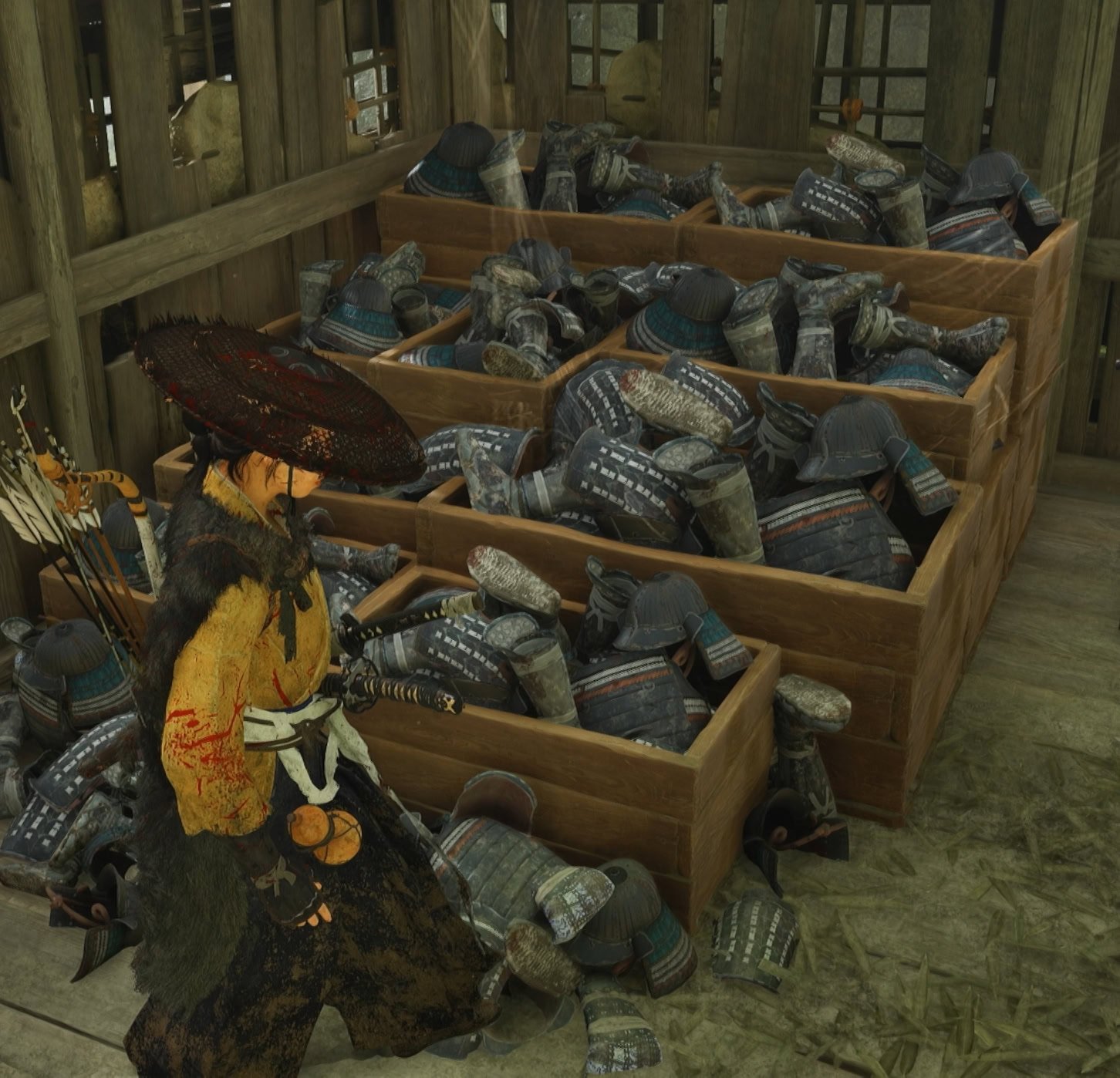 Atsu comments on the crates of armor, it’s likely Jin was training others in combat for a likely conflict with the Shogun or Clan Shimura should they find his hiding spot.