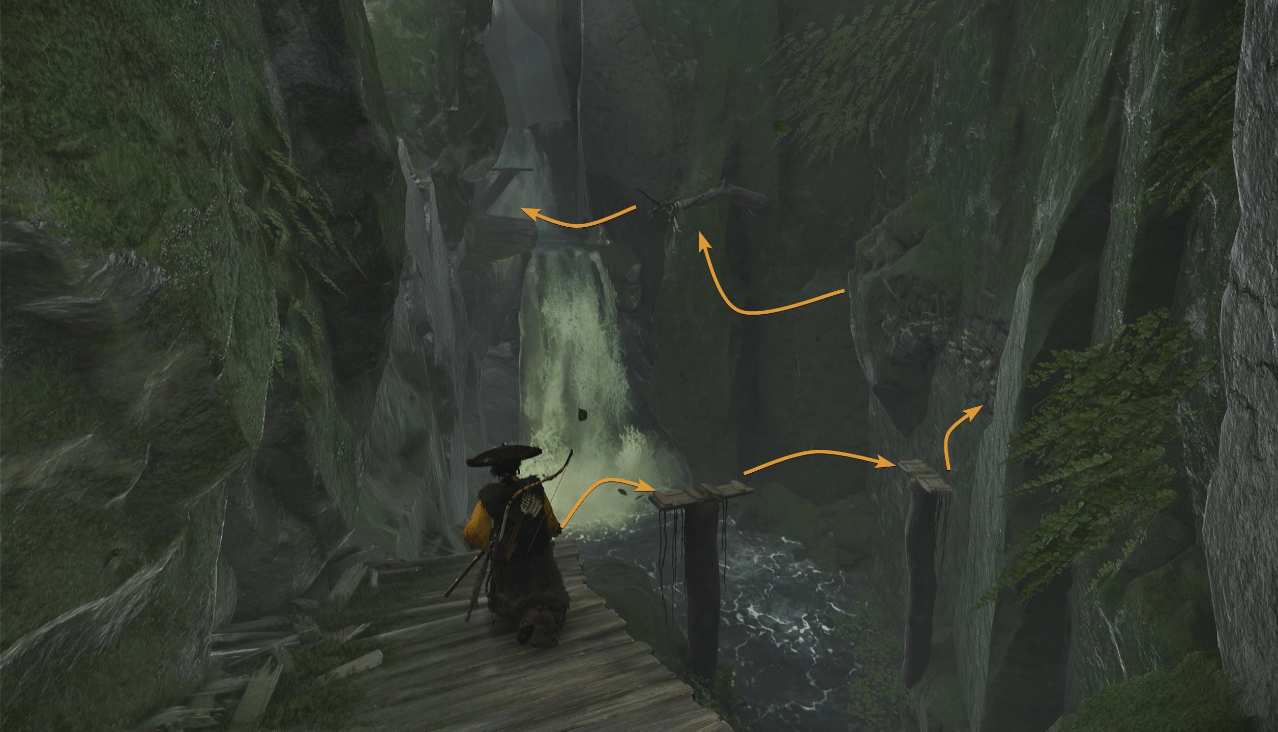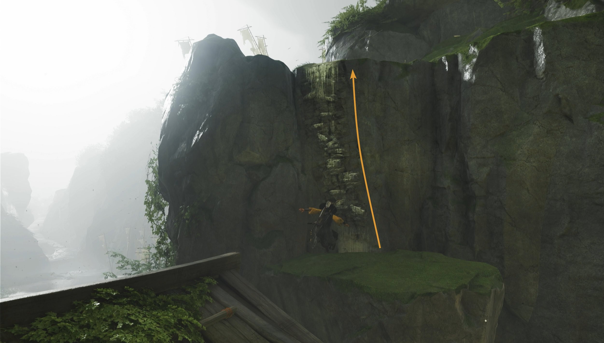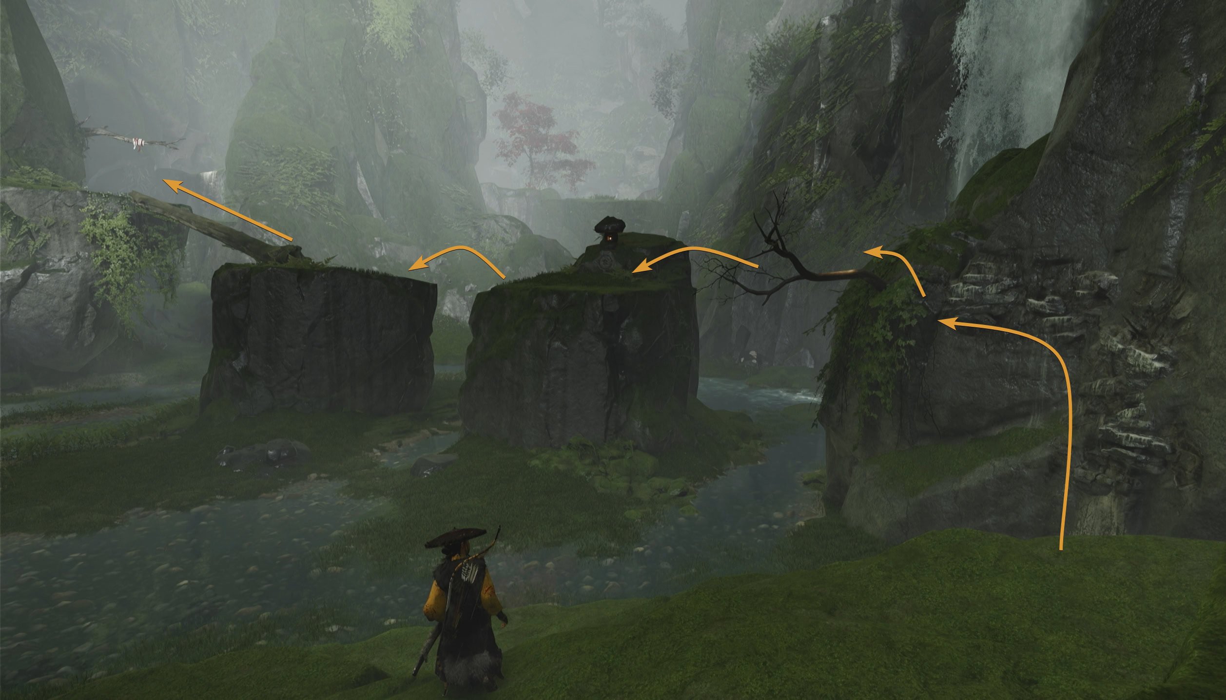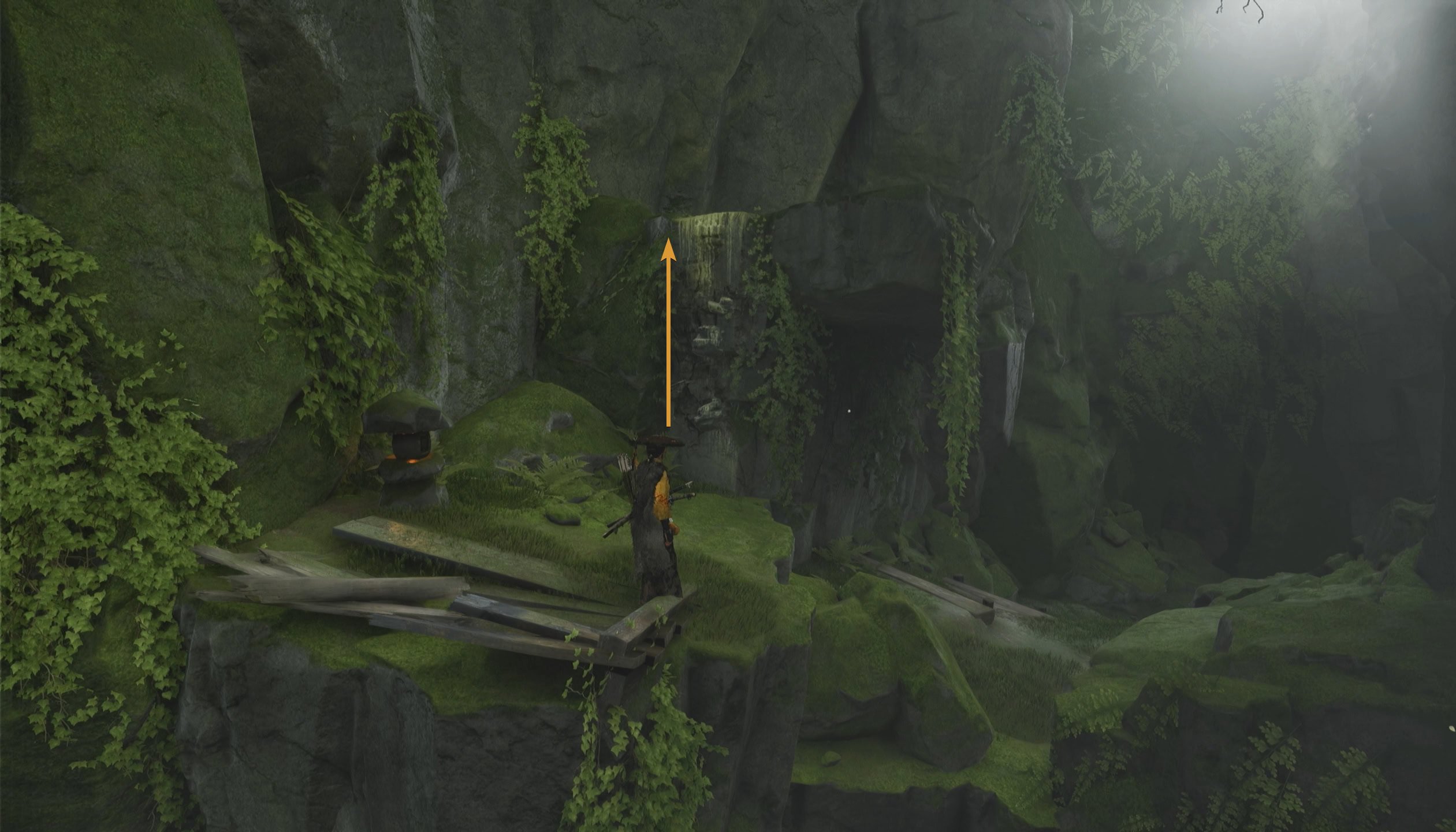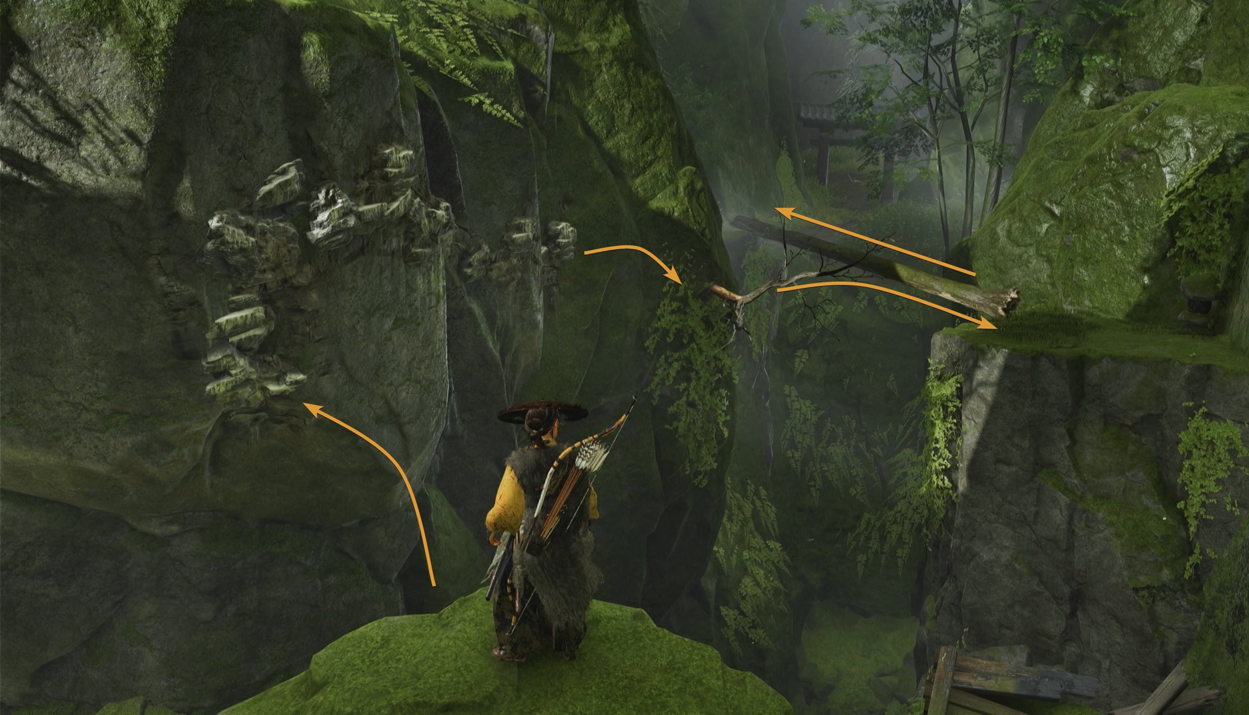When you reach the broken bridge, turn around and climb up the rocks behind you. Continue platforming your way to the torii gate ahead and you’ll find an old building.