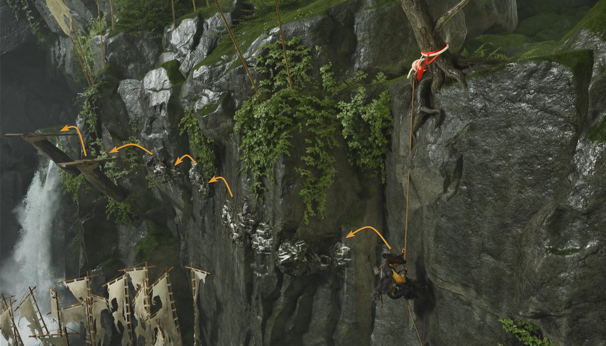 Go up the ladder, climb the rocks, grapple down the stump and platform your way to the waterfall. Inside the cave you’ll find the Storm Blade.