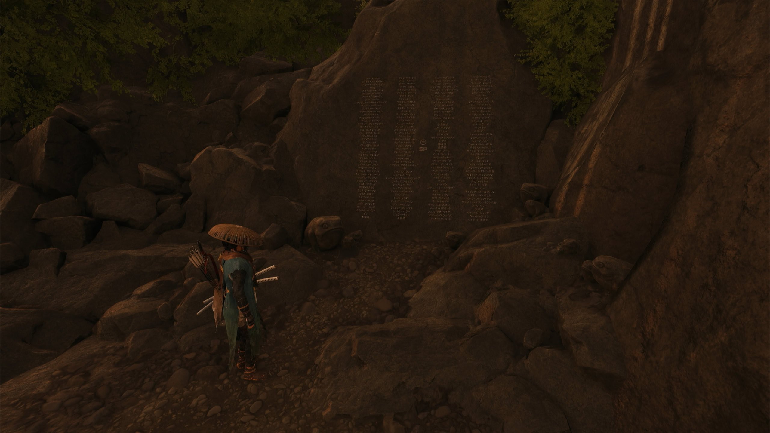 After completing the mission, go towards the direction that Ugestu came from. You’ll find a path that leads to the shore where you can find a list of names written in Japanese Kanji and Katana.