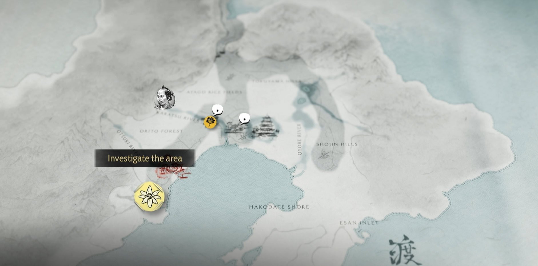 You’ll need to find Ugetsu the Storyteller in southwest Oshima Coast. His camp is south of Oiso Fishing Village and the Otsuki River. Talk to him to learn that he doesn’t know which story belongs to the sword hidden here.