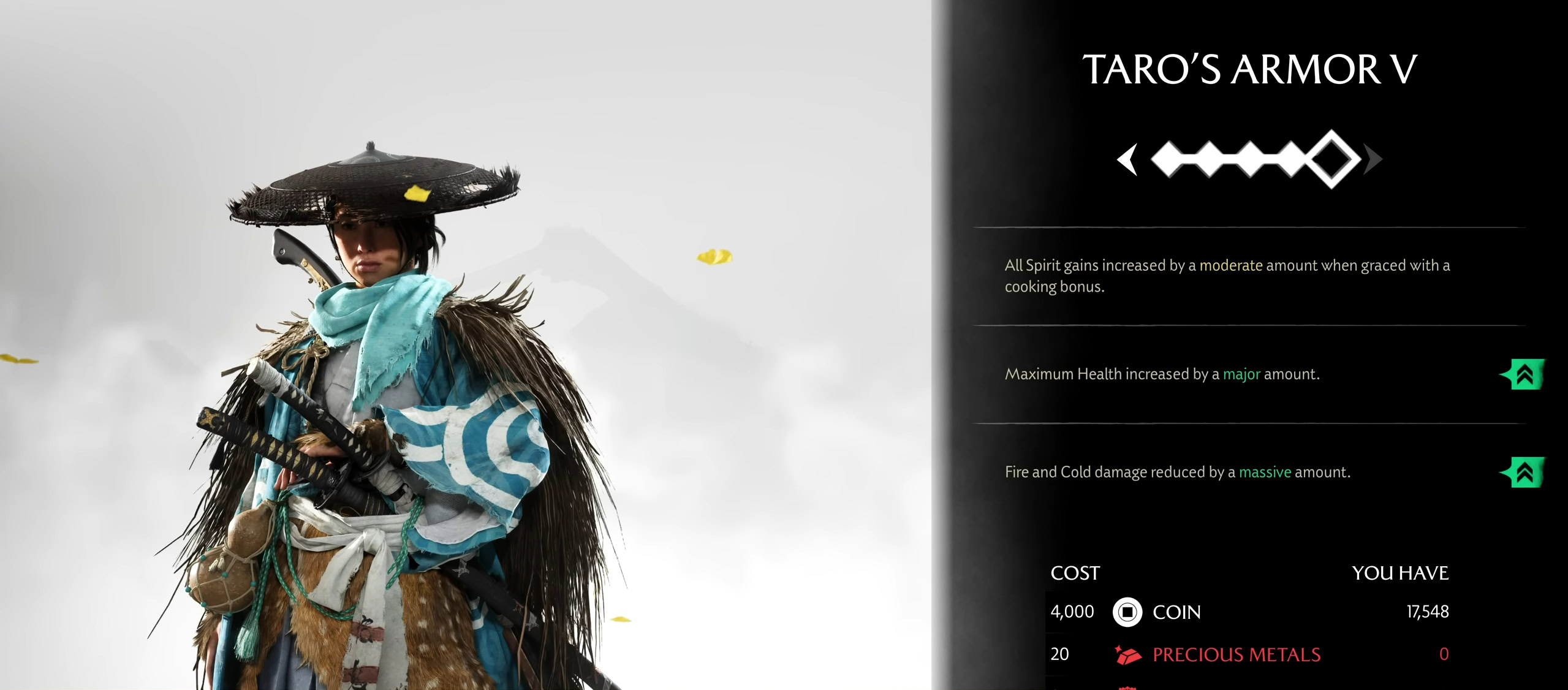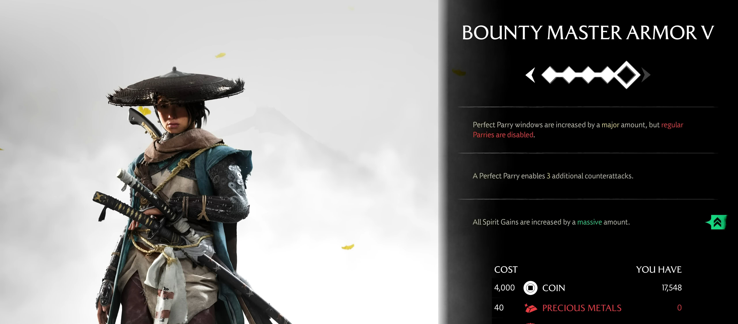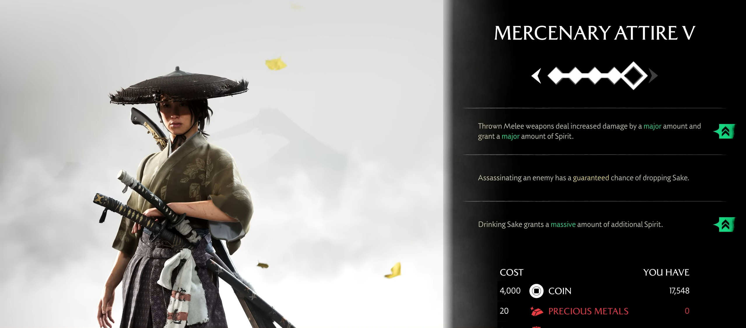 The Mercenary Attire will have Thrown Melee Weapon damage increased by a major amount and grant a major amount of Spirit (both of which increased from moderate). Additionally, drinking Sake will grant a massive amount of additional Spirit.
