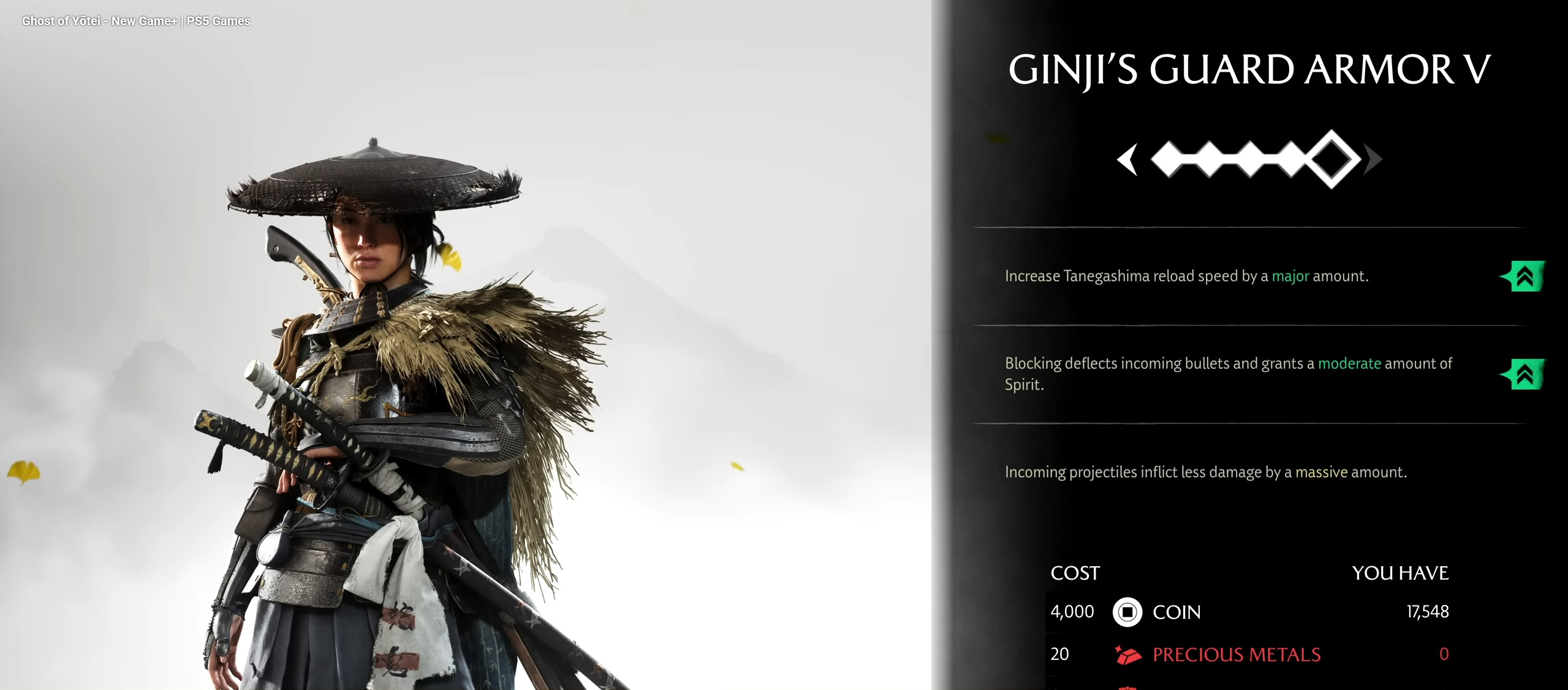 At max rank with Ginji’s Guard Armor, your Tanegashima reload speed increases by a major amount and deflecting bullets goes from granting a minor amount of spirit to a moderate amount.
