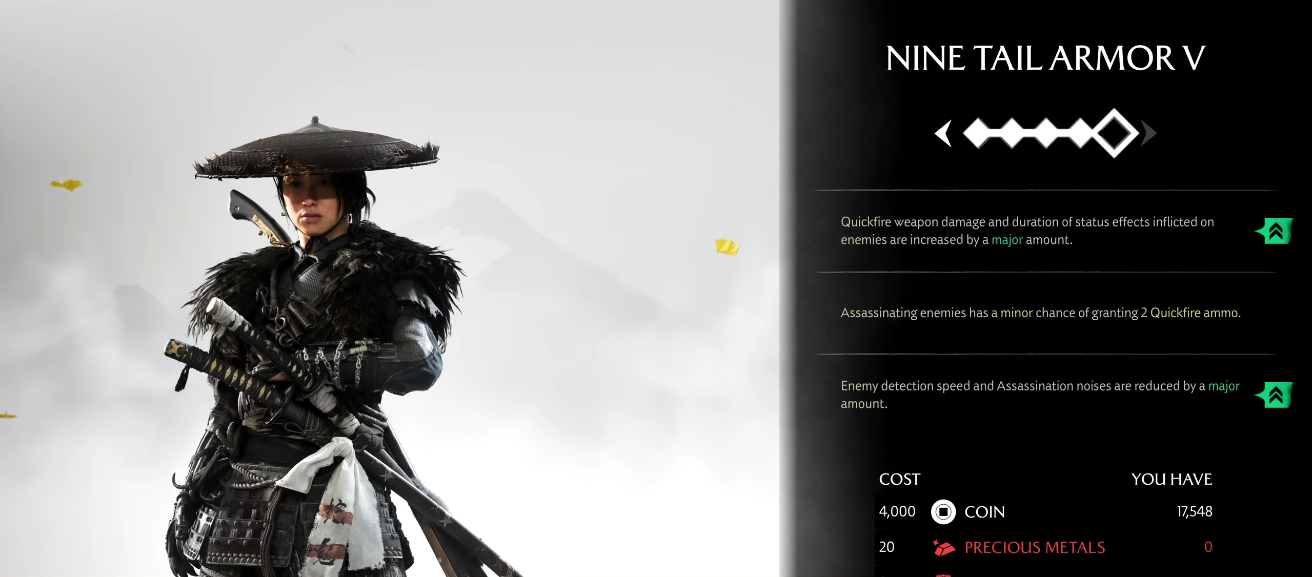 The Nine Tail Armor will have its stealth and quickfire capabilities improved. Quickfire weapon damage and duration of status effects inflicted by them are increased by a major amount.