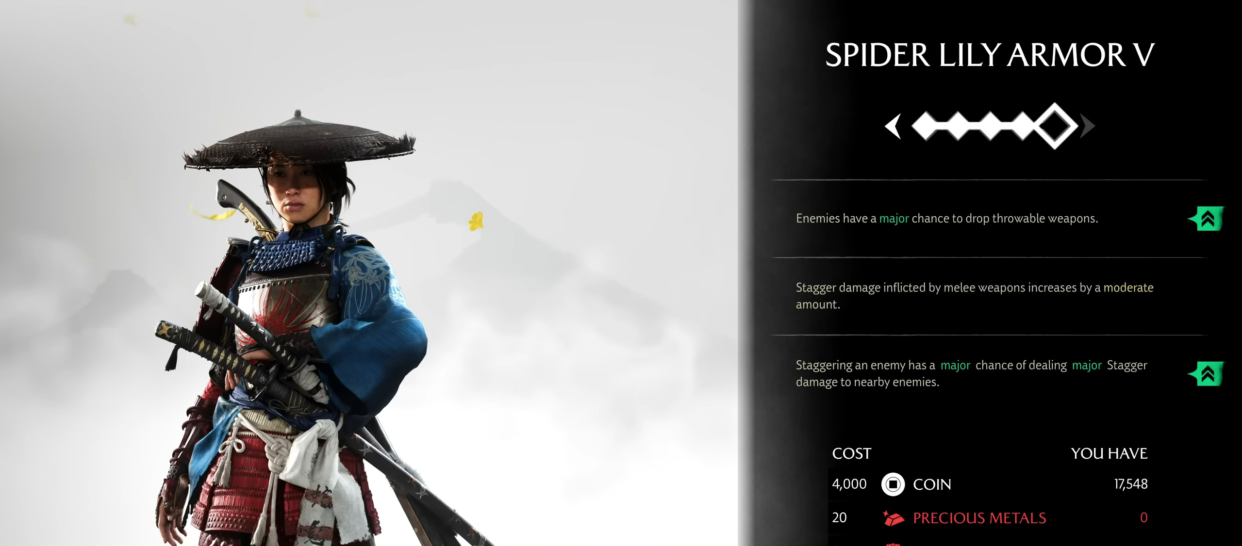 The Spider Lily Armor will now grant a major chance for enemies to drop throwable weapons. Additionally, staggering enemies will have a major chance to deal major stagger damage against nearby enemies.
