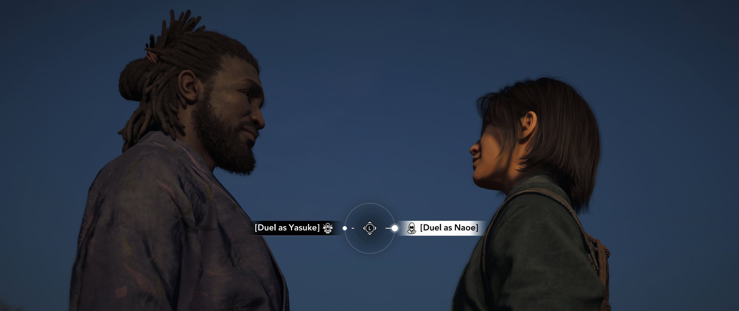 You will not be using any of your armor or real weapons for this duel. If you chose Naoe, you’ll need to dodge all of Yasuke’s attacks as they’re all unblockable.